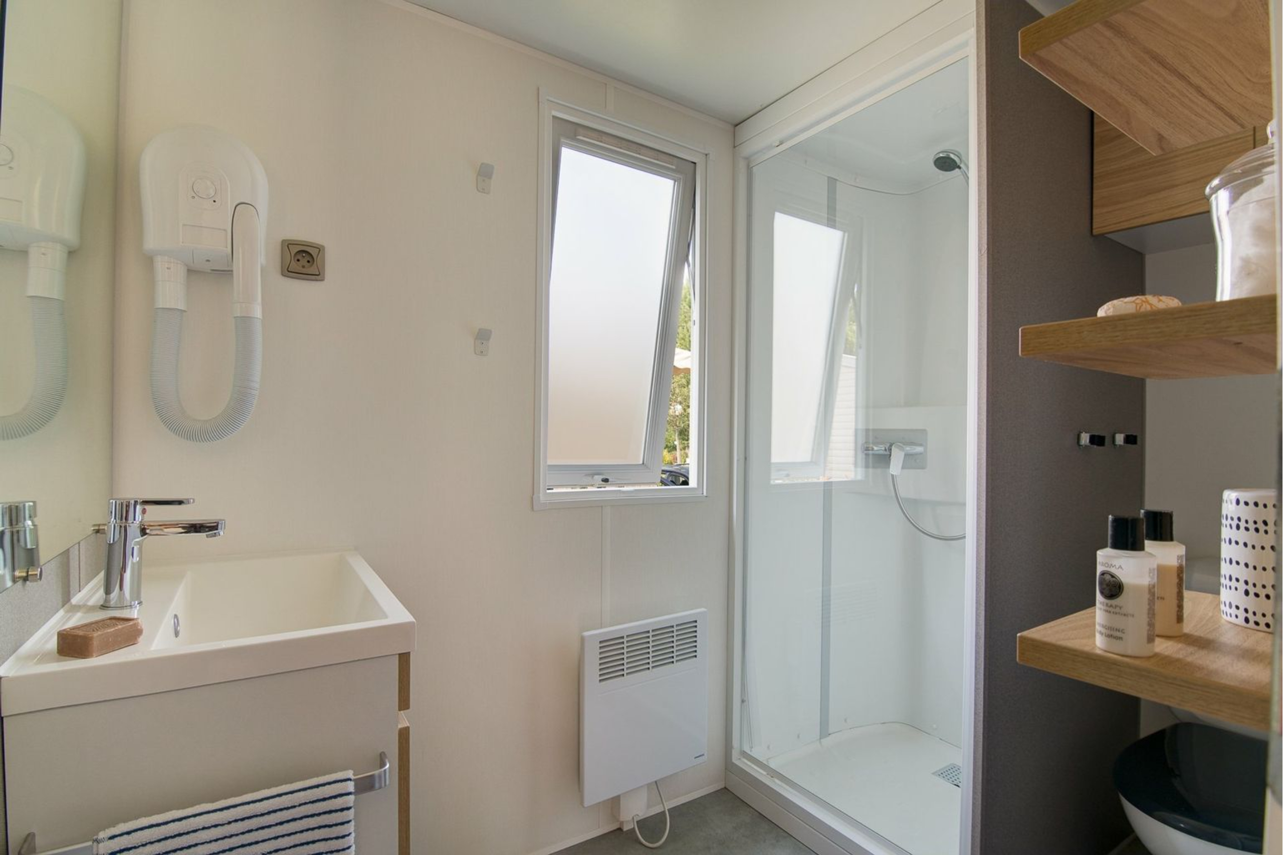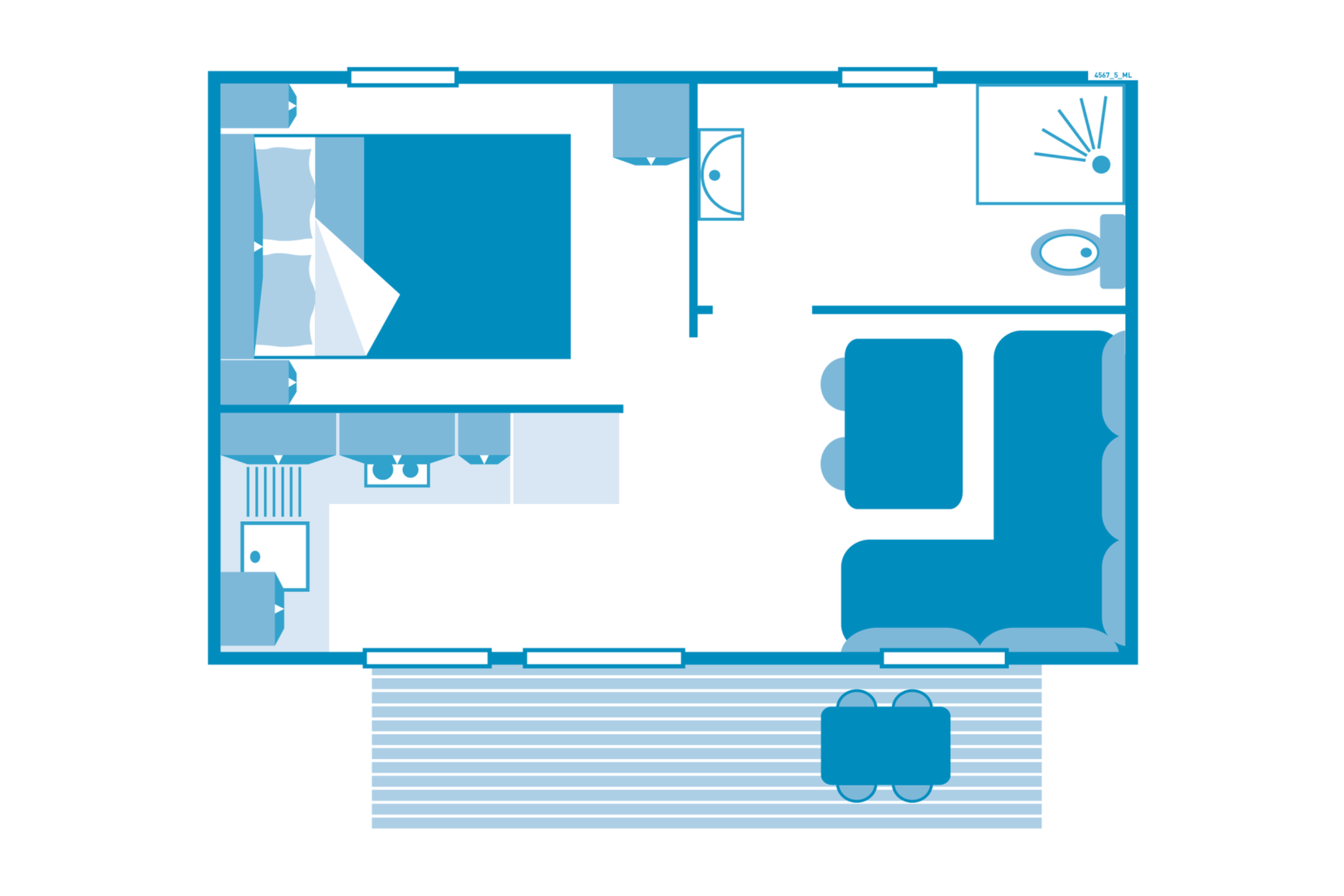 Deze gezellige, volledig uitgeruste mobile home biedt de perfecte setting voor een comfortabel en ontspannen verblijf. Geniet samen van een rustig ontbijt op het houten terras buiten - de ideale manier om de dag rustig te beginnen.