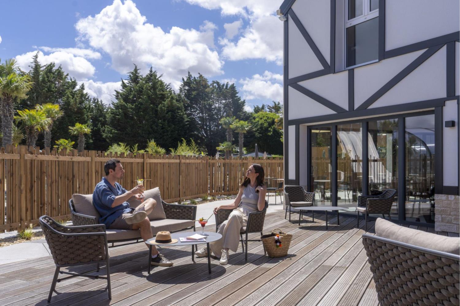 Half overdekt houten terras om te genieten van milde Normandische avonden