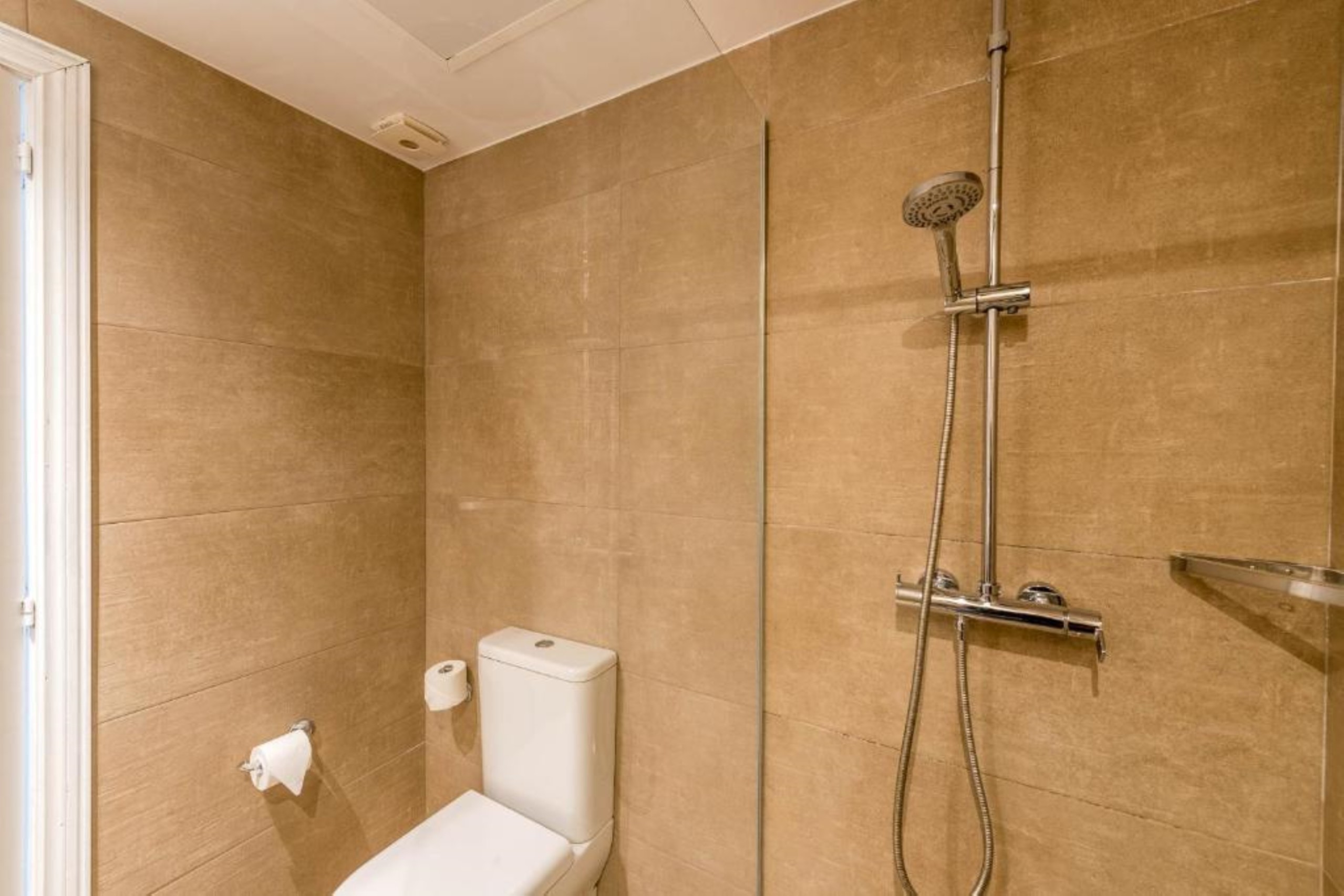 De badkamer heeft een ligbad voor een ontspannend bad, met een apart toilet voor extra gemak.