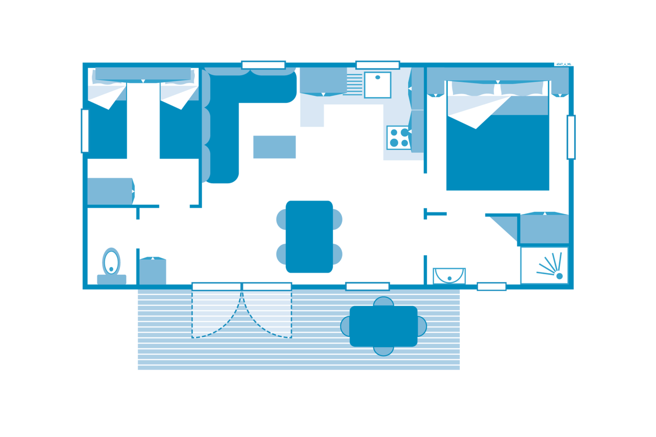 Het slaapgedeelte is zorgvuldig ingedeeld, met een hoofdslaapkamer voorzien van een ruim tweepersoonsbed van 160 × 200 cm en een kledingkast, en een tweede slaapkamer die perfect is voor kinderen, met twee eenpersoonsbedden van 80 × 190 cm en eigen kastruimte. De badkamer beschikt over een douche, wastafel en verwarming, aangevuld met een apart toilet.