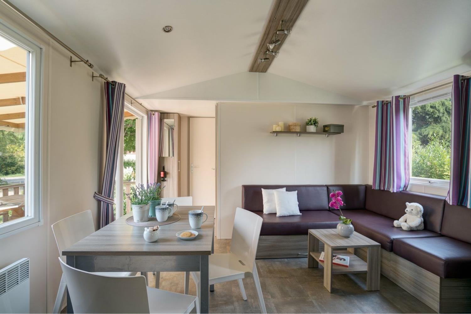 Zodra u binnenstapt, komt u in een gezellige leefruimte met een zitbank, tafel en stoelen, een televisie voor ontspannen avonden en verwarming die het hele jaar door comfort biedt. De leefruimte sluit naadloos aan op een volledig uitgeruste keuken.