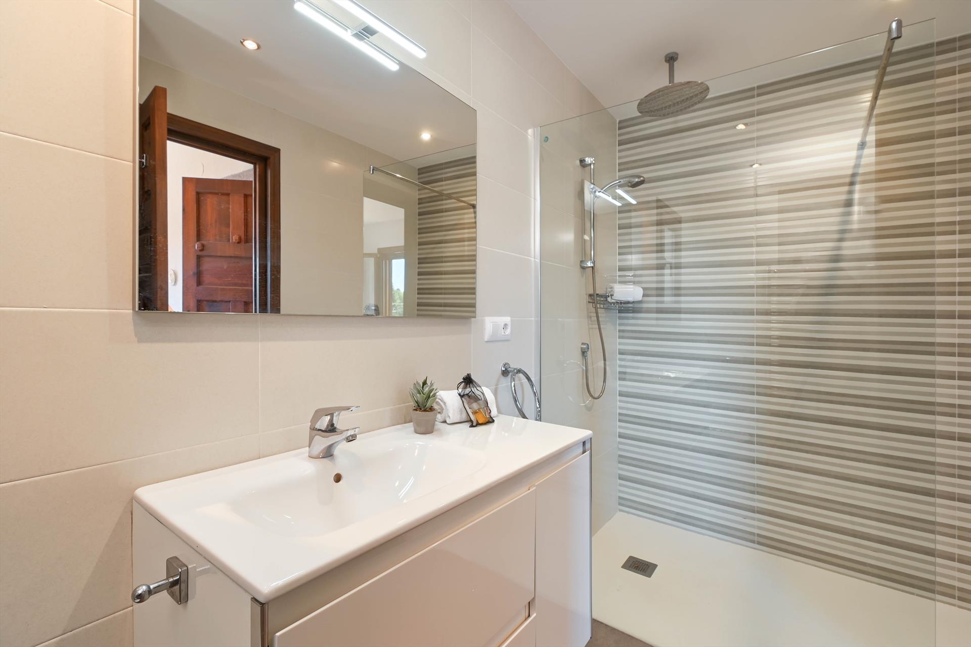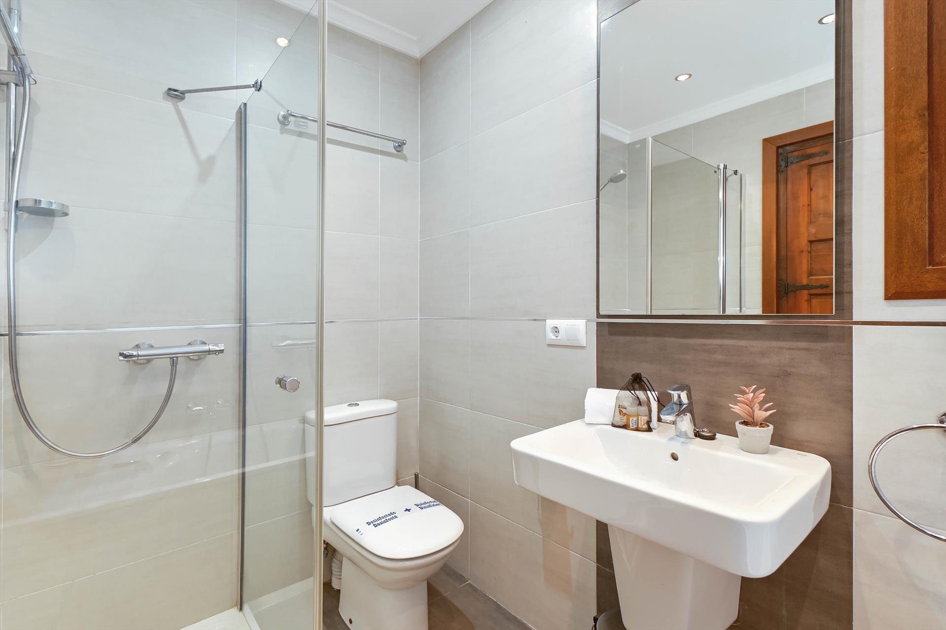 Badkamer met wastafel, douche en toilet