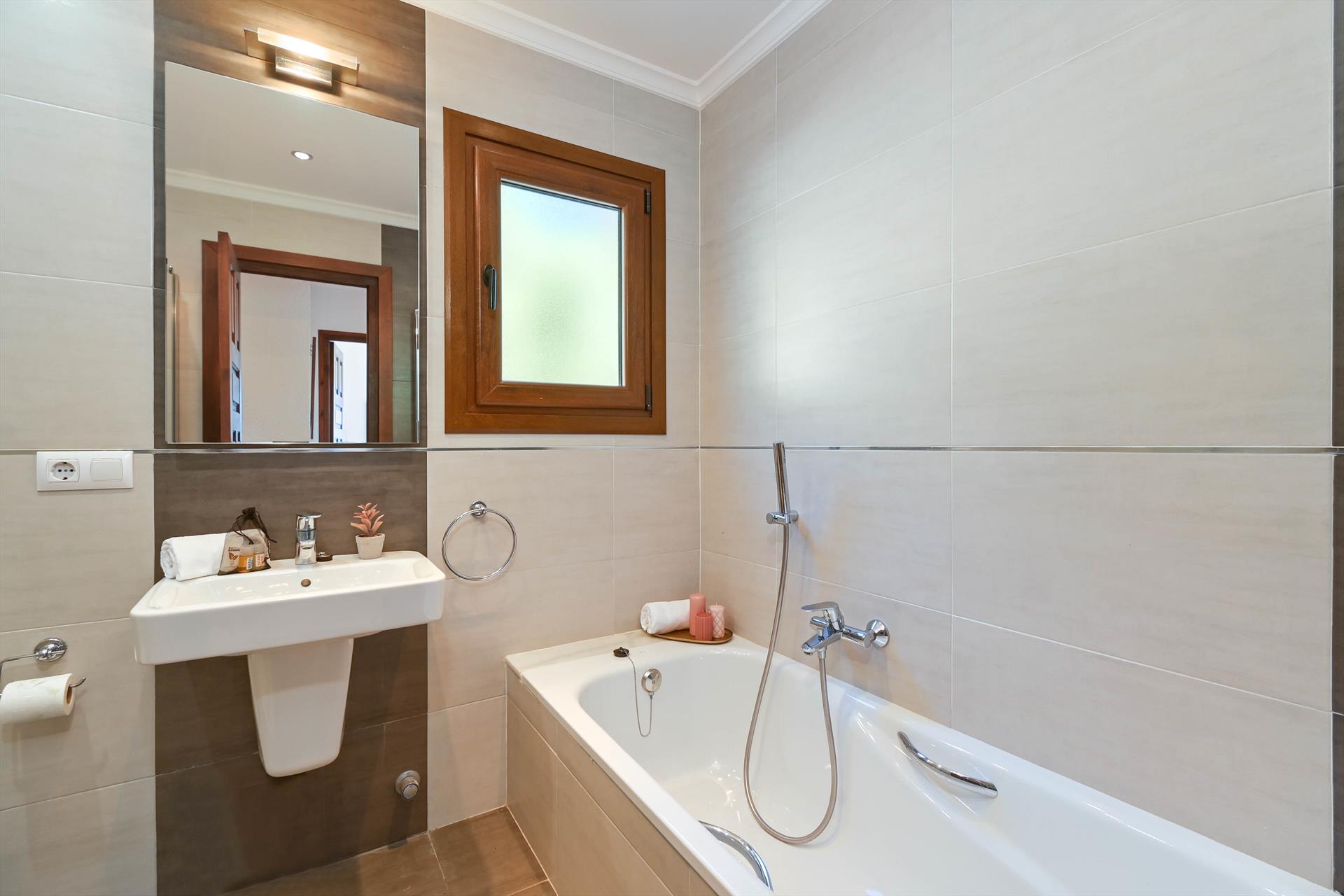 Badkamer met wastafel, bad, douche en toilet