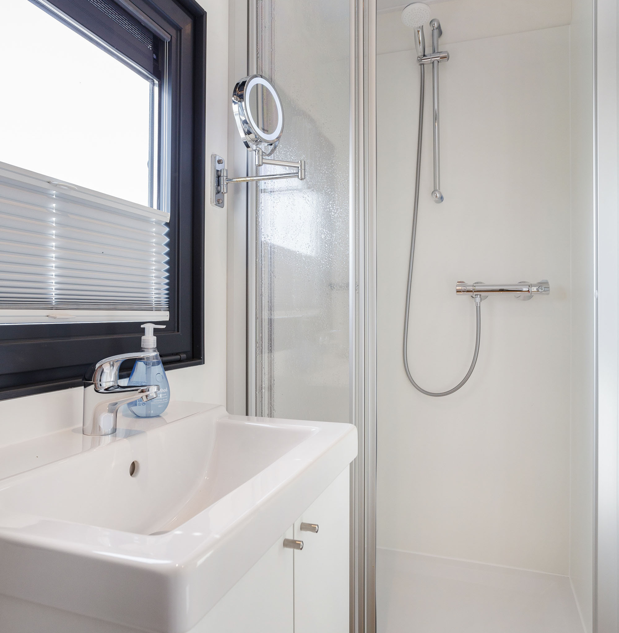 Deze accommodatie heeft twee slaapkamers. De grote slaapkamer is voorzien van een tweepersoonsbed (160x200 cm) en een kast om kleding of spullen in op te bergen. De tweede slaapkamer is ingericht met een stoer geschakeld stapelbed (80x200 cm) en kledingkast. Voor de kleinste gasten is er een opvouwbaar babybed (60x120 cm) en tevens een kinderstoel aanwezig. De moderne badkamer is voorzien van een douche, toilet en badkamermeubel met spiegel.