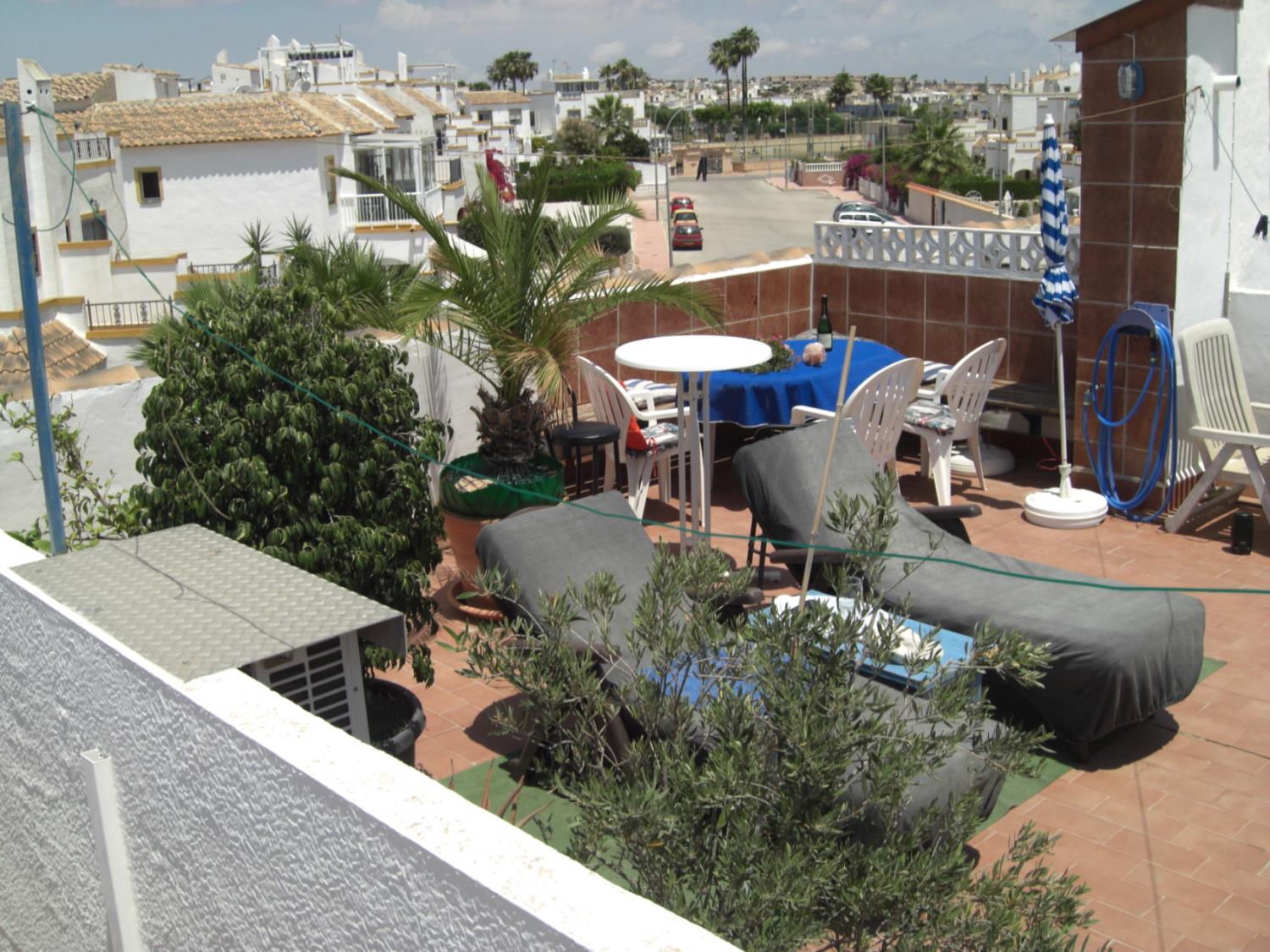 Het balkon is gemeubileerd met een tafel, stoelen, een parasol en een zonwering. Buitentrap leidt naar een ruim dakterras van 50 m², met tuinmeubilair, ligstoelen, stoelen, een hoekbank, een parasol en bomen, allemaal met een prachtig uitzicht op zee. Beddengoed en handdoeken zijn aanwezig.