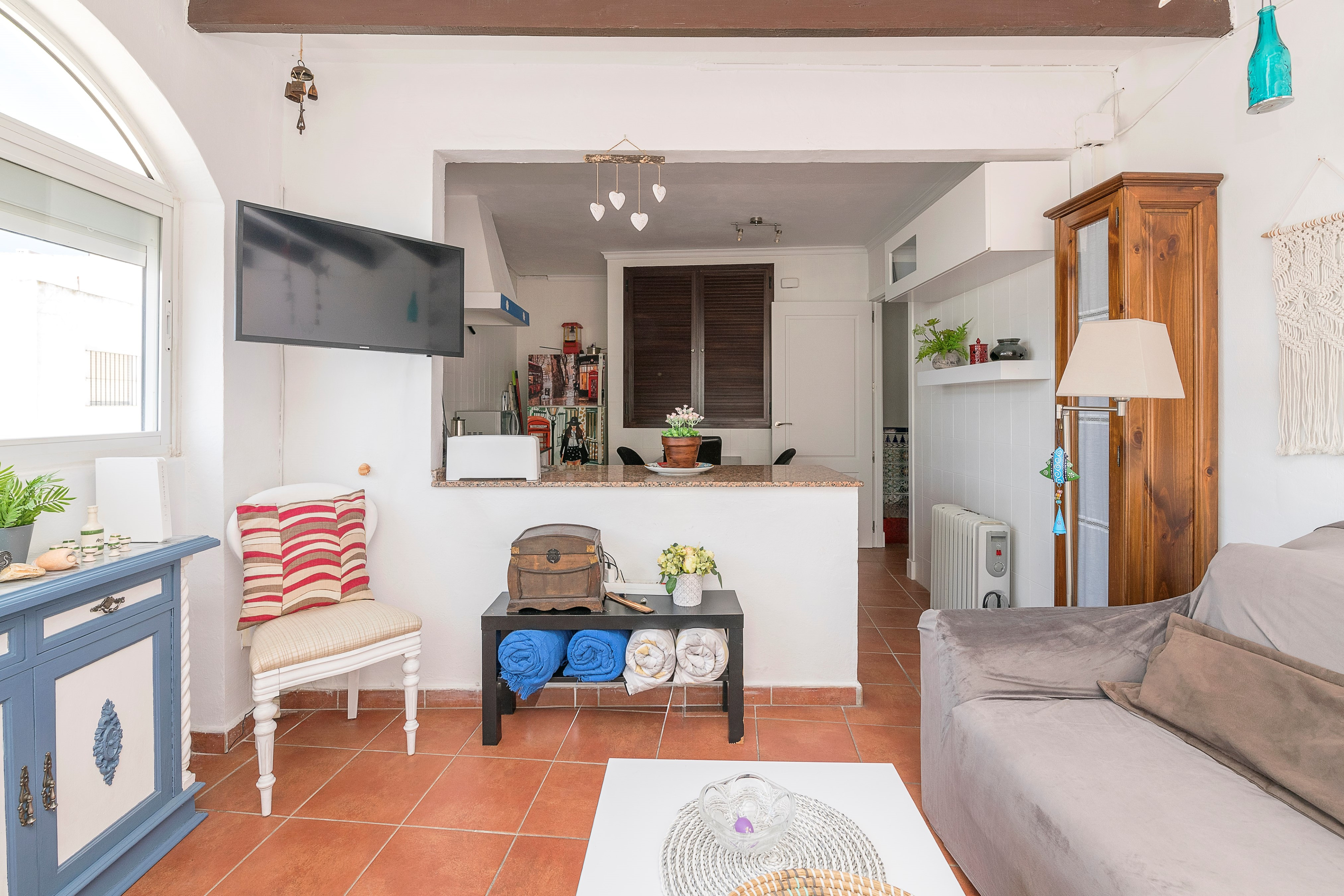 Gelegen op de eerste verdieping zonder lift, is de woonkamer uitgerust met een Smart TV en heeft u direct toegang tot het terras om te genieten van een heerlijk ontbijt of om te ontspannen na een lange dag sightseeing in de omgeving. Het gasfornuis beschikt over alle benodigde keukengerei zodat u comfortabel kunt koken en zich thuis kunt voelen. Er is ook een wasmachine en een strijkijzer. Als het tijd is om te slapen zijn er twee slaapkamers met elk een tweepersoonsbed. Een badkamer met douche maakt uw verblijf compleet.