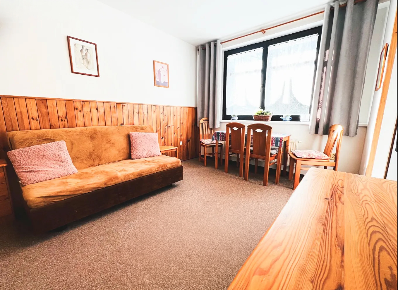 In de hal is een grote kledingkast, kluisje en stofzuiger. De woonslaapkamer is gezellig ingericht met massieve, grenen meubelen, een comfortabele slaapbank voor twee personen, twee grote bedden, satelliet-TV, DVD-speler en radio. Er kan eventueel een kinderbedje worden bijgeplaatst. De aparte, volledig ingerichte keuken is voorzien van een broodrooster, kooktoestel met 2 elektrische kookplaten, magnetron, koffiezetapparaat, waterkoker en koelkast. In de badkamer is een douche, wastafel, föhn en droogrek. De was kunt u tegen betaling laten verzorgen via de receptie. Het hele gebouw is centraal verwarmd. In de verbindingsgang tussen de twee gebouwen is ruimte om fietsen e.d. op te bergen. Het interieur kan afwijken van de foto's.
