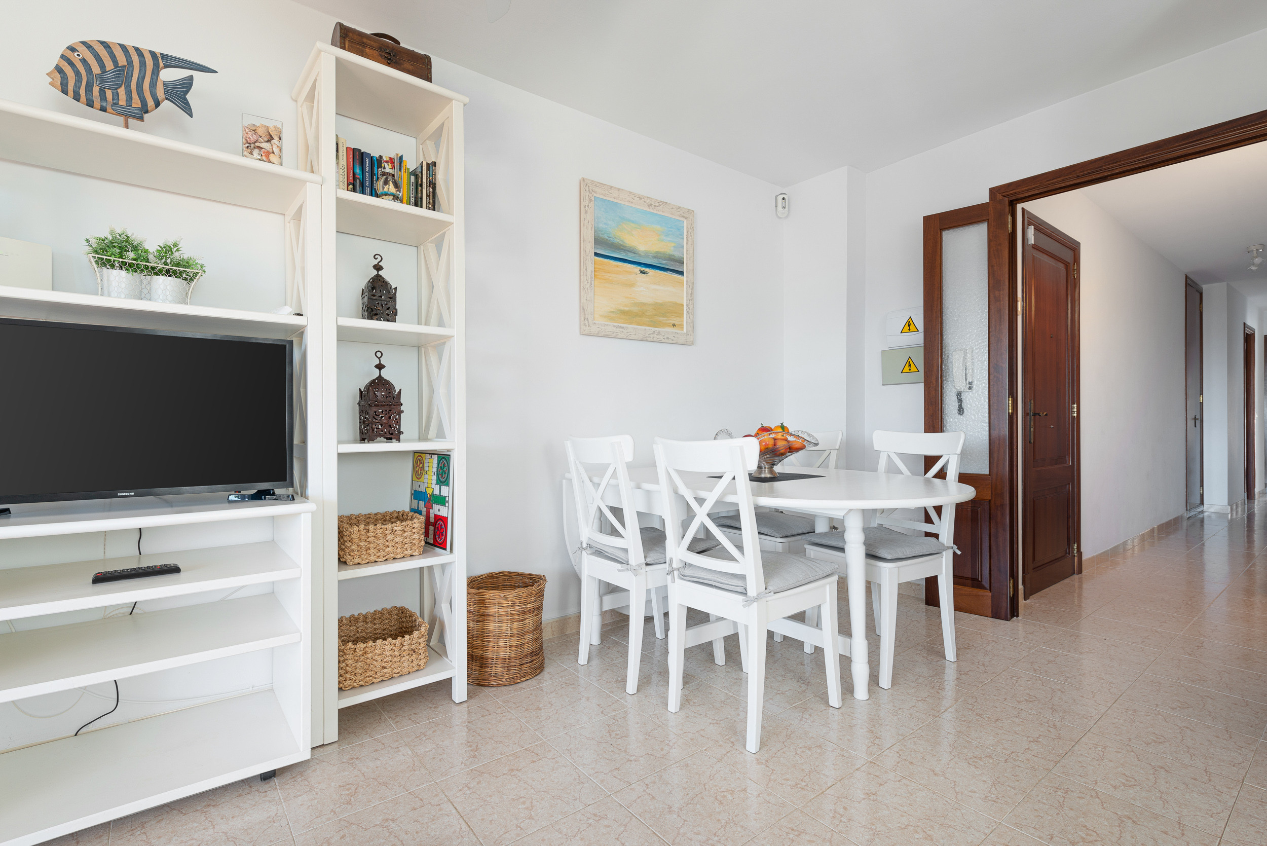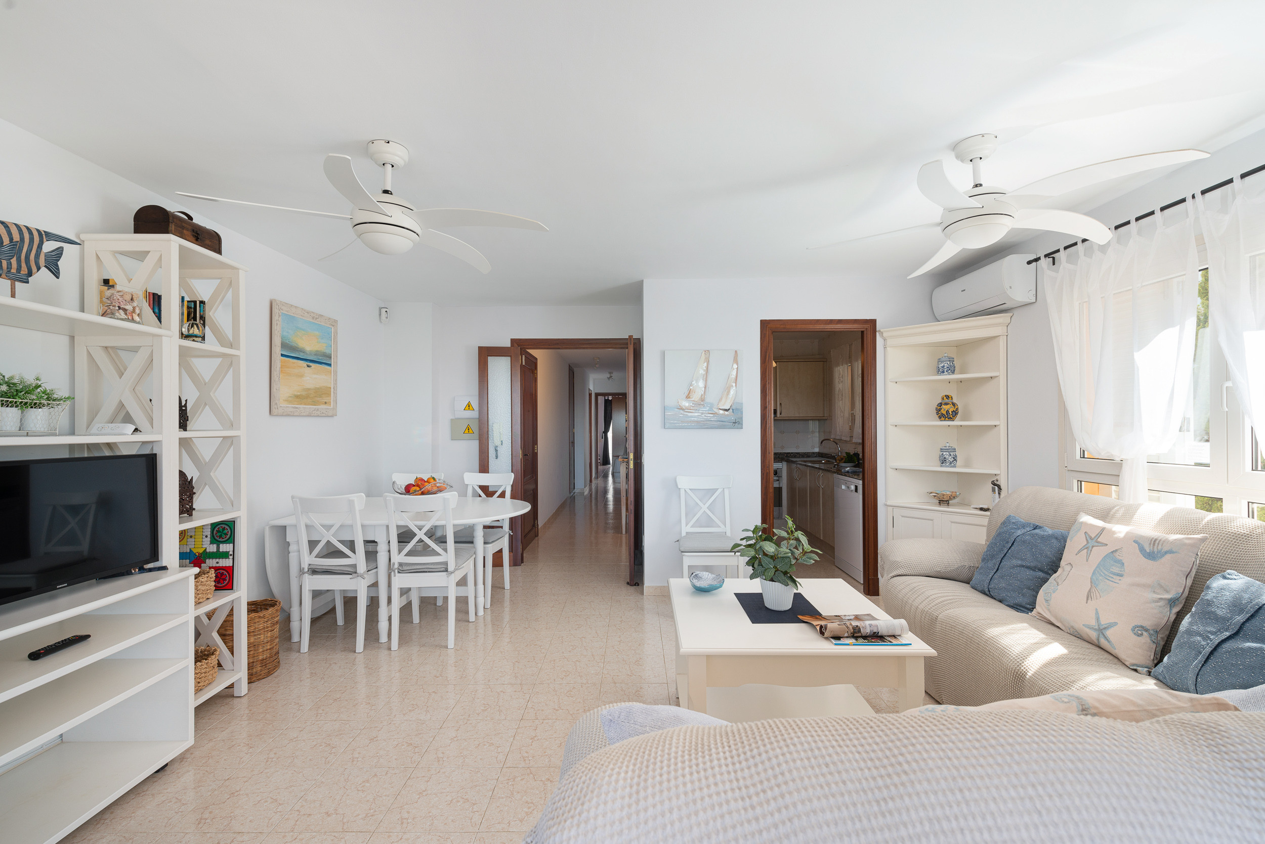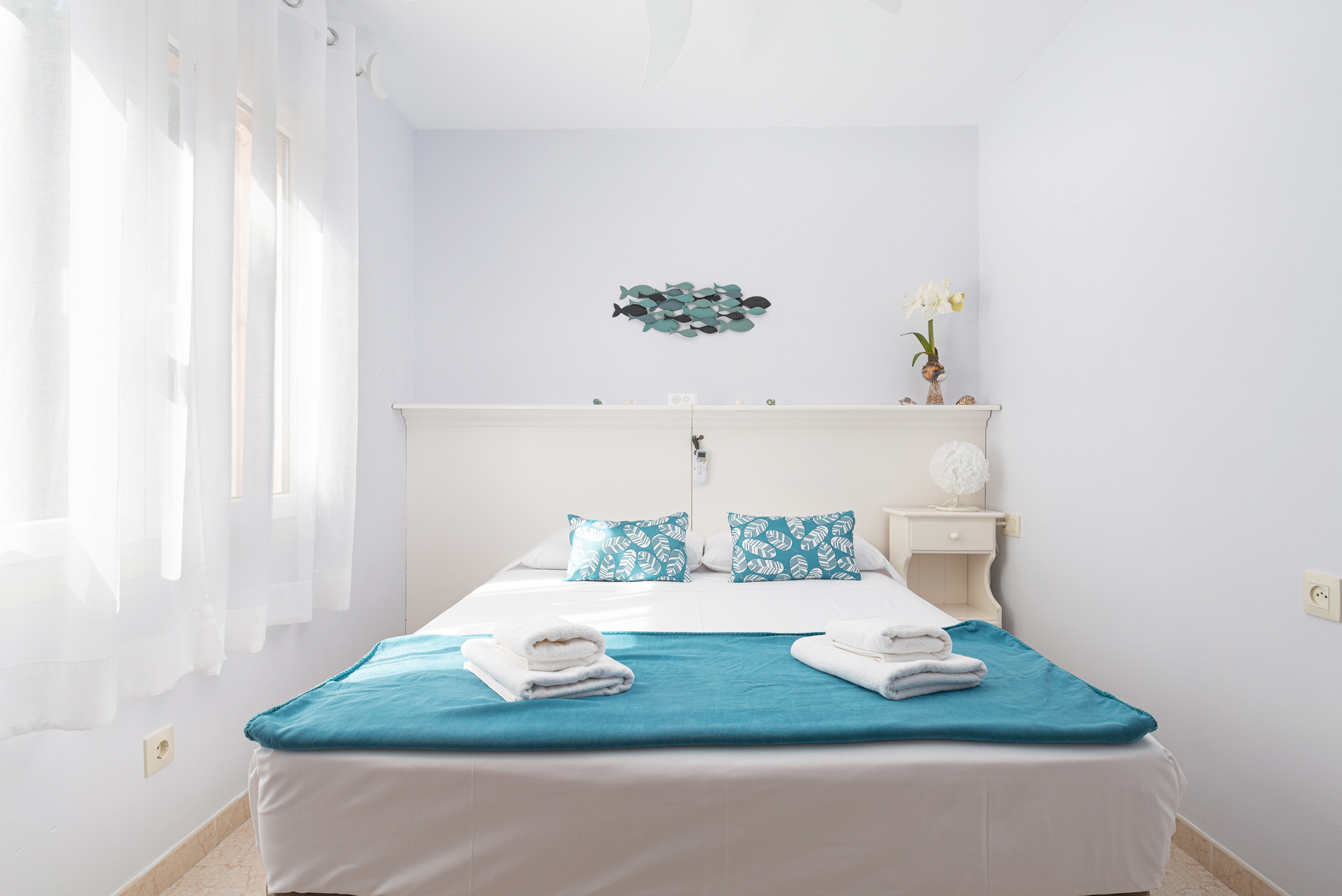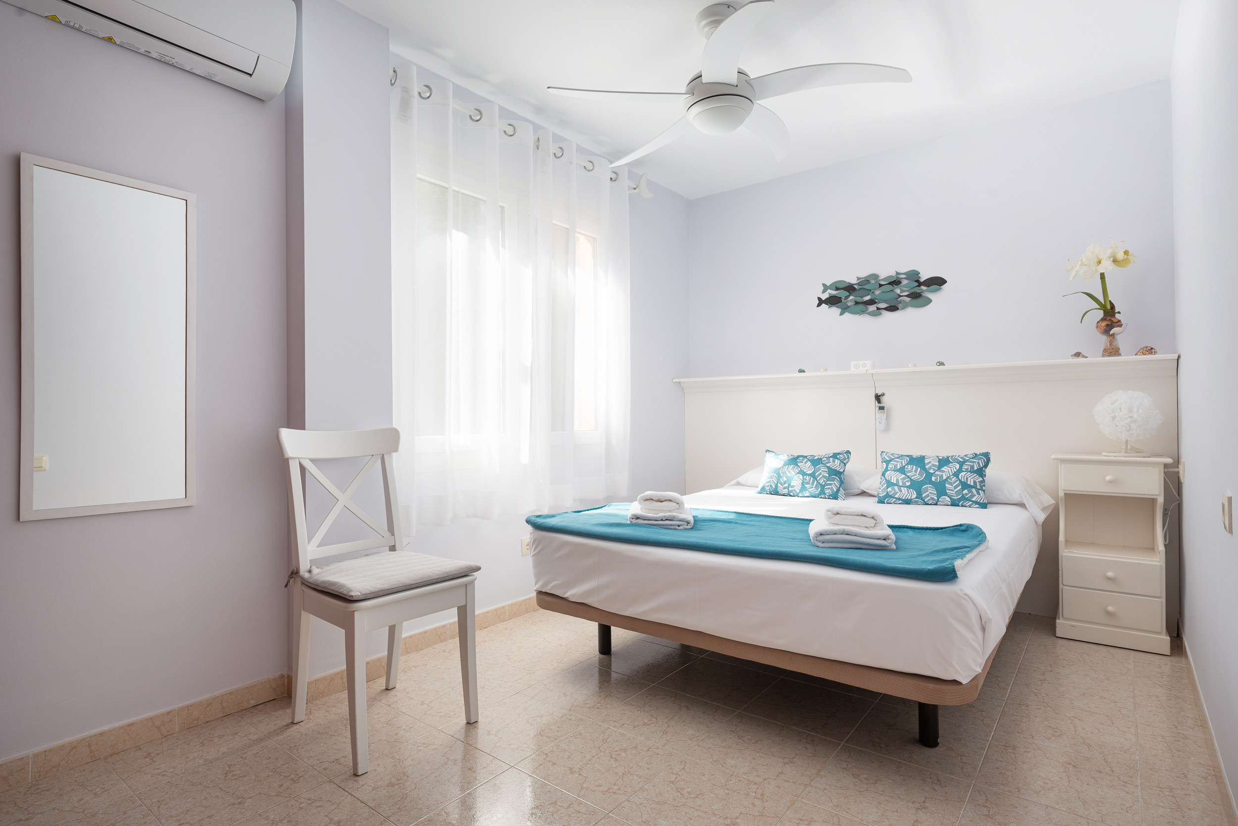 Dit appartement op de eerste verdieping, zonder lift, heeft een gezellige woon-eetkamer waar u televisie kunt kijken, een boek kunt lezen of zelfs met zijn allen kunt eten. Direct daarna is er een ingerichte keuken met een keramische kookplaat. De wasruimte is voorzien van een wasmachine, een strijkijzer en een strijkplank. Voor uw rust zijn er drie slaapzalen, waarvan twee met een tweepersoonsbed en een kledingkast en de derde met een onderschuifbed. Eén van de twee eerste kamers heeft een en-suite badkamer met ligbad. Een andere badkamer met douche bedient het hele huis. Er is airconditioning in de woonkamer en in alle 3 de slaapkamers. Er is beschikbaarheid voor een kinderbedje en een kinderstoel.
