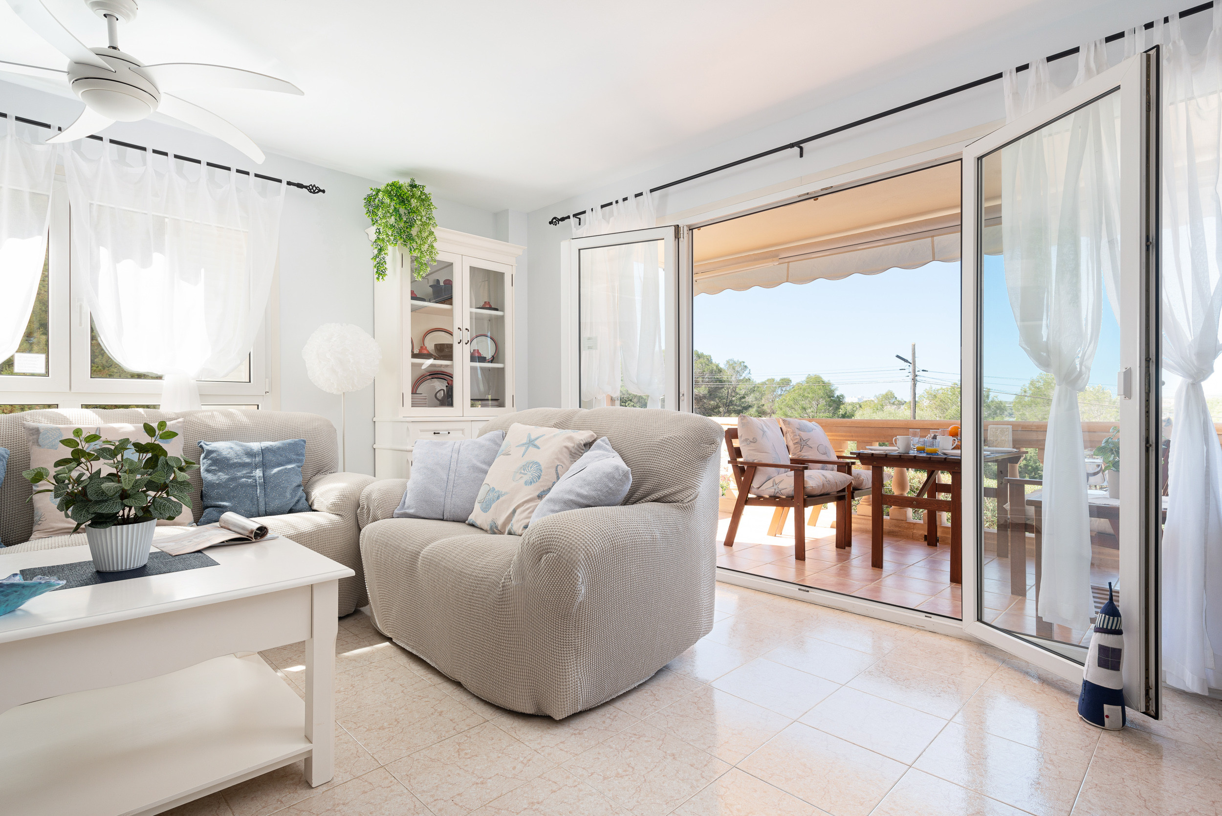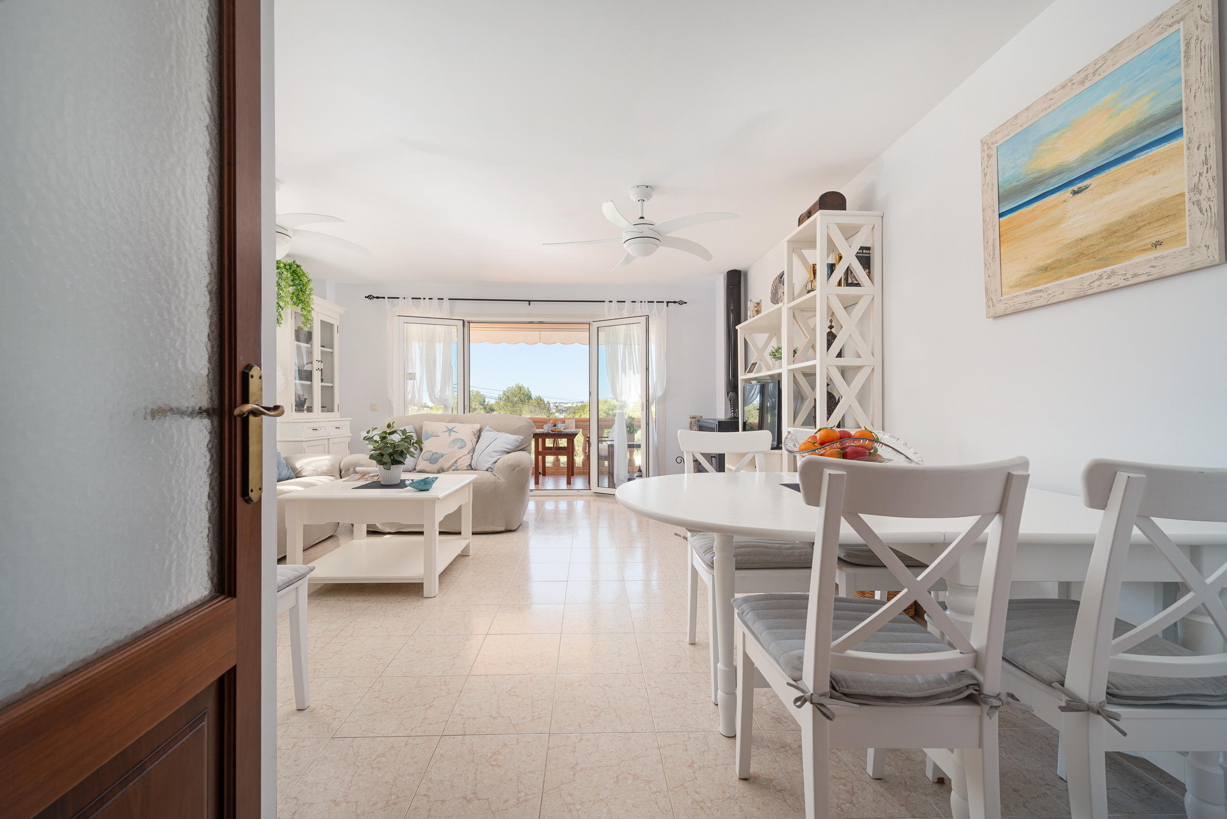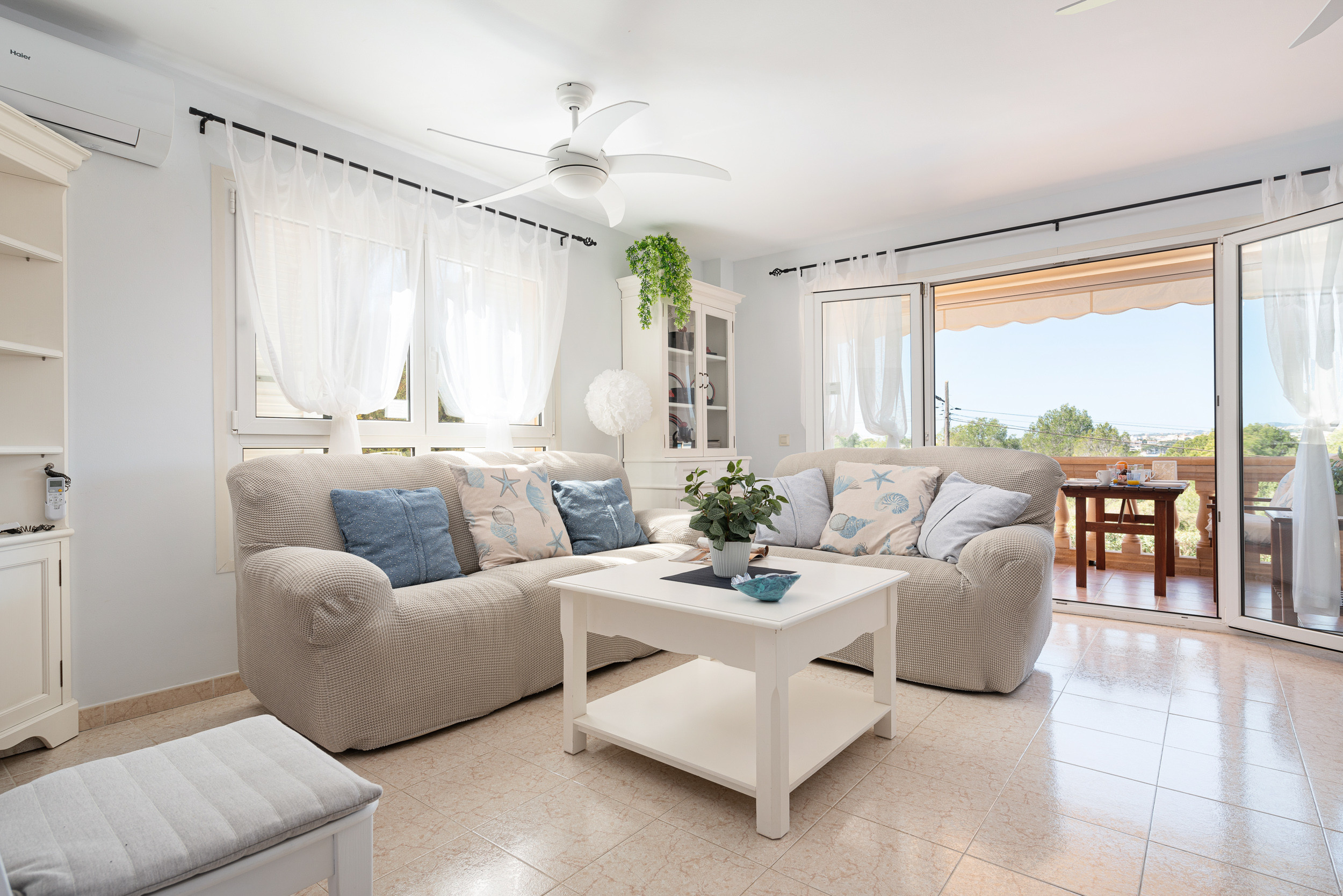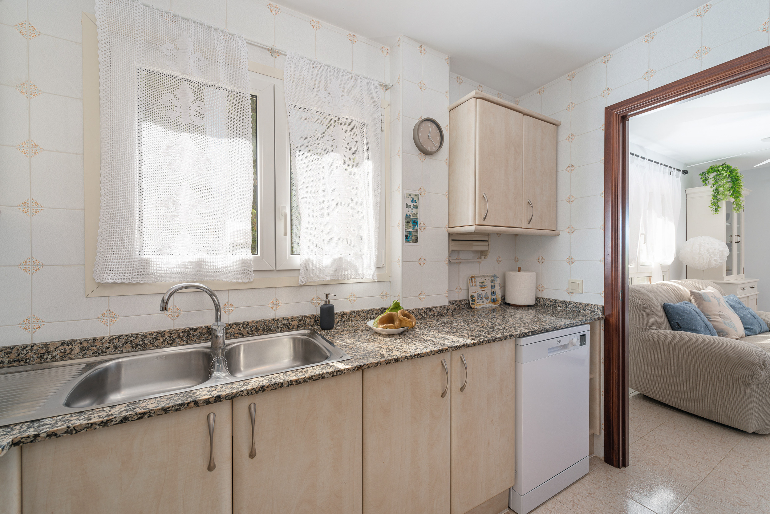 Dit appartement op de eerste verdieping, zonder lift, heeft een gezellige woon-eetkamer waar u televisie kunt kijken, een boek kunt lezen of zelfs met zijn allen kunt eten. Direct daarna is er een ingerichte keuken met een keramische kookplaat. De wasruimte is voorzien van een wasmachine, een strijkijzer en een strijkplank. Voor uw rust zijn er drie slaapzalen, waarvan twee met een tweepersoonsbed en een kledingkast en de derde met een onderschuifbed. Eén van de twee eerste kamers heeft een en-suite badkamer met ligbad. Een andere badkamer met douche bedient het hele huis. Er is airconditioning in de woonkamer en in alle 3 de slaapkamers. Er is beschikbaarheid voor een kinderbedje en een kinderstoel.