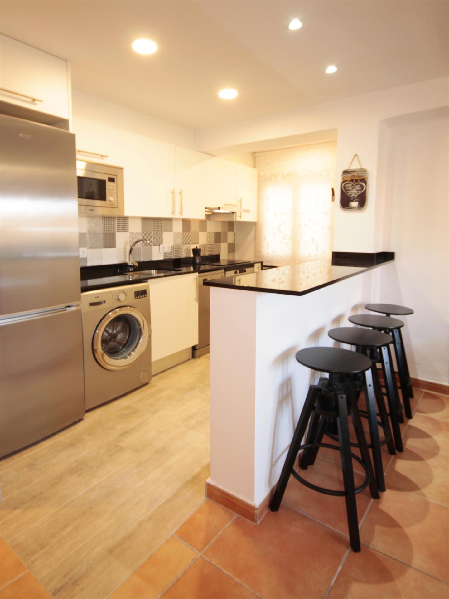• open keuken met elektrische kookplaat, elektrische oven, magnetron, vaatwasser, koel-vriescombinatie, koffiezetapparaat, waterkoker en broodrooster