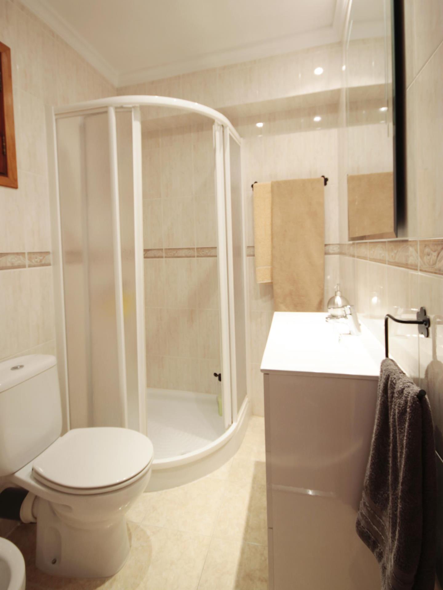• badkamer met enkele wastafel, douche en toilet