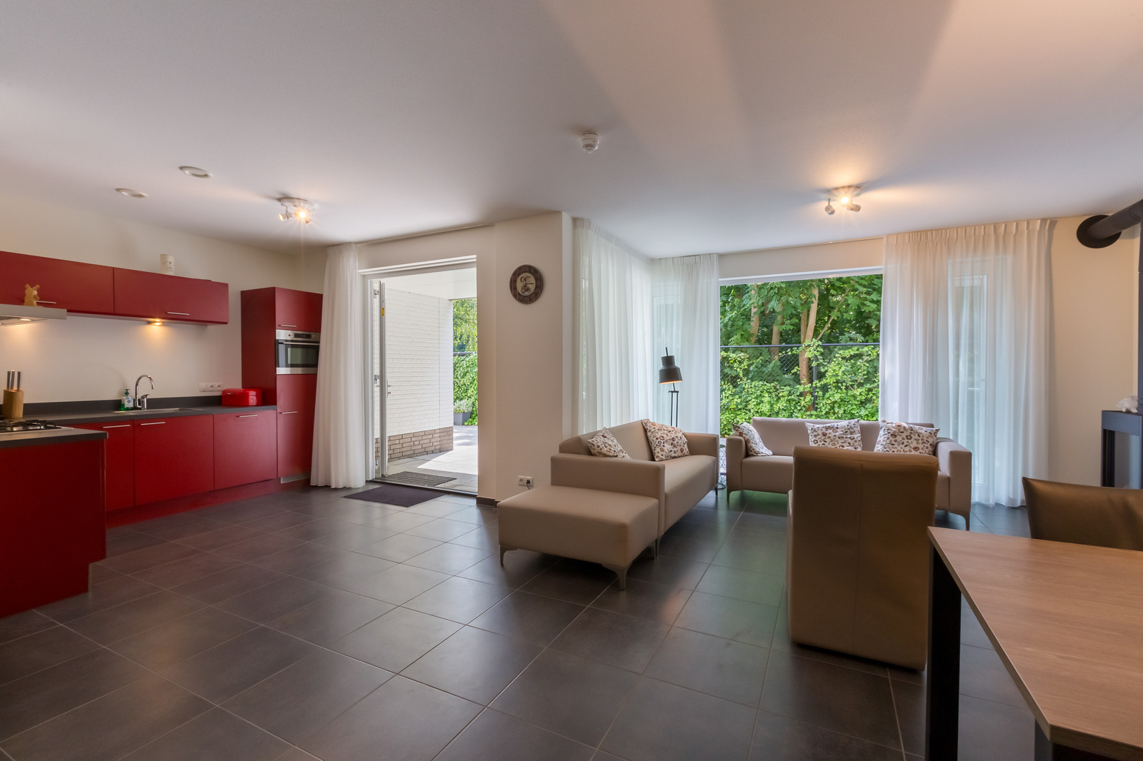 Dit luxe, rolstoelvriendelijke 6-persoons appartement combineert comfort, stijl en toegankelijkheid. De ruime woonkamer is voorzien van een gezellige gashaard, een grote OLED-tv met Netflix en directe toegang tot twee terrassen - een zonnig terras en een schaduwrijk terras - perfect om de hele dag door van het buitenleven te genieten. De moderne open keuken is volledig uitgerust met een combi-oven, vaatwasser, espressomachine en een aangrenzende eethoek met comfortabele stoelen.