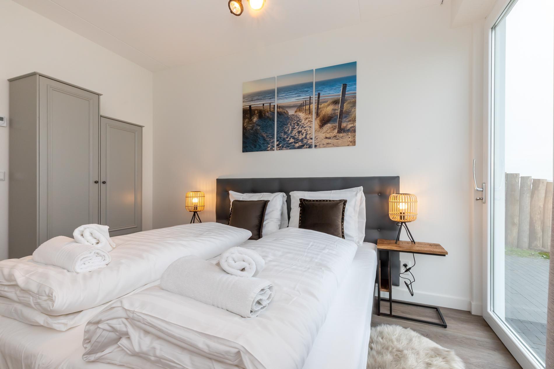 De slaapkamer aan de zeekant, naast de woonkamer, heeft een tweepersoonsbed met twee aparte matrassen (160x200 cm / 2 x 80x200 cm), twee nachtkastjes met verlichting en een kast. De ramen zijn uitgerust met verduisteringsgordijnen, maar je zou bijna geneigd zijn ze open te laten, want vanuit je bed kijk je direct over de Oosterschelde, een unieke ervaring! Zowel vanuit deze slaapkamer als de woonkamer heb je direct toegang tot de op het noorden gerichte tuin met uitzicht over de Oosterschelde.
