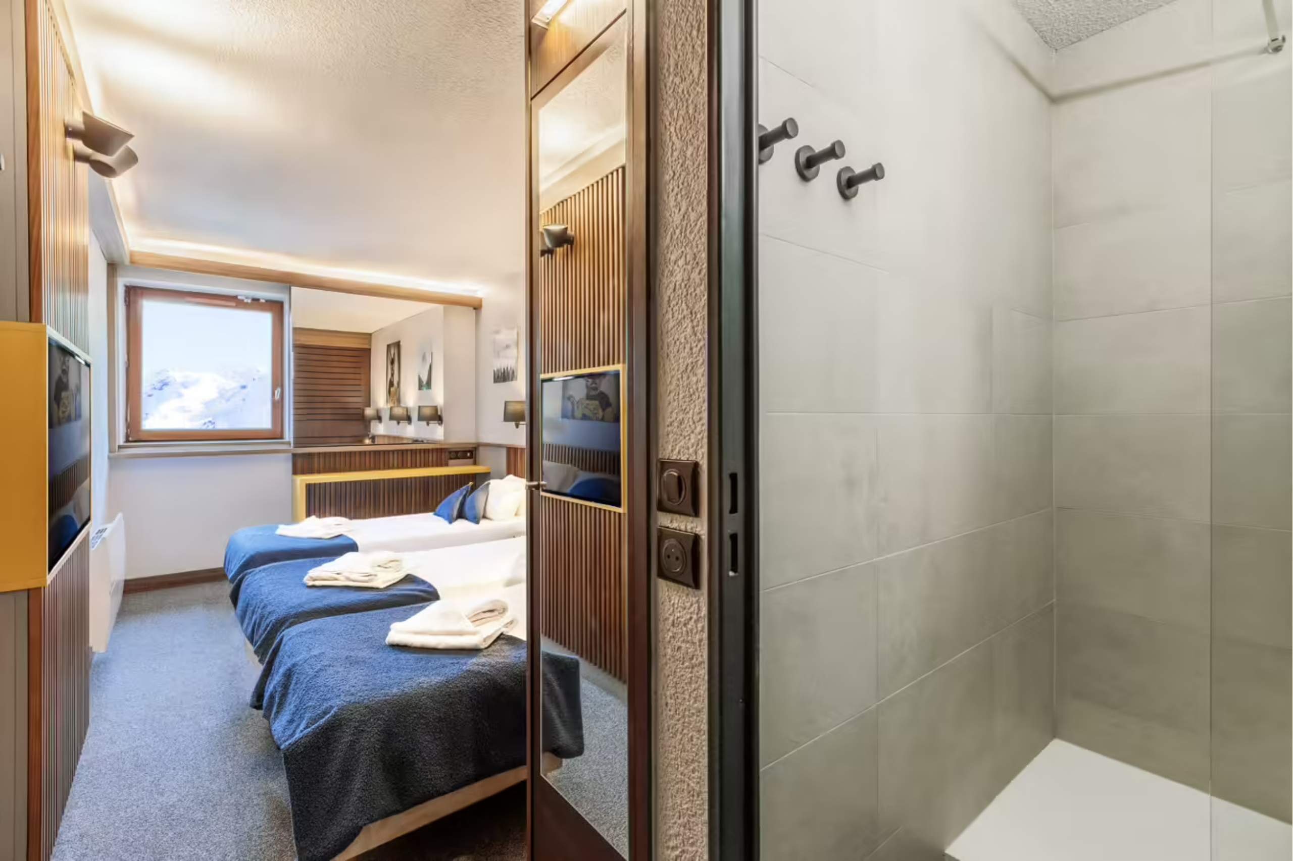 Een woonkamer met 2 bedden. De badkamer heeft een ligbad en een geïntegreerd toilet.