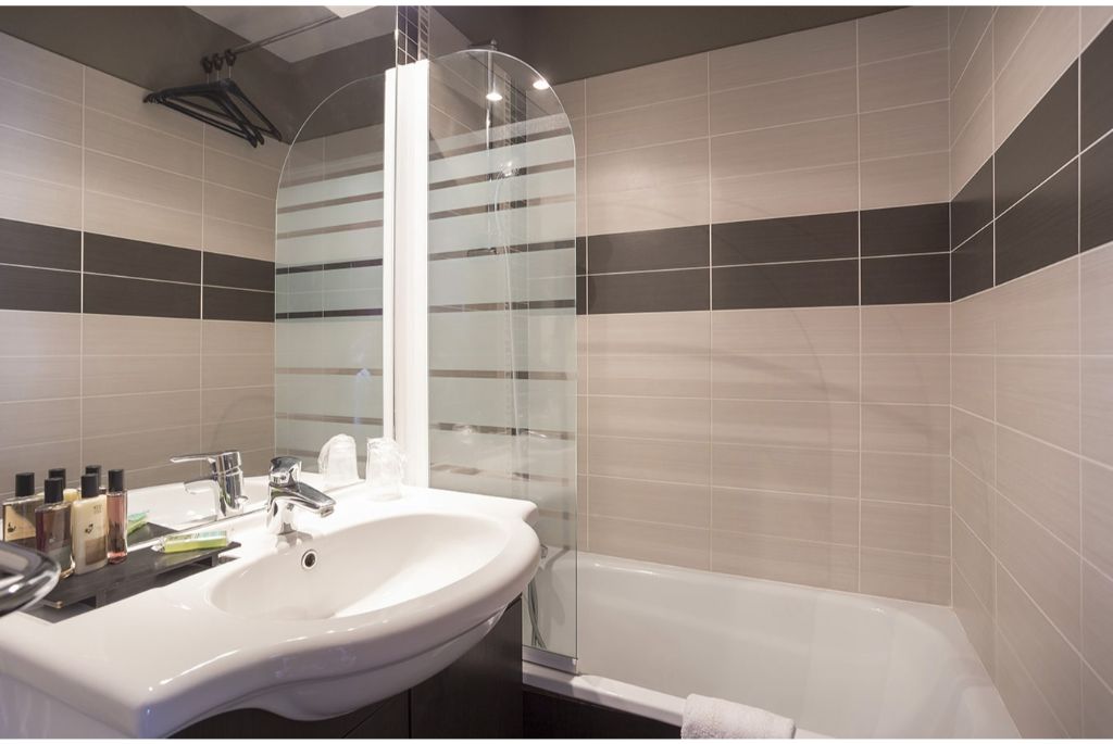 - Badkamer met bad, handdoekradiator en haardroger