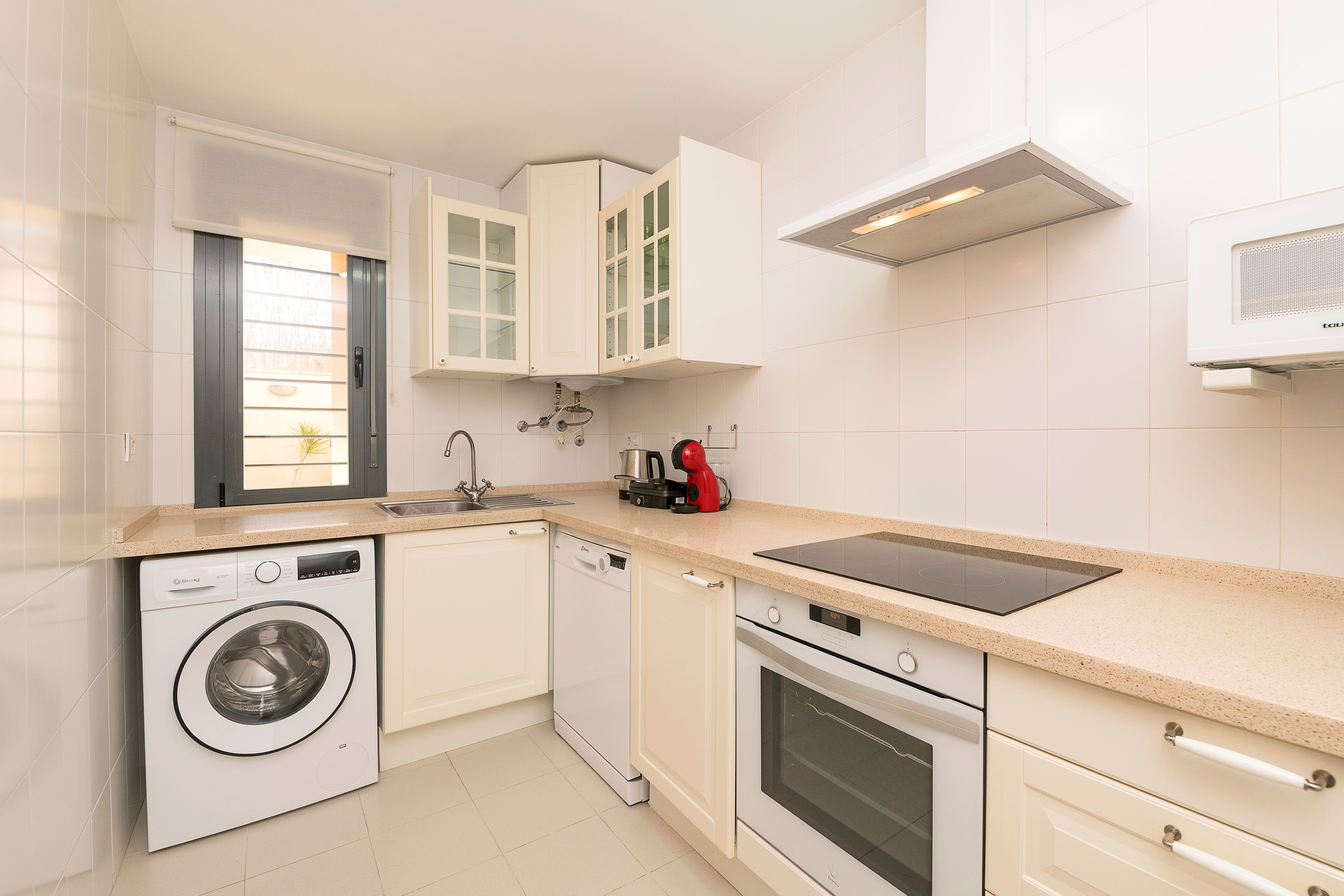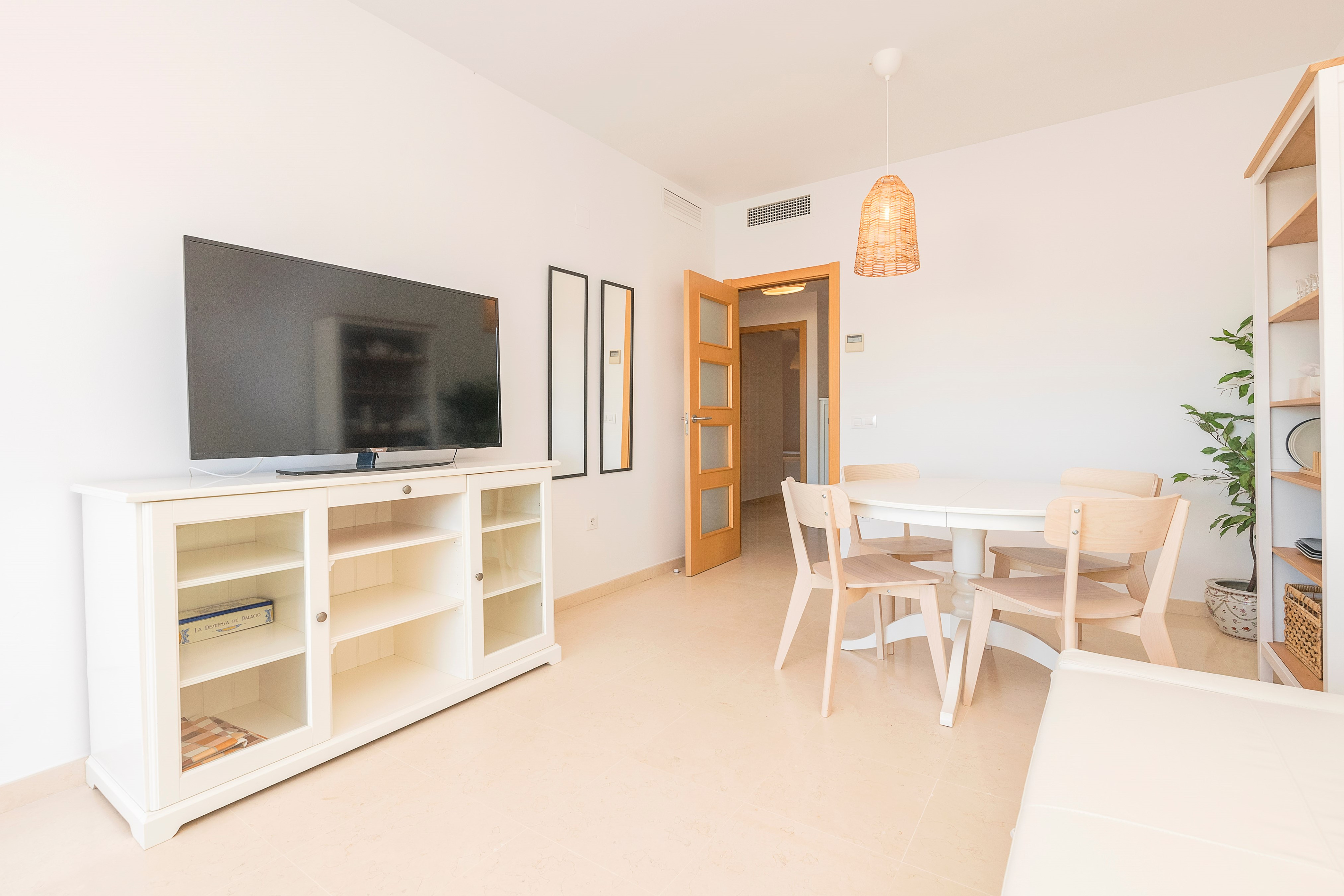 Het interieur van de flat straalt licht en rust uit. De grote hoofdruimte heeft een woonkamer met een Smart TV en AC waar twee gasten op de slaapbank kunnen slapen. Er is ook een eethoek met een tafel en stoelen om te dineren. De keuken met keramische kookplaat is onafhankelijk en beschikt over alle benodigde keukengerei om comfortabel te koken. Er staat een wasmachine, strijkijzer en strijkplank tot uw beschikking. Om uit te rusten vindt u twee slaapkamers, de hoofdslaapkamer met een tweepersoonsbed, directe toegang tot het terras en een eigen badkamer met ligbad, en de tweede slaapkamer met twee eenpersoonsbedden. Nog een badkamer met douche maakt uw verblijf compleet. Als u met uw baby reist, kunnen wij u voorzien van een kinderbedje en een kinderstoel.