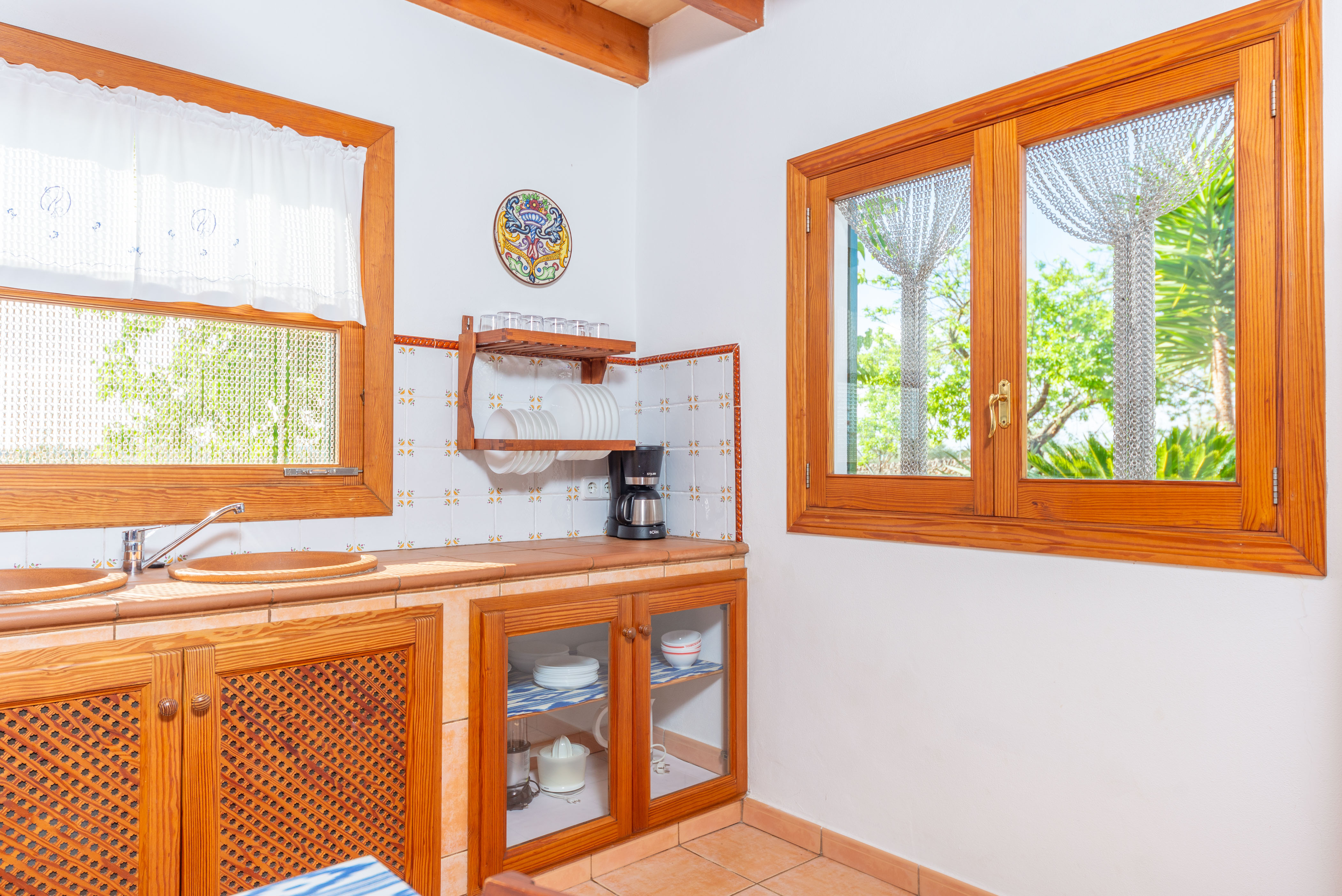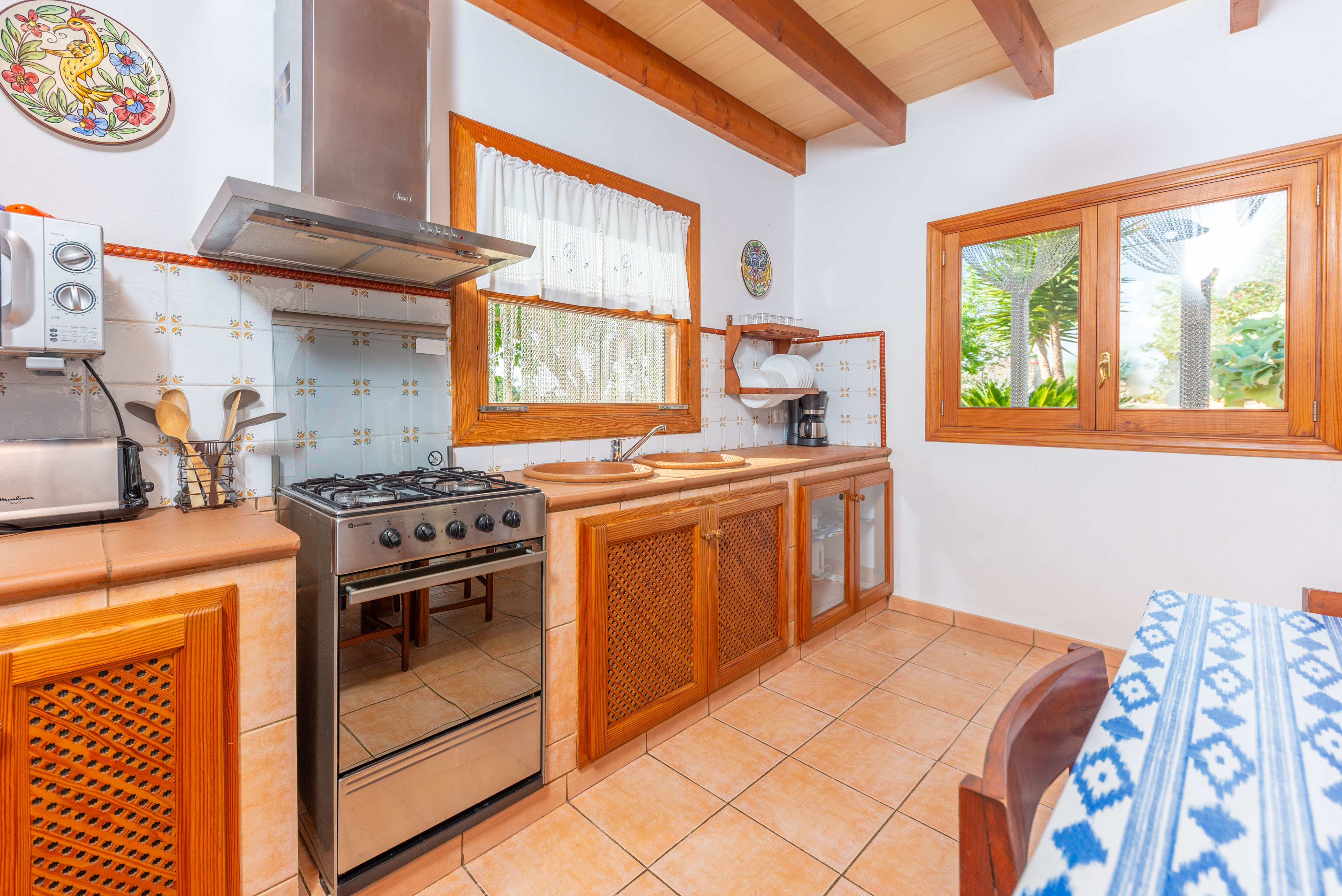 Met een traditionele stijl -zowel binnen als buiten-, gecombineerd met een grote eenvoud en goede smaak, verwelkomt dit fantastische huis u als uw eigen thuis. Als u binnenkomt, vindt u een ruime woonkamer met een bank, twee fauteuils, een salontafel, een televisie met satellietzenders en een oude open haard die nu een decoratief element is met een geweldig karakter. Achter een grote boog komt u in de eetkeuken, perfect om uw lekkerste gerechten op het gasfornuis te bereiden en daar meteen van te genieten. Hier vindt u ook de wasmachine, het strijkijzer en de strijkplank. Er zijn drie slaapkamers, allemaal voorzien van een kledingkast en een ventilator. Een van de slaapkamers heeft een tweepersoonsbed, terwijl de andere twee elk 2 aparte bedden hebben. Ondanks het aantal bedden is het huis ingericht voor 5 personen, maar u kunt het bed kiezen waar u wilt rusten om comfortabeler te zijn. Een kinderbedje en een kinderstoel zijn ook beschikbaar. Tenslotte maken twee badkamers de accommodatie compleet, één met een ligbad en de andere met een douche.