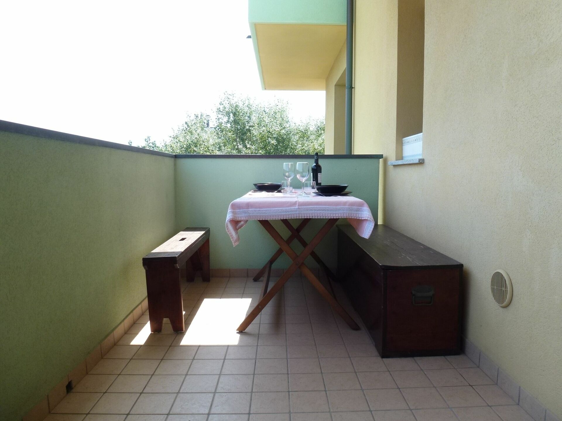 de openslaande deuren van de woonkamer leiden naar het bewoonbare terras met tafel, stoelen en bank om uit eten te gaan