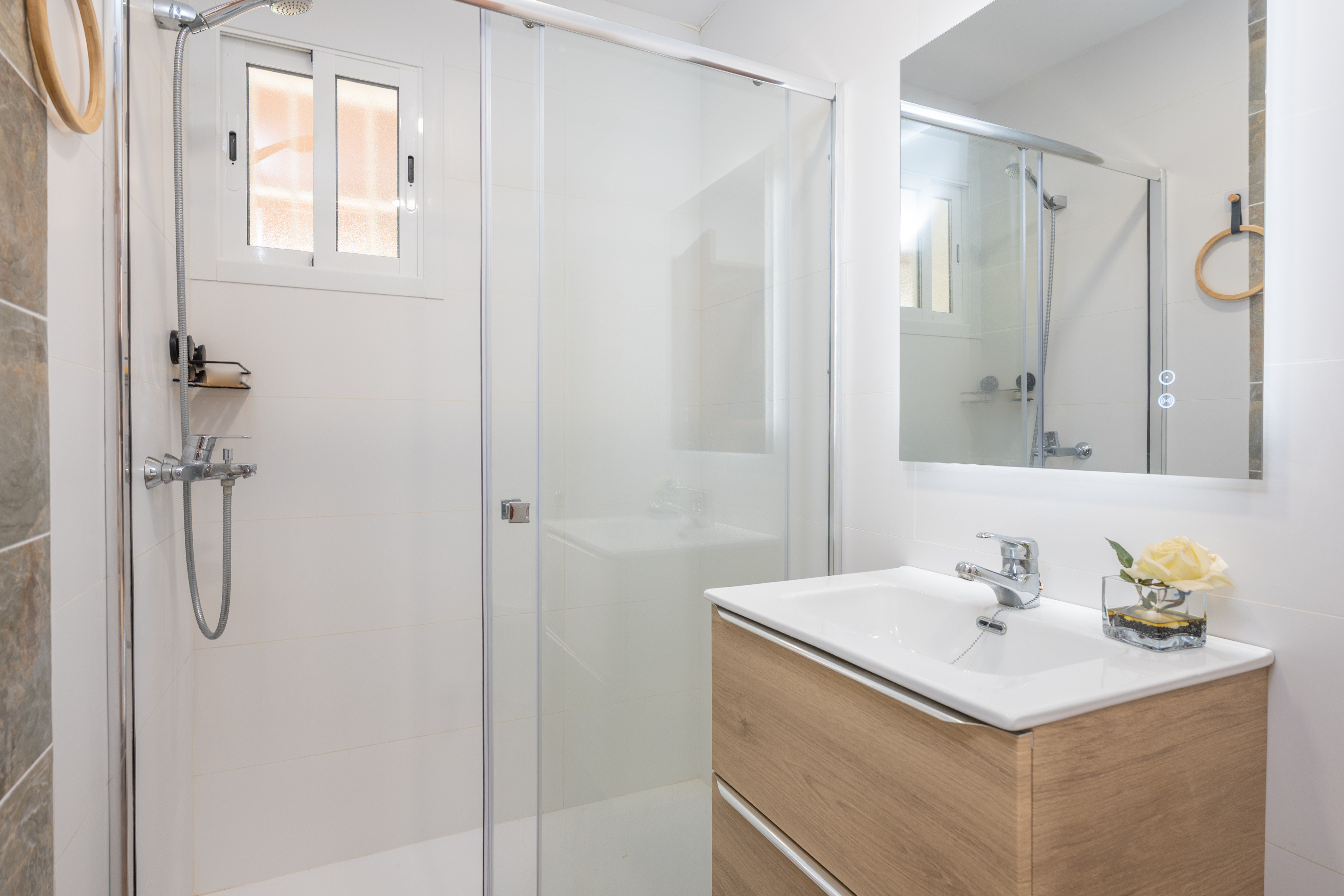 Op de begane grond bevindt zich ook de eerste slaapkamer, met een tweepersoonsbed, airconditioning en inbouwkasten, evenals een moderne badkamer met douche.