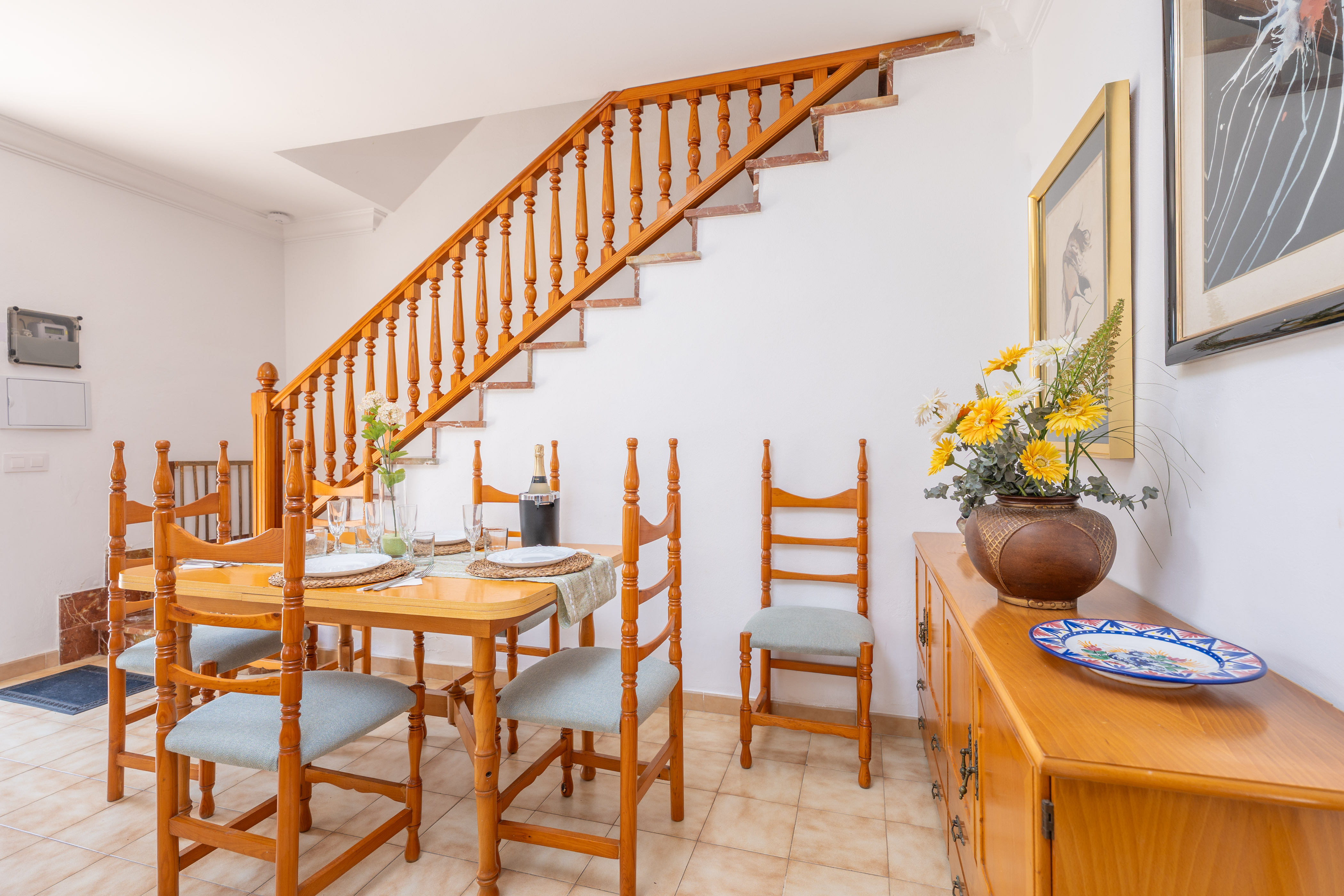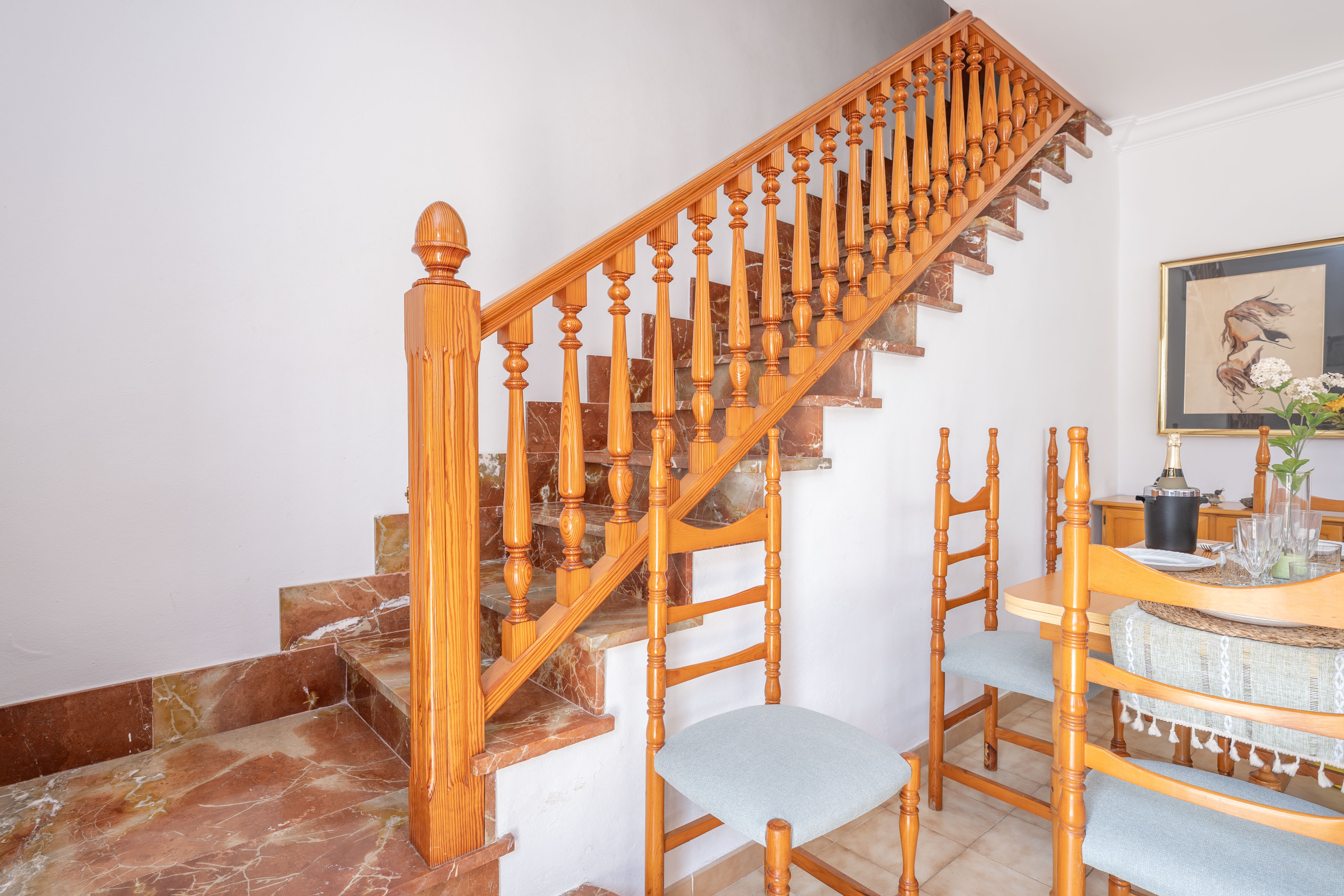 Boven vindt u drie extra slaapkamers: één met een tweepersoonsbed en toegang tot een privébalkon, en twee met eenpersoonsbedden. Een centrale airco-unit op de gang zorgt voor een aangename temperatuur op de bovenverdieping.