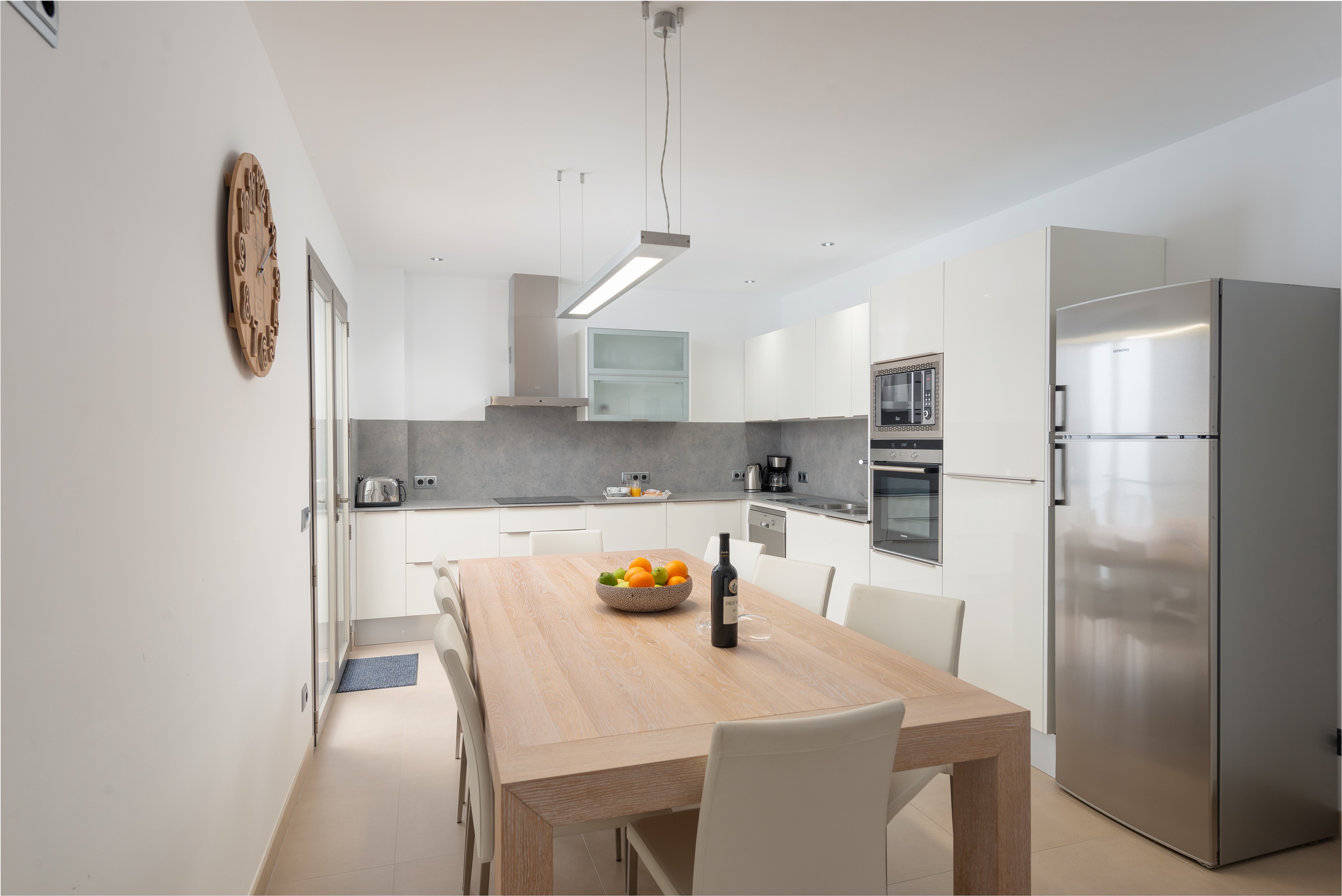 Vanaf hetzelfde terras kunt u het appartement betreden dat een moderne en comfortabele stijl heeft. De woonkamer is voorzien van een televisie met satellietzenders en airconditioning. De moderne woonkeuken is van alle gemakken voorzien en heeft een keramische kookplaat. Vanaf hier heeft u toegang tot de wasruimte buiten die is uitgerust met een wasmachine, strijkijzer en strijkplank. In het appartement zijn er twee slaapkamers, beide met een tweepersoonsbed en een kledingkast en een van hen ook met airconditioning en een eigen badkamer met douche. Er is ook nog een badkamer met een douche voor de rest van het huis. Ten slotte kunnen we een kinderbedje en een kinderstoel klaarmaken voor het geval u met uw baby reist.