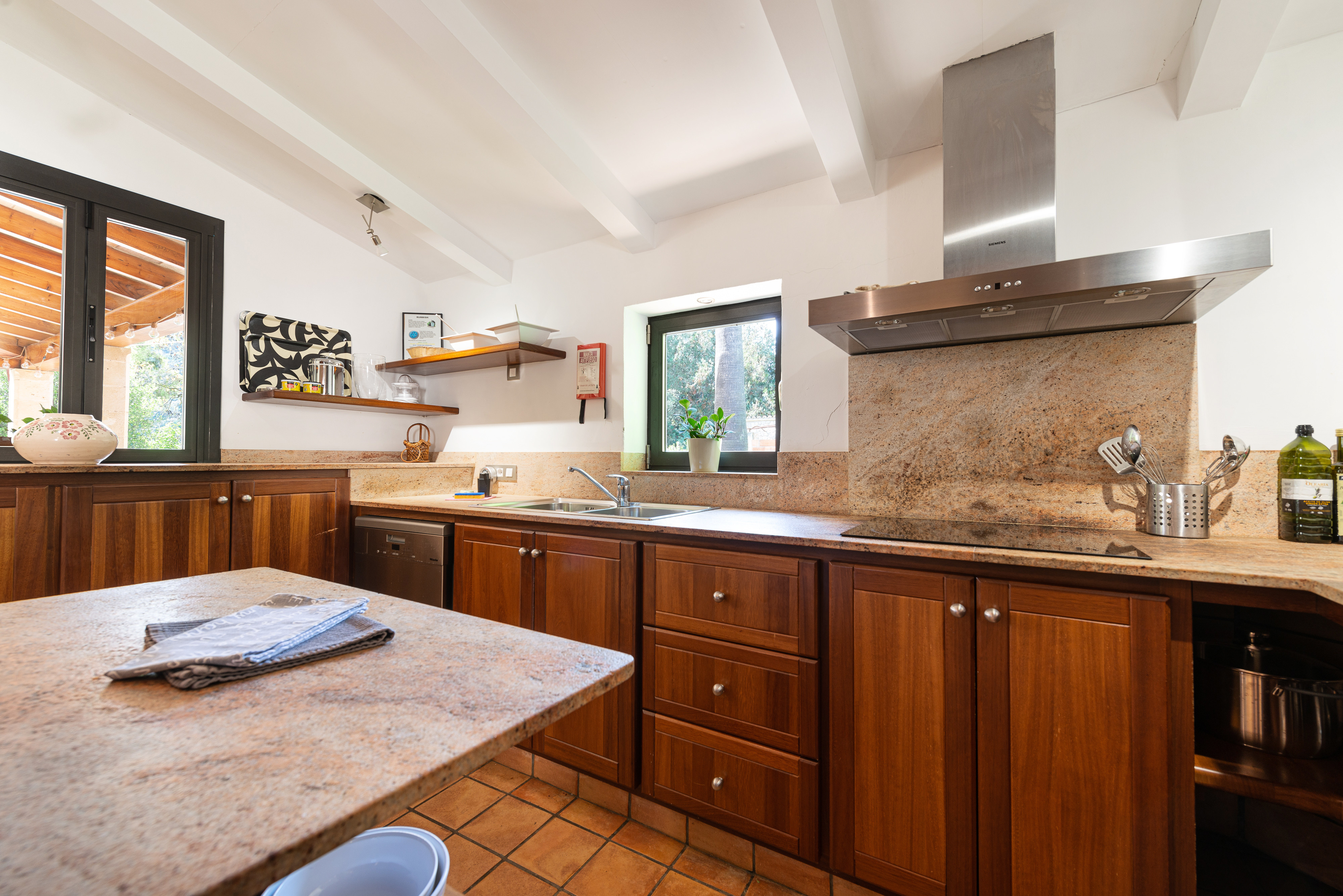 Het interieur van het huis is verdeeld over één verdieping en opent naar een ruime woonkamer met een Smart TV en airconditioning. De keuken met keramische kookplaat is ideaal om momenten te delen met je gezelschap en is uitgerust met alle nodige keukengerei om comfortabel te kunnen koken. Er is een wasmachine, strijkijzer en strijkplank. Wanneer het tijd is om te slapen, vind je twee complete slaapkamers: de eerste heeft twee eenpersoonsbedden en een en-suite badkamer met een bad, en de tweede heeft een tweepersoonsbed en een en-suite badkamer met een bubbelbad. Beide slaapkamers zijn voorzien van airconditioning, en als je met je baby reist, kunnen we je een kinderbedje en kinderstoel verstrekken.