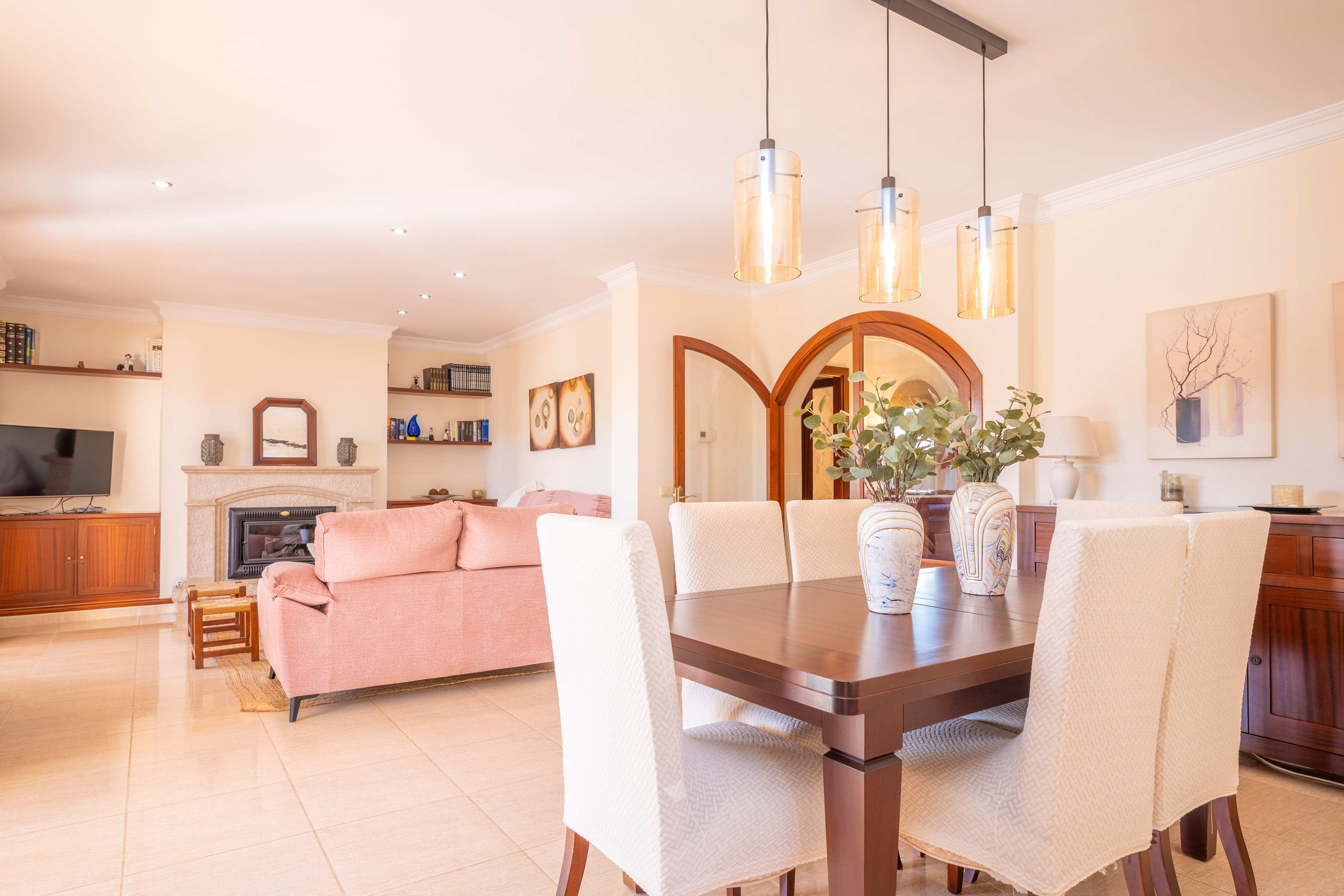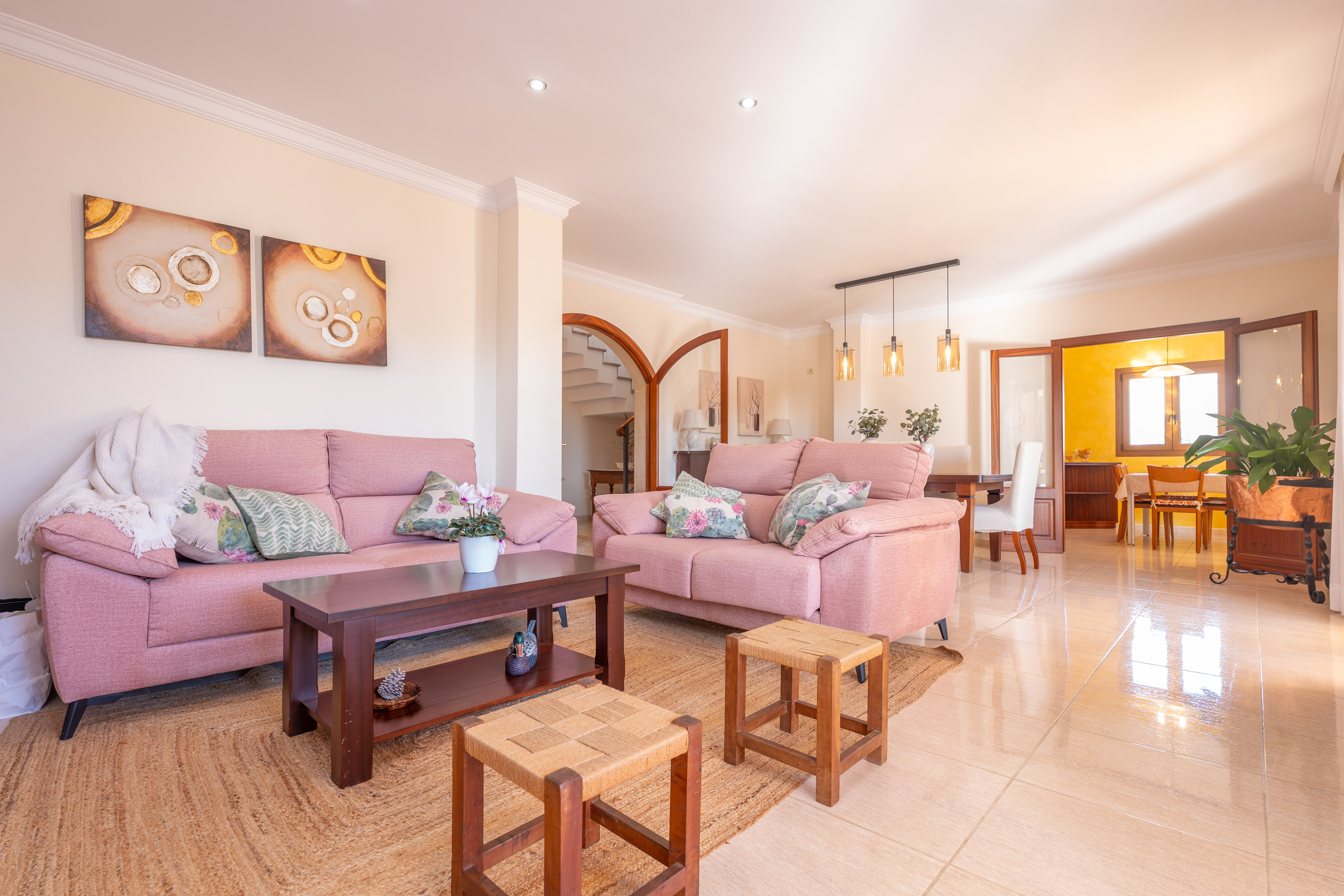 Het interieur van het huis is verdeeld over twee verdiepingen, met een comfortabele en goed uitgeruste ruimte. De woonkamer is voorzien van airconditioning, een Smart TV en comfortabele banken, waardoor een ideale sfeer ontstaat om te ontspannen. De open eetkamer sluit naadloos aan op de keuken, die is uitgerust met een inductiekookplaat en alle benodigde apparaten om te koken tijdens je verblijf.