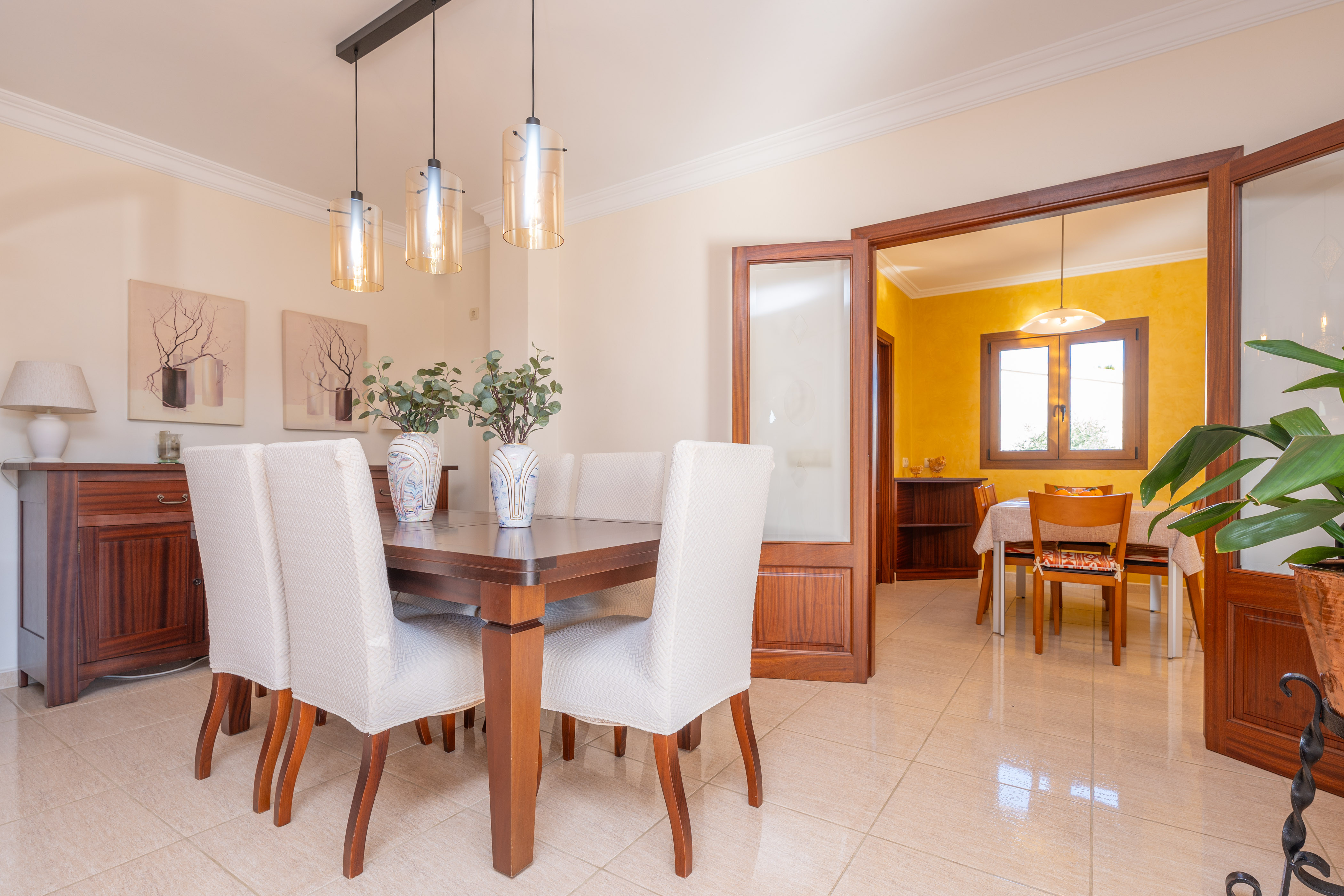 Op de begane grond bevindt zich de eerste slaapkamer, ingericht met twee eenpersoonsbedden, een kledingkast en airconditioning, evenals een badkamer met een douche. Op de bovenverdieping bevinden zich de overige drie slaapkamers, die allemaal zijn uitgerust met airconditioning en toegang hebben tot een terras. De eerste slaapkamer op de bovenverdieping heeft een tweepersoonsbed en kasten, de tweede beschikt ook over een tweepersoonsbed, terwijl de derde een tweepersoonsbed, een inloopkast en een en-suite badkamer met douche biedt. Bovendien is er een tweede badkamer met een ligbad en douche op de bovenverdieping.