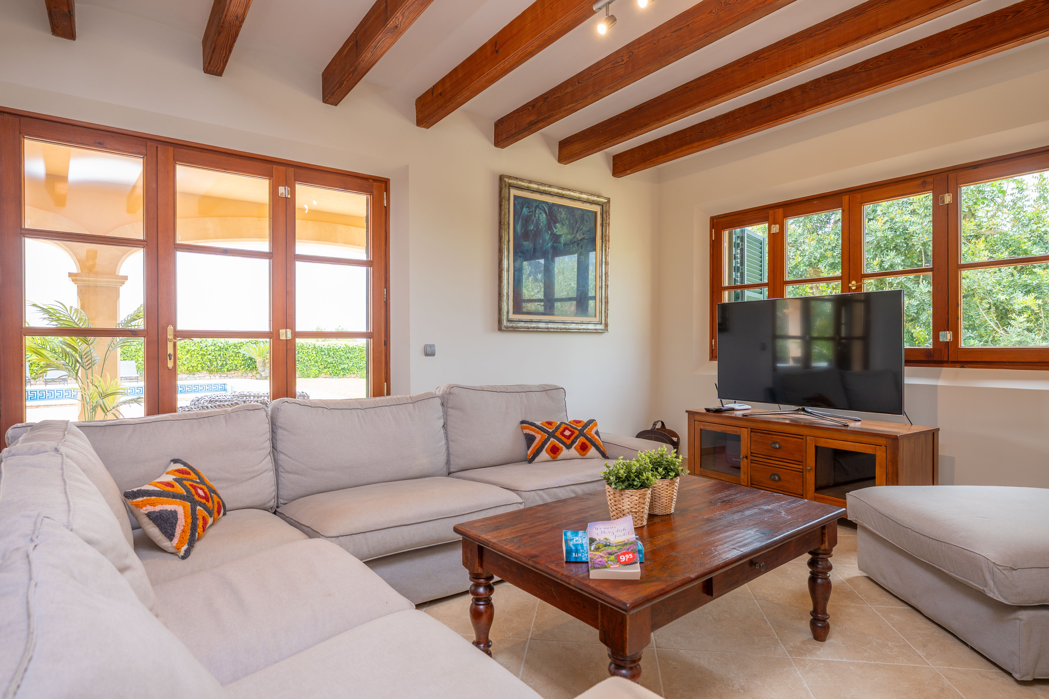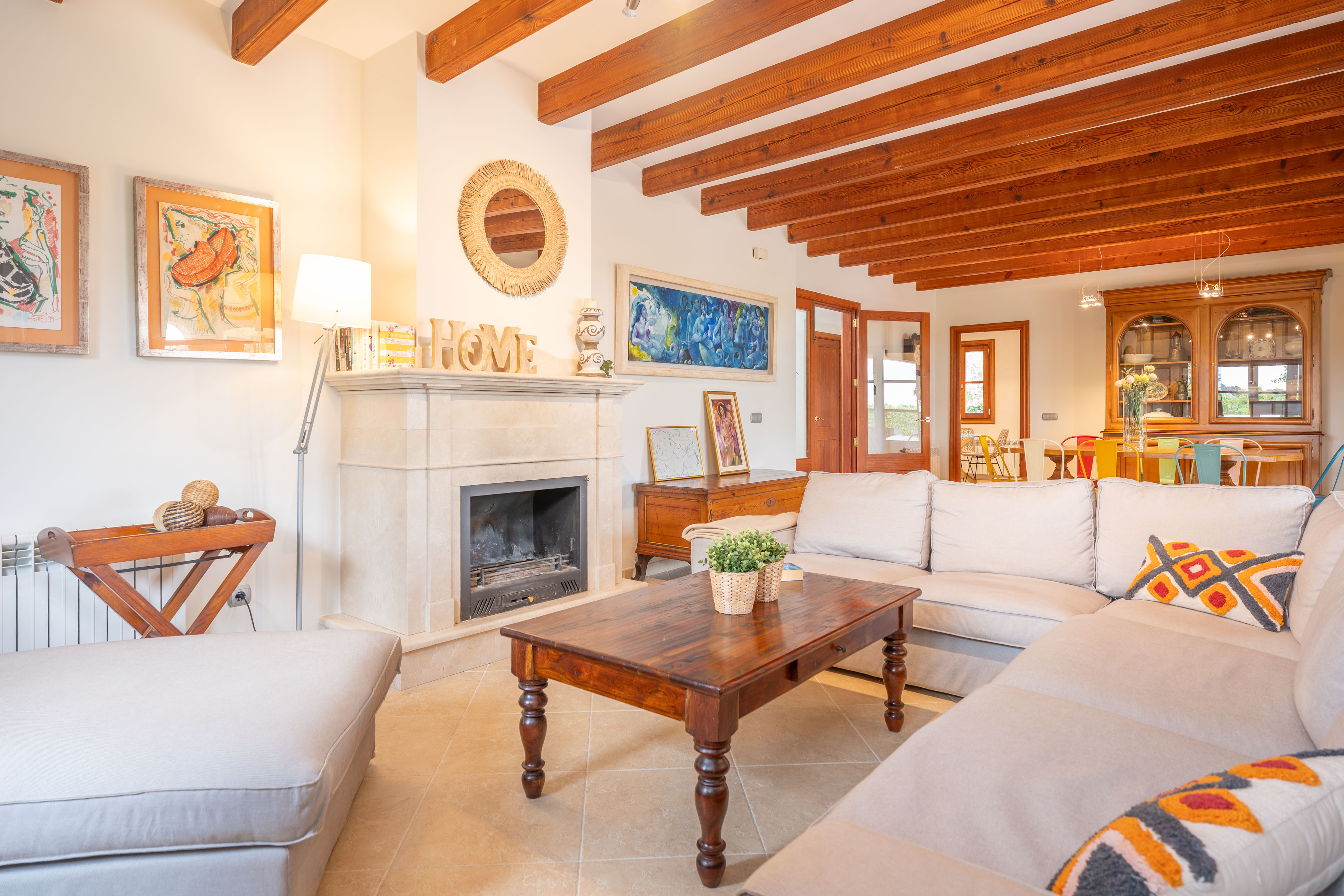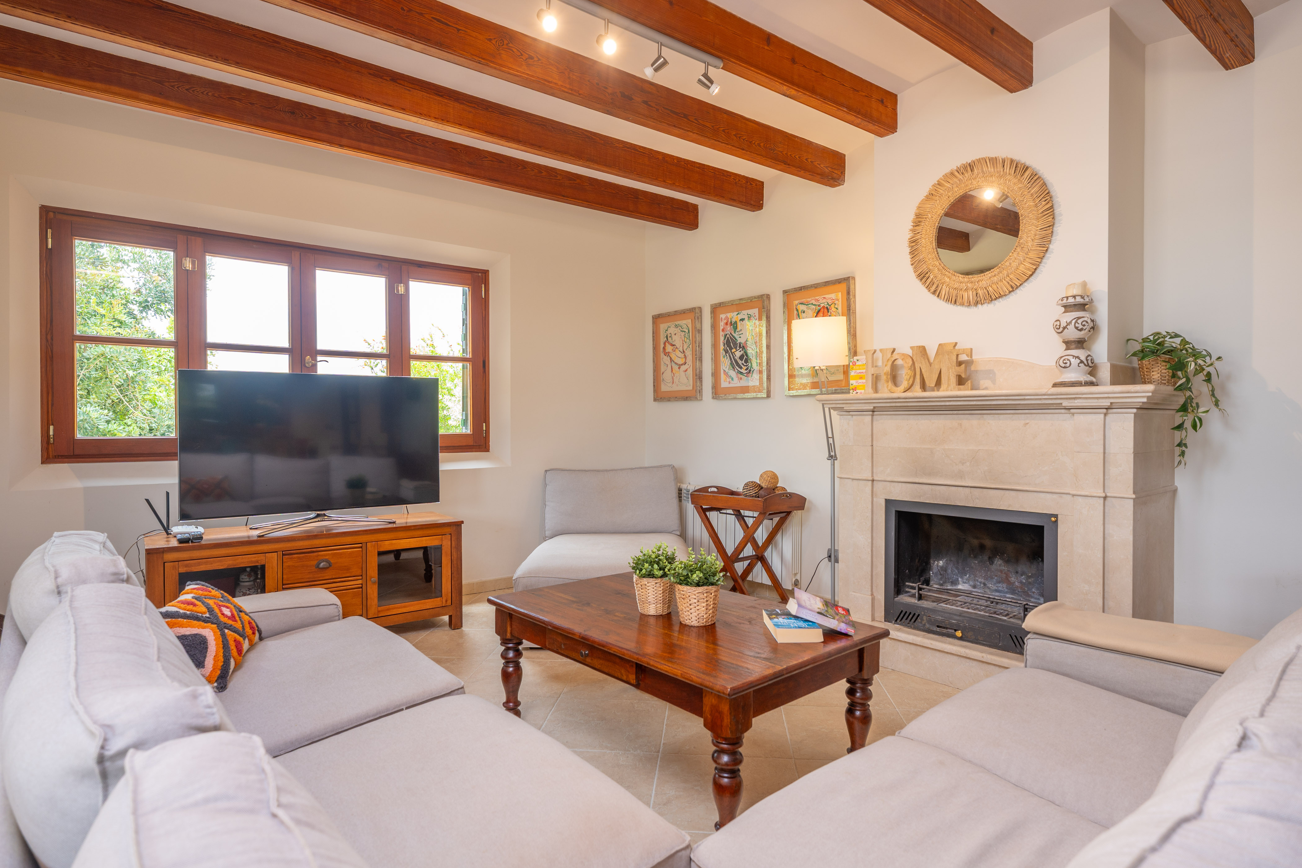 Deze prachtige finca ligt vlakbij Binissalem, een Mallorcaans dorp dat bekend staat om zijn wijnproductie. Een aangename wandeling door de smalle straatjes van het dorp, eventueel vergezeld door een heerlijk diner, geeft u een kijkje in de essentie van Mallorca. In de omgeving vindt u vele wijnkelders die wijnproeverijen aanbieden. In Binissalem vindt u supermarkten, bars en alles wat u nodig heeft voor een zelfstandig verblijf. Omdat Binissalem dicht bij het Tramuntana-gebergte ligt, is het ideaal om te wandelen en fietsen.