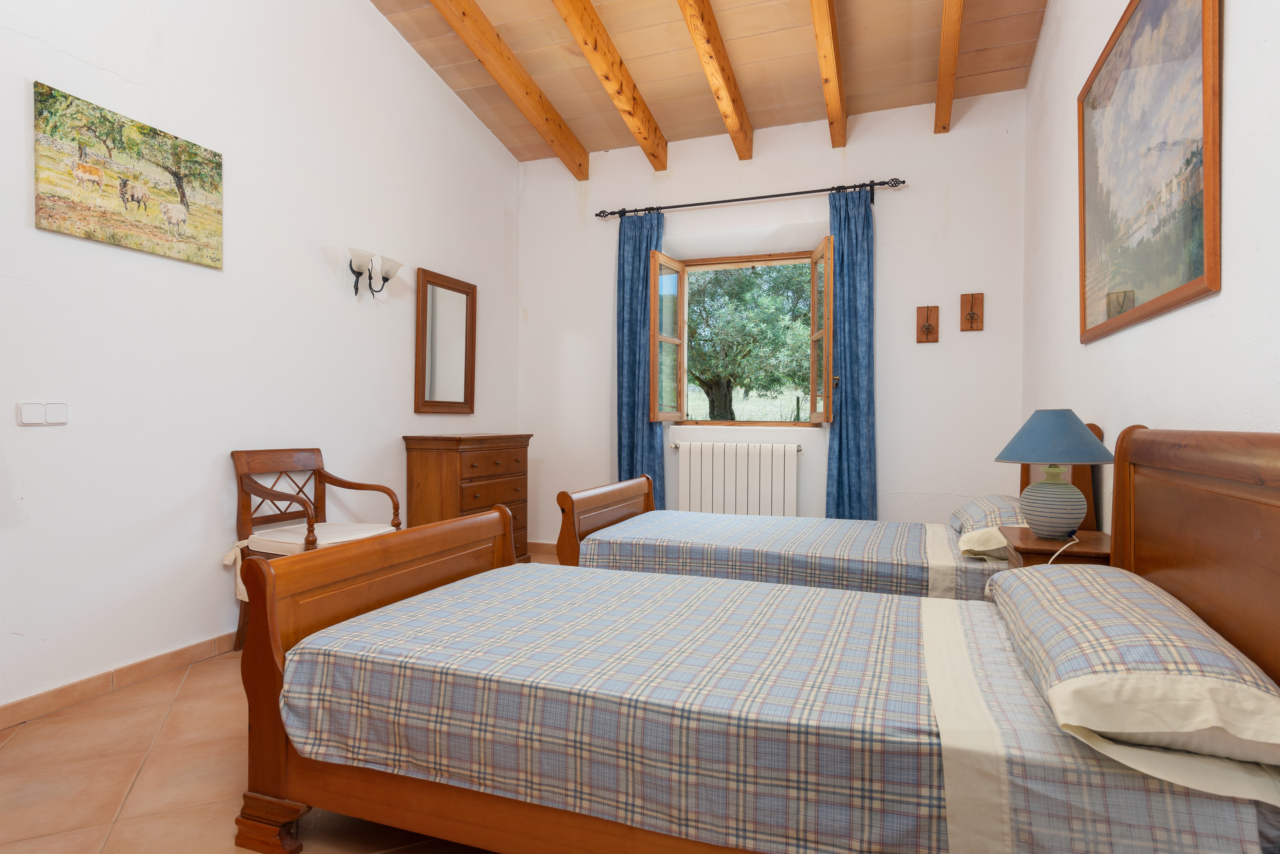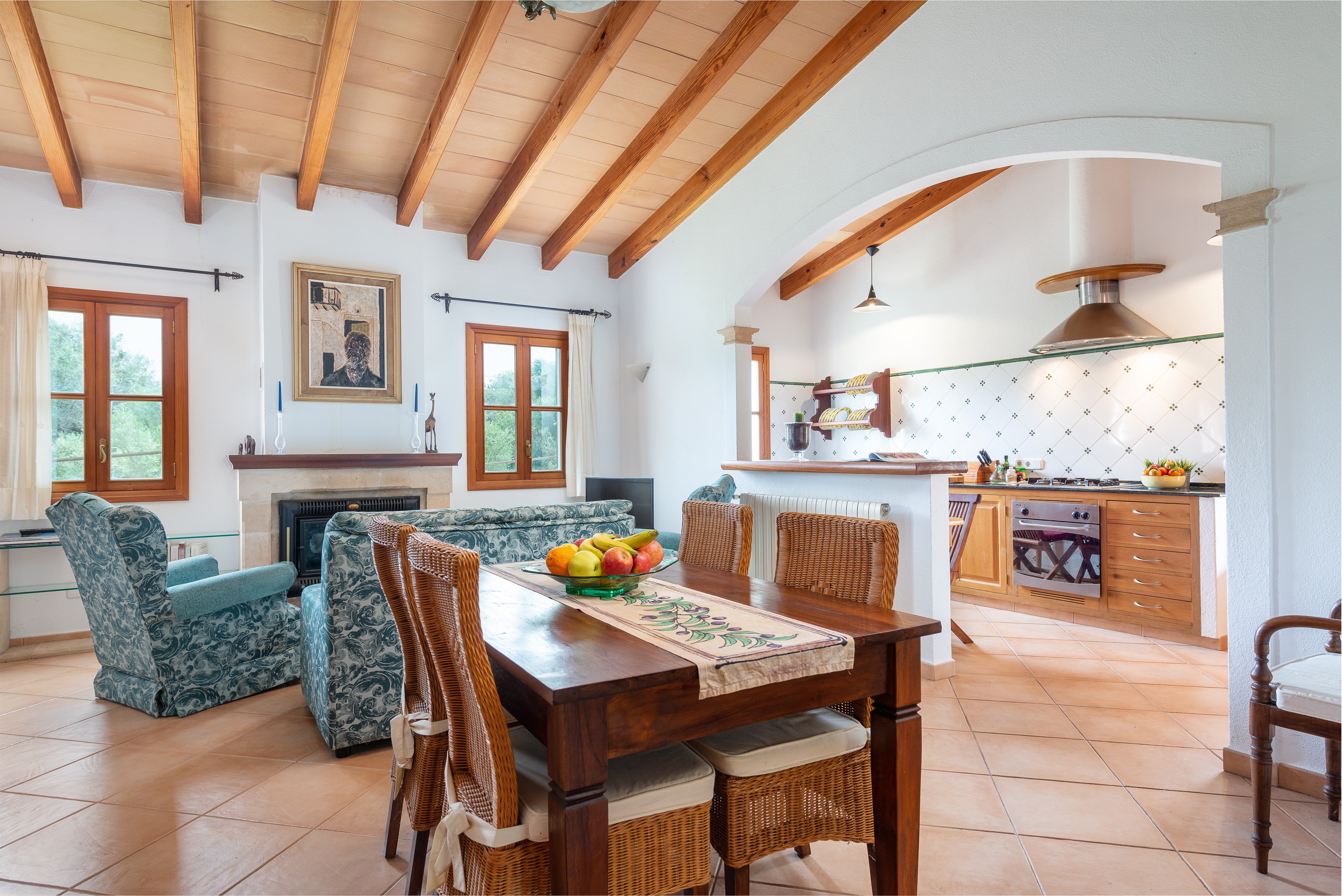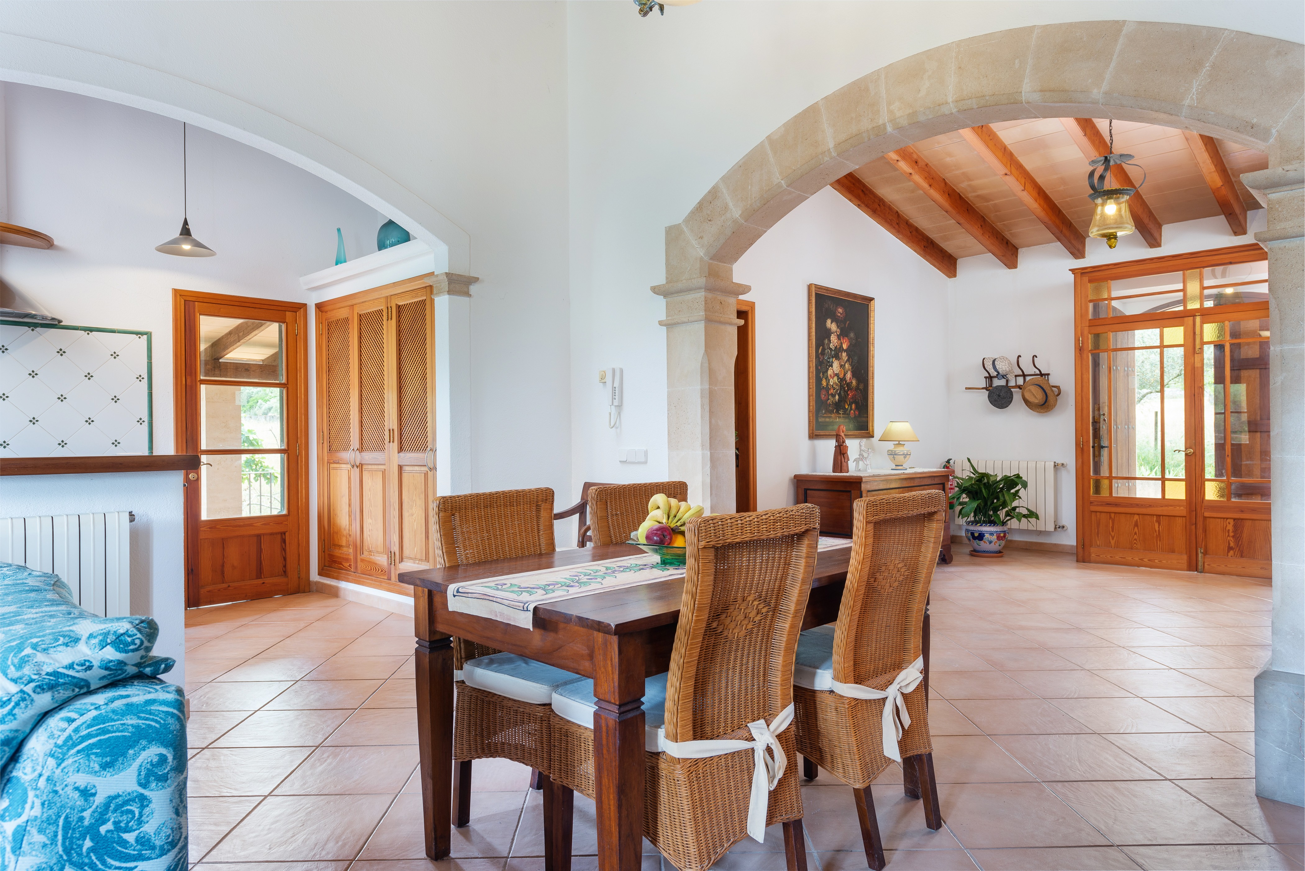 Het huis met één verdieping heeft een eenvoudige en comfortabele stijl. De grote Mallorcaanse ingang leidt naar de woon-eetkamer, uitgerust met satelliet-tv, een open haard en een eettafel voor 4 personen. De semi open keuken is voorzien van een gasfornuis. De aparte wasruimte is voorzien van een wasmachine, strijkijzer en strijkplank. Om uit te rusten, beschikt het huis over 2 slaapkamers, beide met twee eenpersoonsbedden en een kledingkast. Beide slaapkamers hebben directe toegang tot de eerste van de badkamers, met een ligbad. Er is nog een badkamer met een douche. Tot slot maken een babybedje, een kinderstoel en centrale verwarming op gas de uitrusting compleet.
