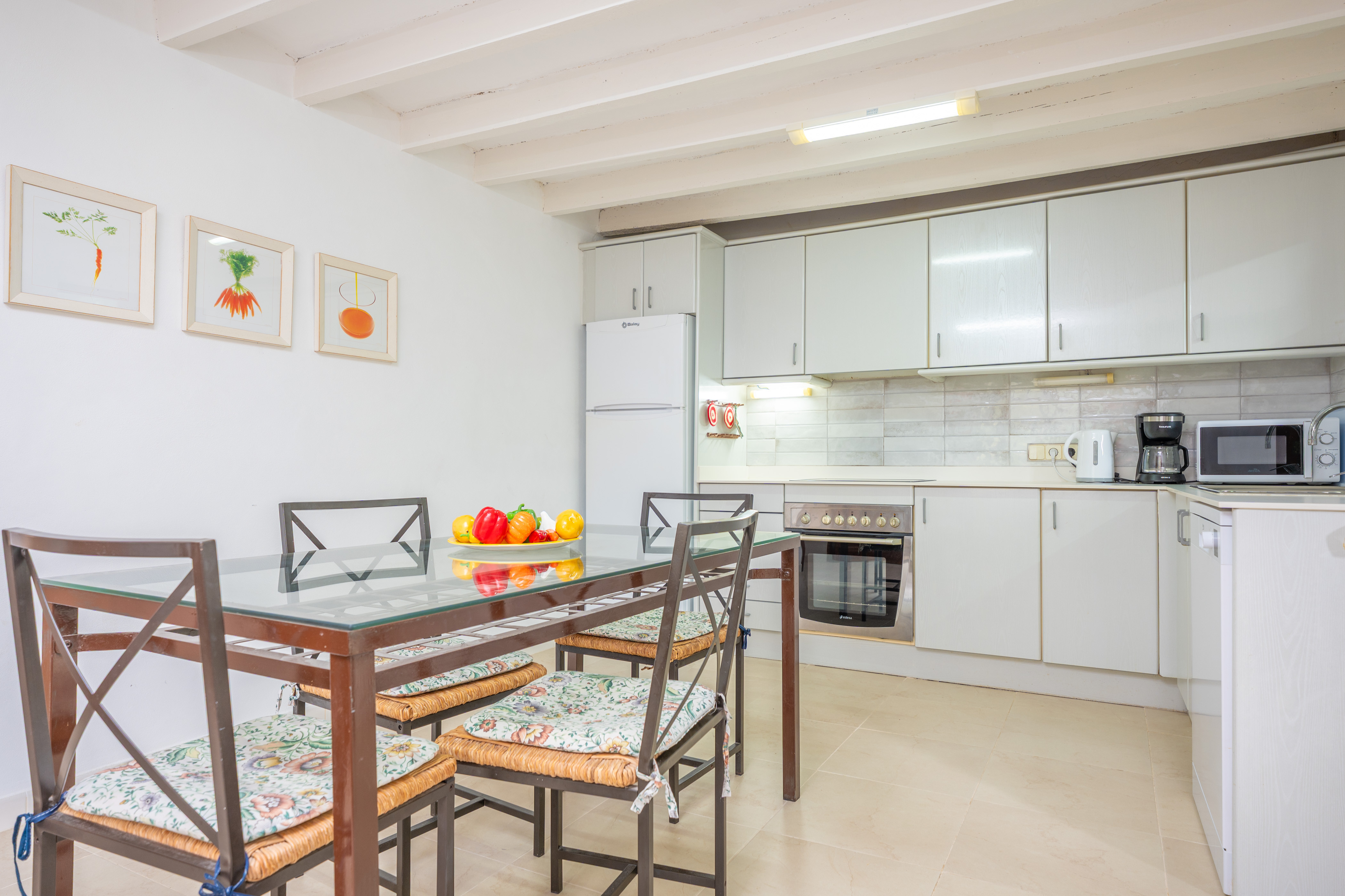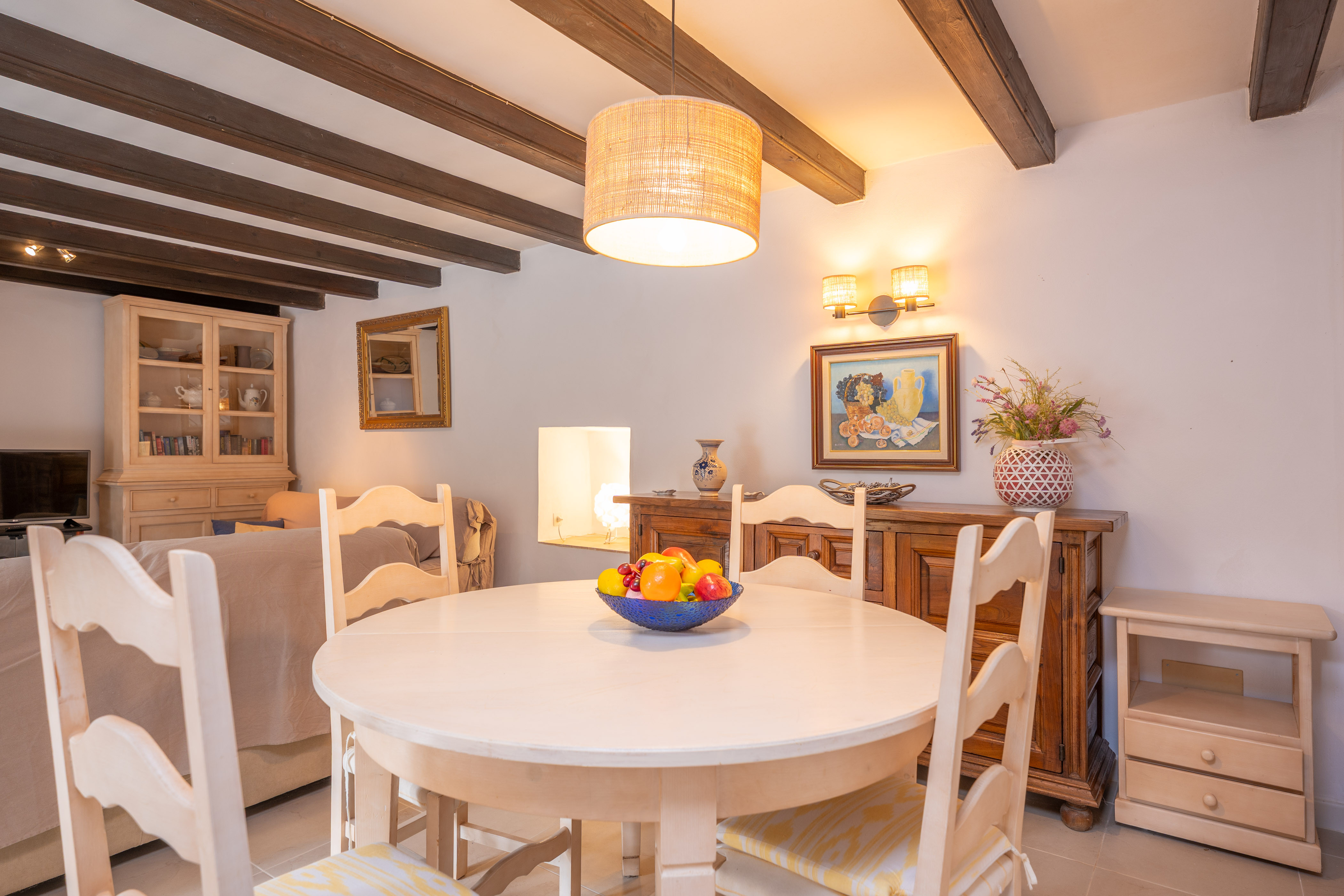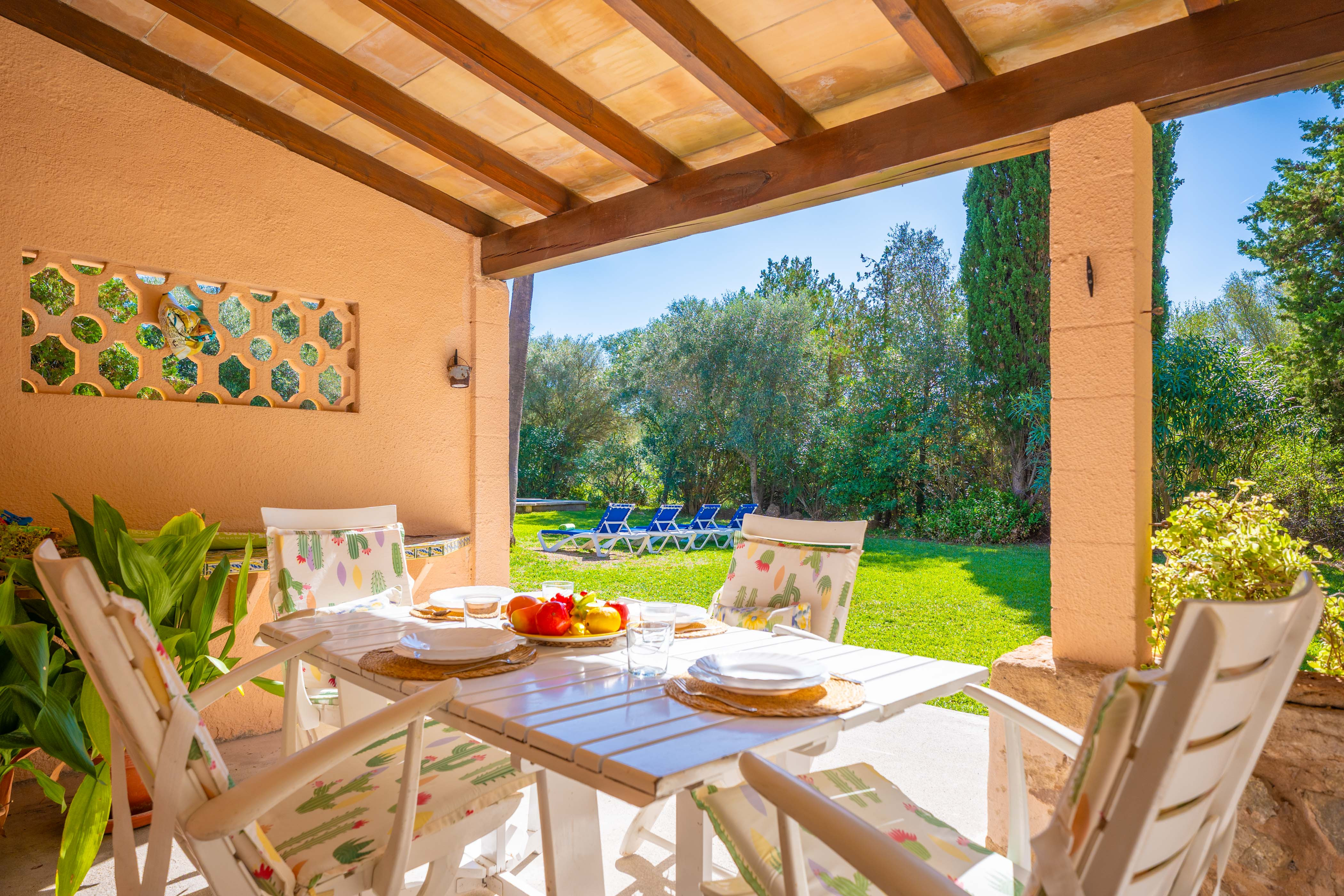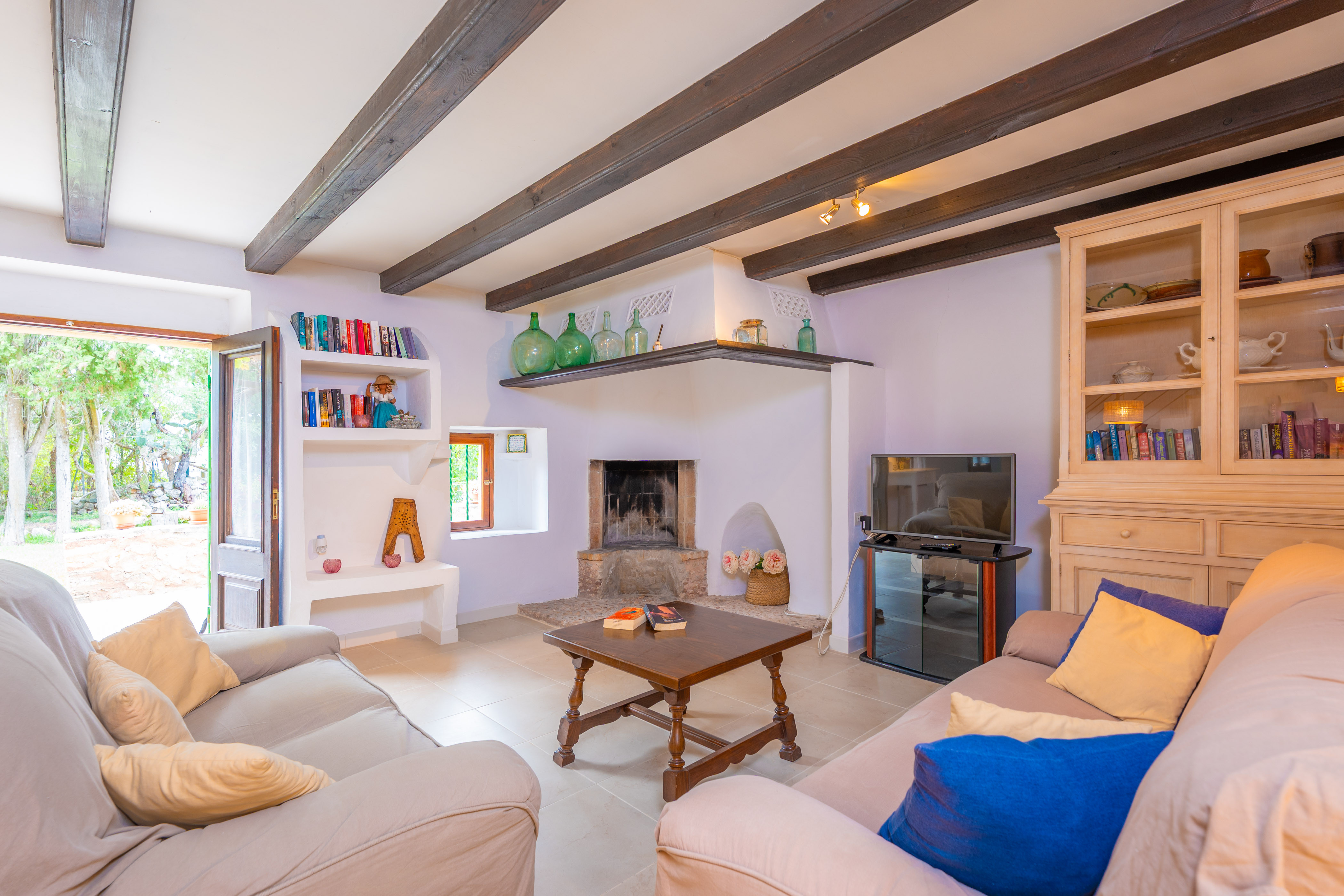 De accommodatie bestaat uit 2 verdiepingen en verrast met zijn sterke Mallorcaanse karakter. Het weerspiegelt duidelijk de essentie van de rustieke huizen op het eiland met zijn oude maar bewaard gebleven meubels, zijn houten balken en zijn prachtige decoratieve details. De woon - eetkamer benadrukt deze stijl met zijn indrukwekkende schoorsteen en nodigt uit om samen naar de satelliet-tv te kijken of een praatje te maken. De keuken is uitgerust met een keramische kookplaat, een oven, een tafel met stoelen om hier van uw maaltijden te genieten en nog veel meer. De wasmachine, strijkijzer en strijkplank bevinden zich ook in de keuken. Op de eerste verdieping vindt u de twee slaapkamers van het huis, beide met een en-suite badkamer met ligbad, kast, airco en uitgang naar het terras. Een van de slaapkamers heeft een tweepersoonsbed en de andere heeft twee eenpersoonsbedden. Ten slotte kunnen we een kinderbedje en een kinderstoel klaarmaken als u met uw baby reist.