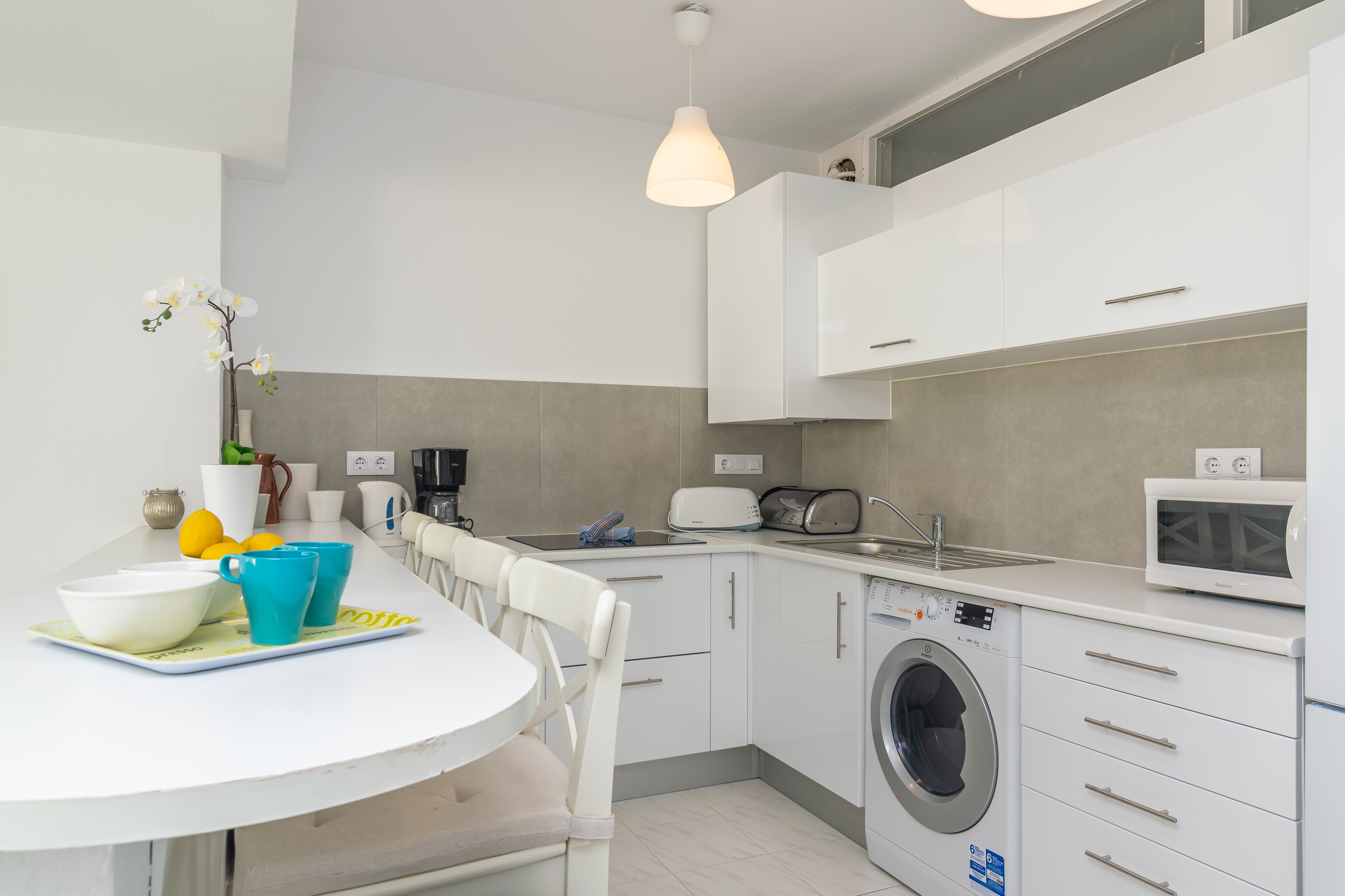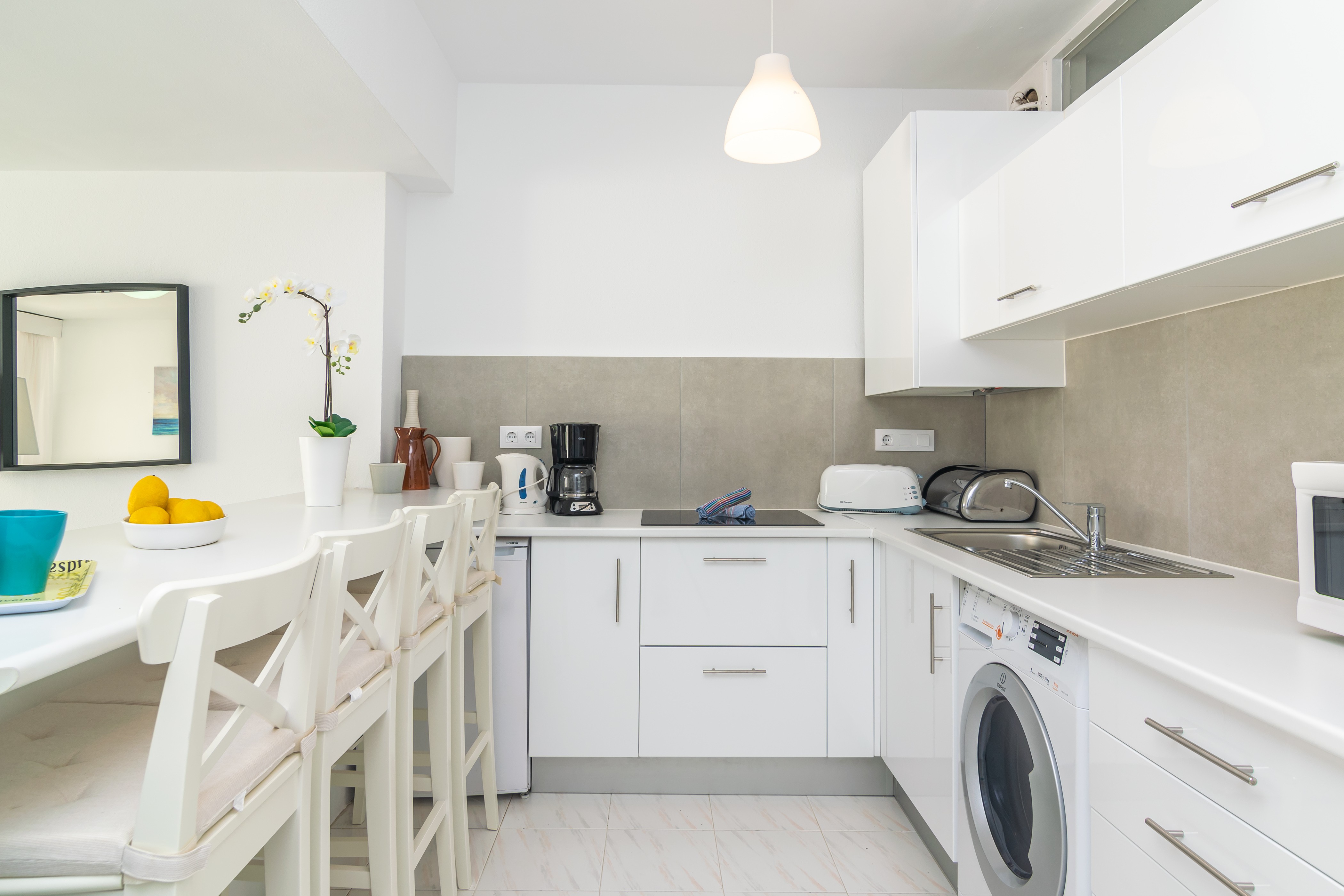 Het interieur is onlangs gerenoveerd en prachtig ontworpen met de nieuwste moderne meubels, waaronder een slaapbank en tv. De keuken kijkt uit op de woonkamer met airconditioning, waar u 's ochtends met een kopje koffie kunt zitten en genieten van het prachtige uitzicht op de baai. Het appartement heeft een oven en keramische kookplaat, een grote koelkast met vriesvak en een wasmachine. Aan de achterkant van het appartement met uitzicht op de tuinen bevinden zich twee slaapkamers met airconditioning, een tweepersoonskamer en een kamer met een stapelbed. Er is een ruime badkamer met ligbad en douche, eveneens onlangs gerenoveerd en gemoderniseerd. Het appartement is uitgerust met een strijkijzer, strijkplank en koffiezetapparaat. Als u met uw baby reist, kunnen wij u voorzien van een kinderbedje en een kinderstoel.