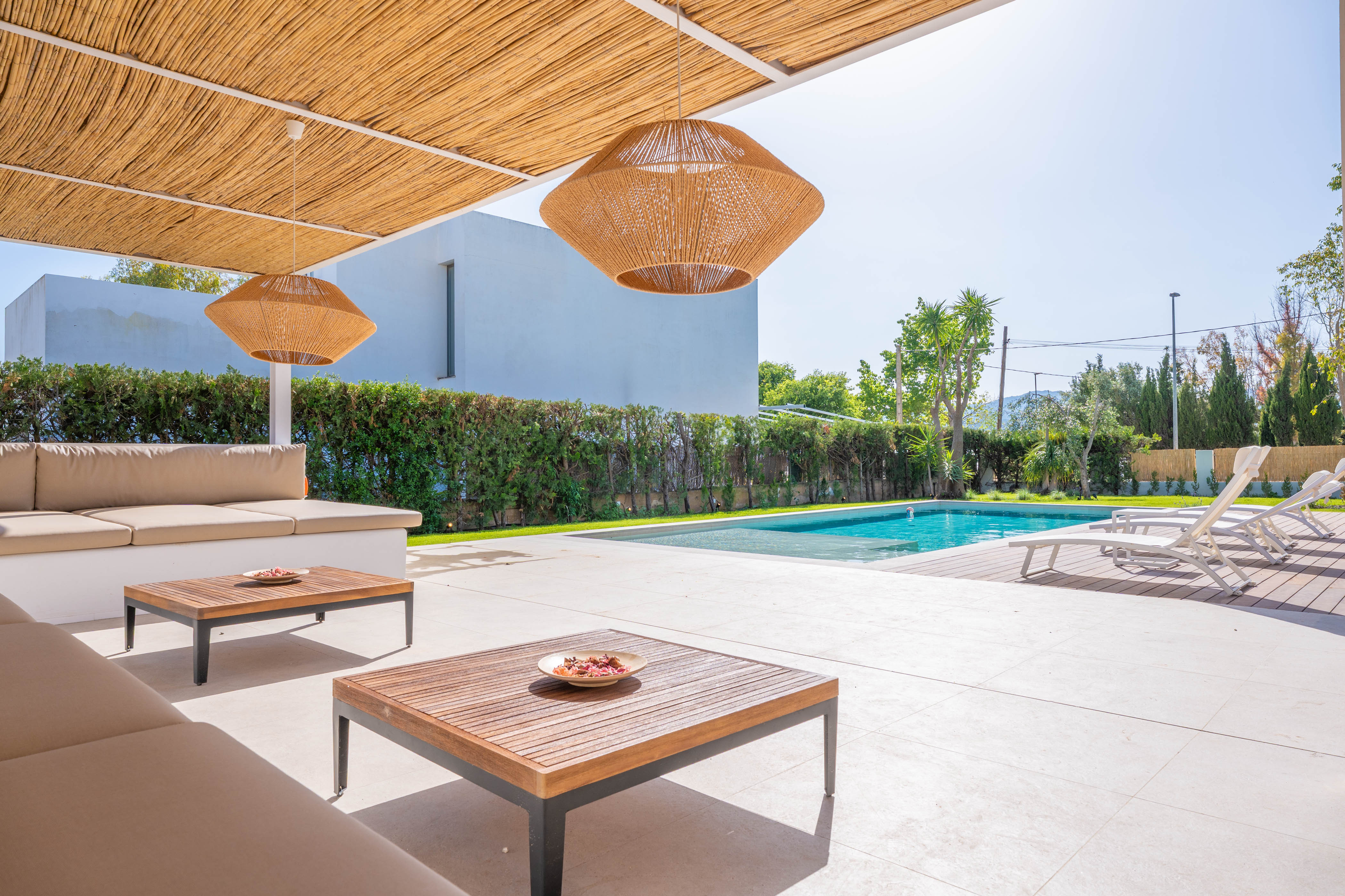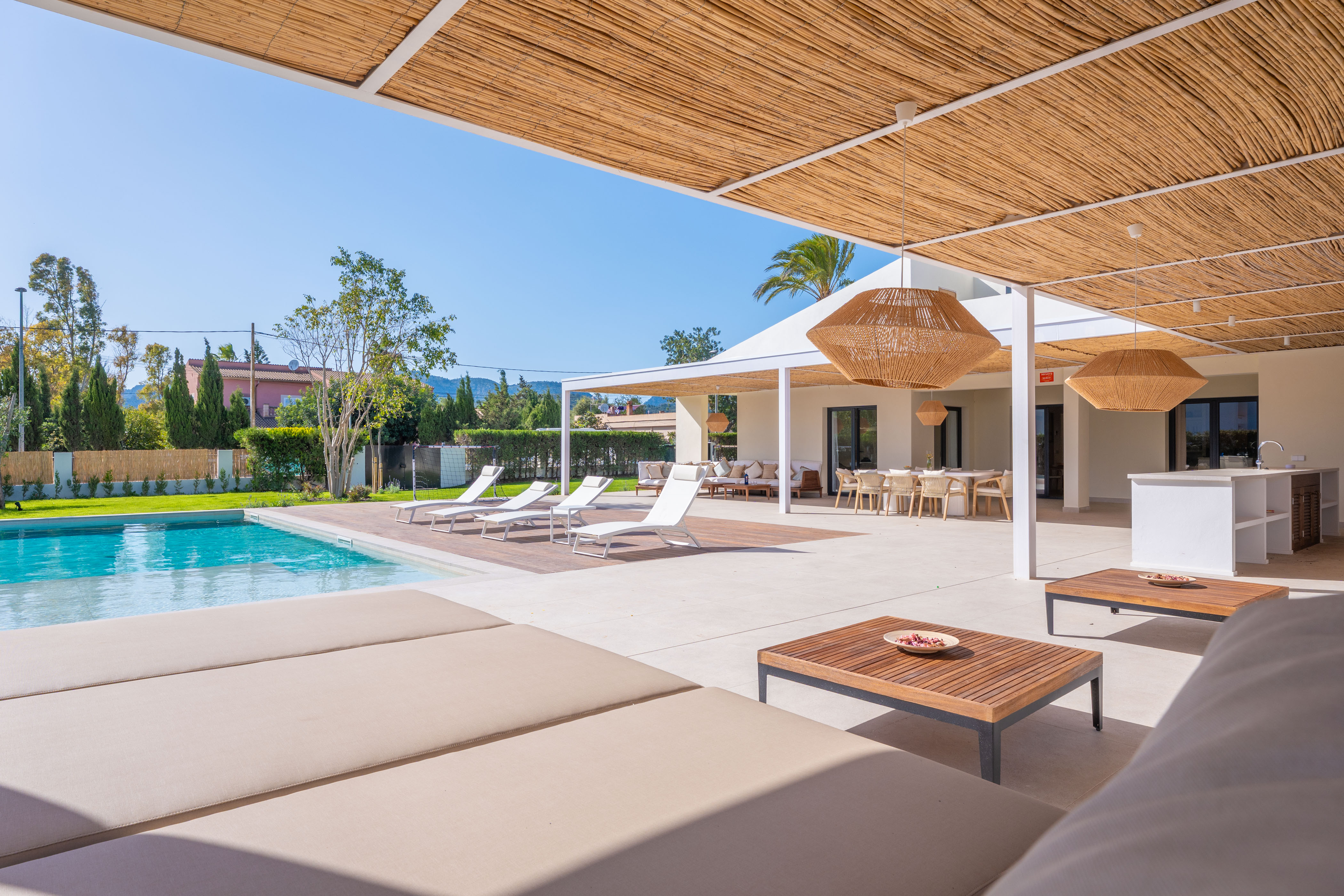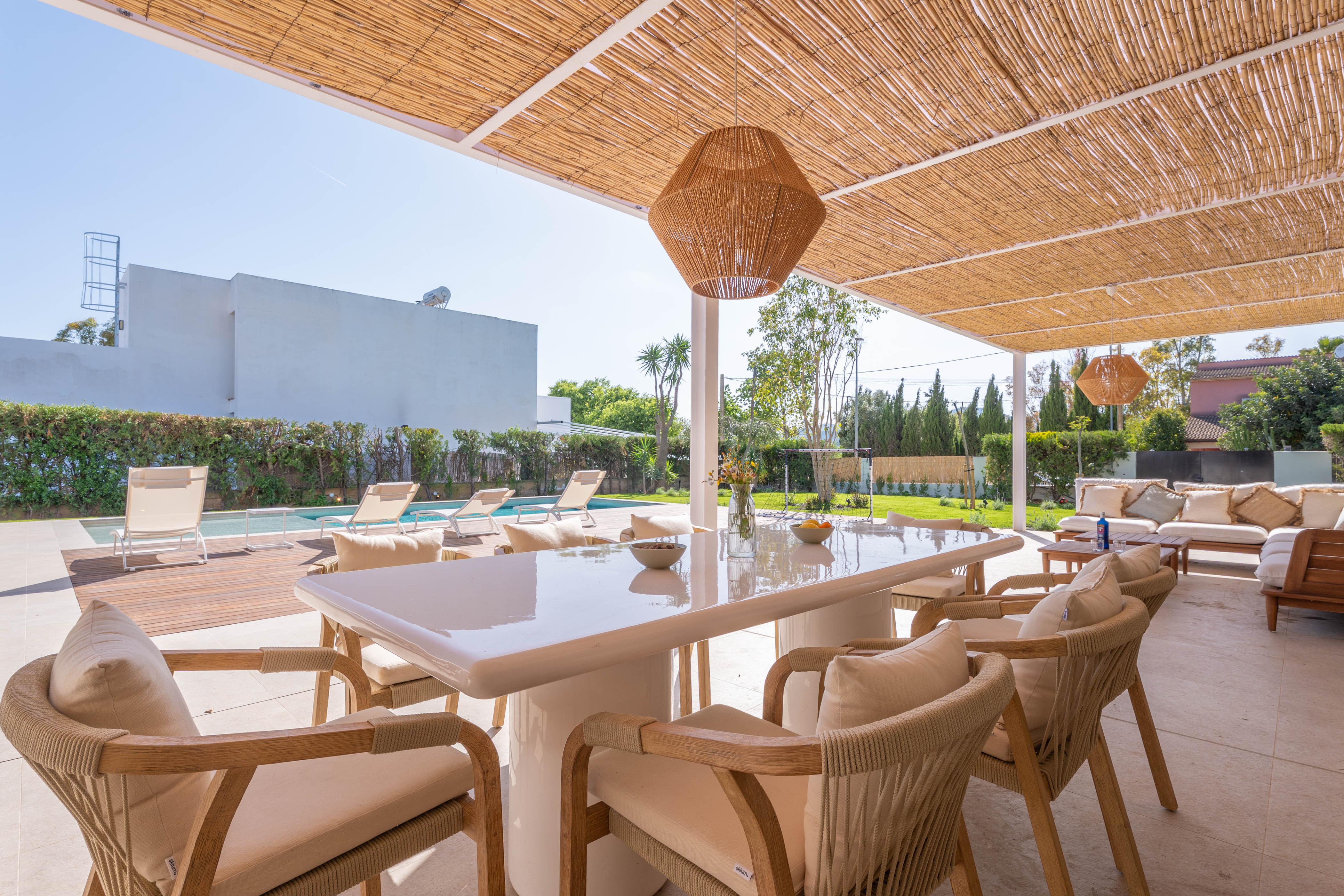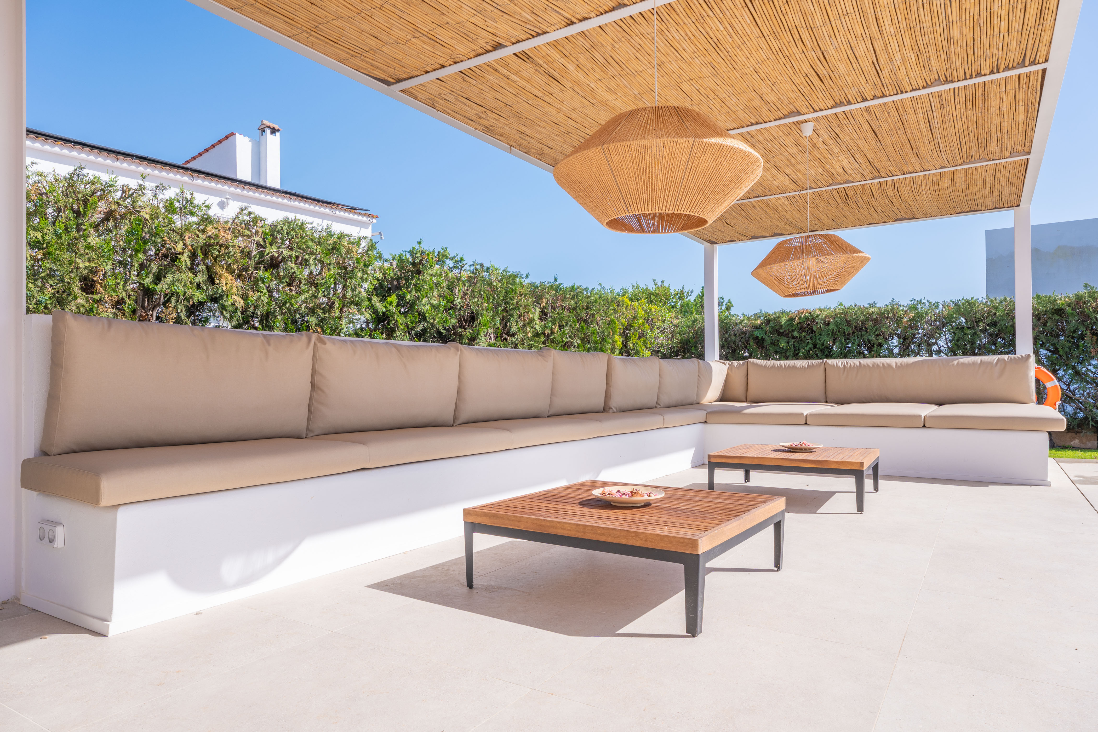 Het moderne interieur van de woning met twee verdiepingen biedt alles wat u nodig heeft voor uw ontspanning. De woonkamer is voorzien van airconditioning en een smart-tv, ideaal om 's avonds films te kijken. Op de volledig uitgeruste inductiekookplaat kunt u heerlijke gerechten bereiden. Er is een eethoek waar u samen kunt eten. Het huis beschikt over een wasmachine, strijkijzer en strijkplank. Voor het slapengaan vindt u 6 slaapkamers, allemaal met airconditioning. Op de begane grond bevinden zich er vier: twee met een tweepersoonsbed en een eigen badkamer met douche, en nog eens twee met een tweepersoonsbed. Op dezelfde verdieping is er nog een badkamer met douche. Op de bovenverdieping bevinden zich de overige slaapkamers, beide met een tweepersoonsbed, een eigen badkamer met douche en toegang tot een aangenaam gemeubileerd terras. Als u met een baby reist, kunnen wij een kinderbedje en een kinderstoel voor u regelen.