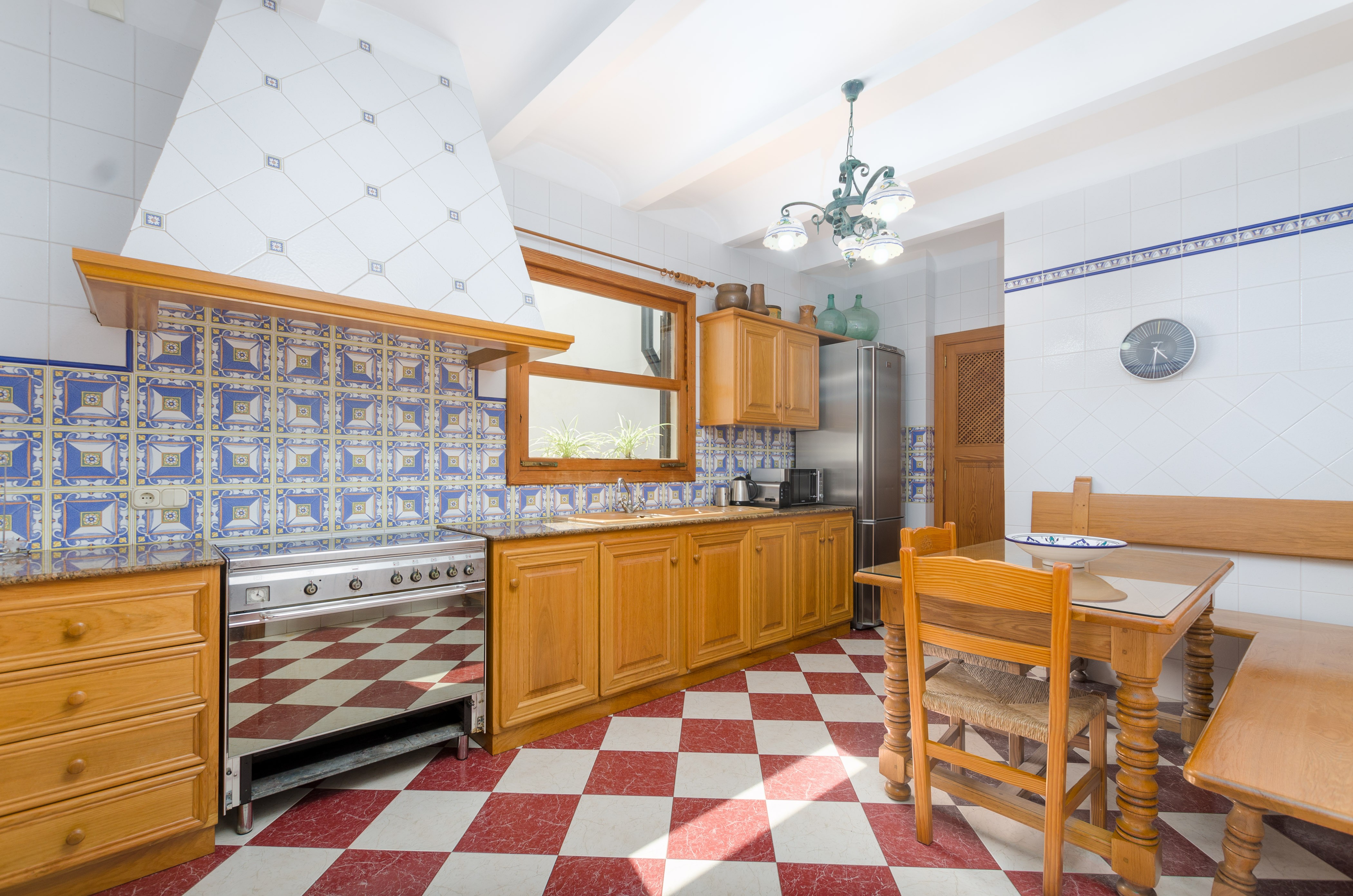 Binnen vind je een traditionele woonkamer met satelliet-tv en airconditioning, verbonden met het eetgedeelte via een grote Mallorcaanse boog. Daarachter ligt de ruime keuken, met een industrieel gasfornuis, een eettafel met stoelen en een bank, en veel ruimte. Het huis heeft drie slaapkamers, allemaal met kledingkasten en airconditioning; twee hebben een tweepersoonsbed, terwijl de derde twee aparte bedden heeft. Als je met een baby reist, zijn een kinderbedje en een kinderstoel aanwezig. De accommodatie wordt gecompleteerd door twee badkamers, een met een bad en de andere met een douche. Daarnaast beschikt het huis over wasmachines, strijkijzers en strijkplanken voor jouw gemak. Er is centrale verwarming op olie.