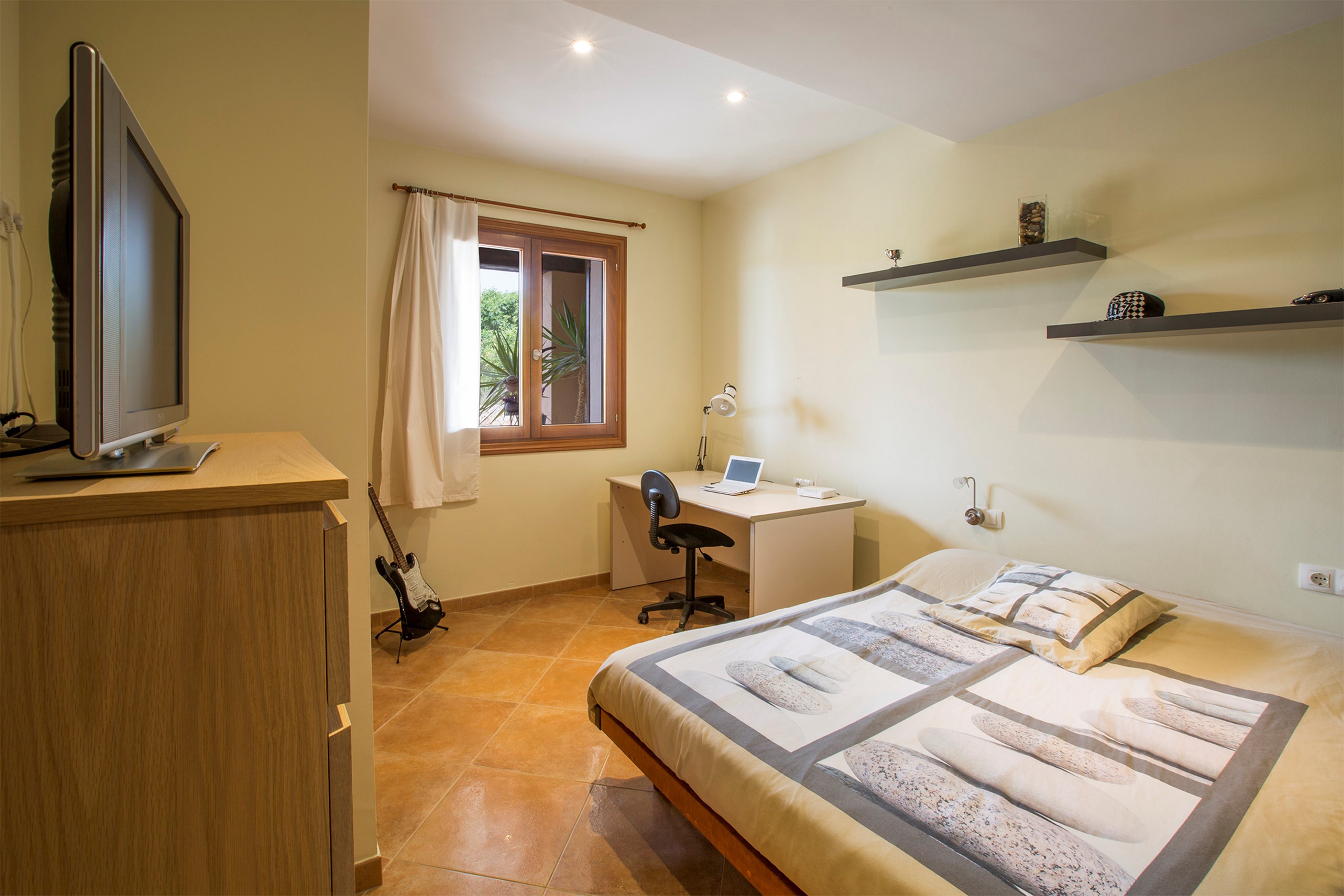 Dit huis met twee verdiepingen is op een moderne en gezellige manier ingericht en zorgt ervoor dat u zich vanaf het eerste moment op uw gemak voelt. De veranda geeft toegang tot de woonkamer met een satelliet-tv, een bank en een houtkachel. Het eetgedeelte staat in open verbinding met de keuken, die goed is uitgerust met onder andere een gaskookplaat, koelkast, oven en kookgerei. Er is ook een wasruimte met een wasmachine, wasdroger, strijkijzer en strijkplank. Op de begane grond bevindt zich een slaapkamer met tweepersoonsbed, kledingkast, ventilator en bureau en een aparte badkamer met douche. Een trap leidt naar de eerste verdieping waar zich nog twee slaapkamers bevinden, beide met inbouwkasten. Een daarvan is uitgerust met een tweepersoonsbed, airconditioning en een en-suite badkamer met een douche, terwijl de tweede slaapkamer is uitgerust met twee eenpersoonsbedden en een ventilator. Een kinderbedje en kinderstoel zijn op aanvraag beschikbaar. Er is ook een badkamer met een douche op de bovenverdieping. De televisies in de slaapkamers hebben geen satelliet-tv. Een elektrische radiator maakt de uitrusting van het huis compleet.