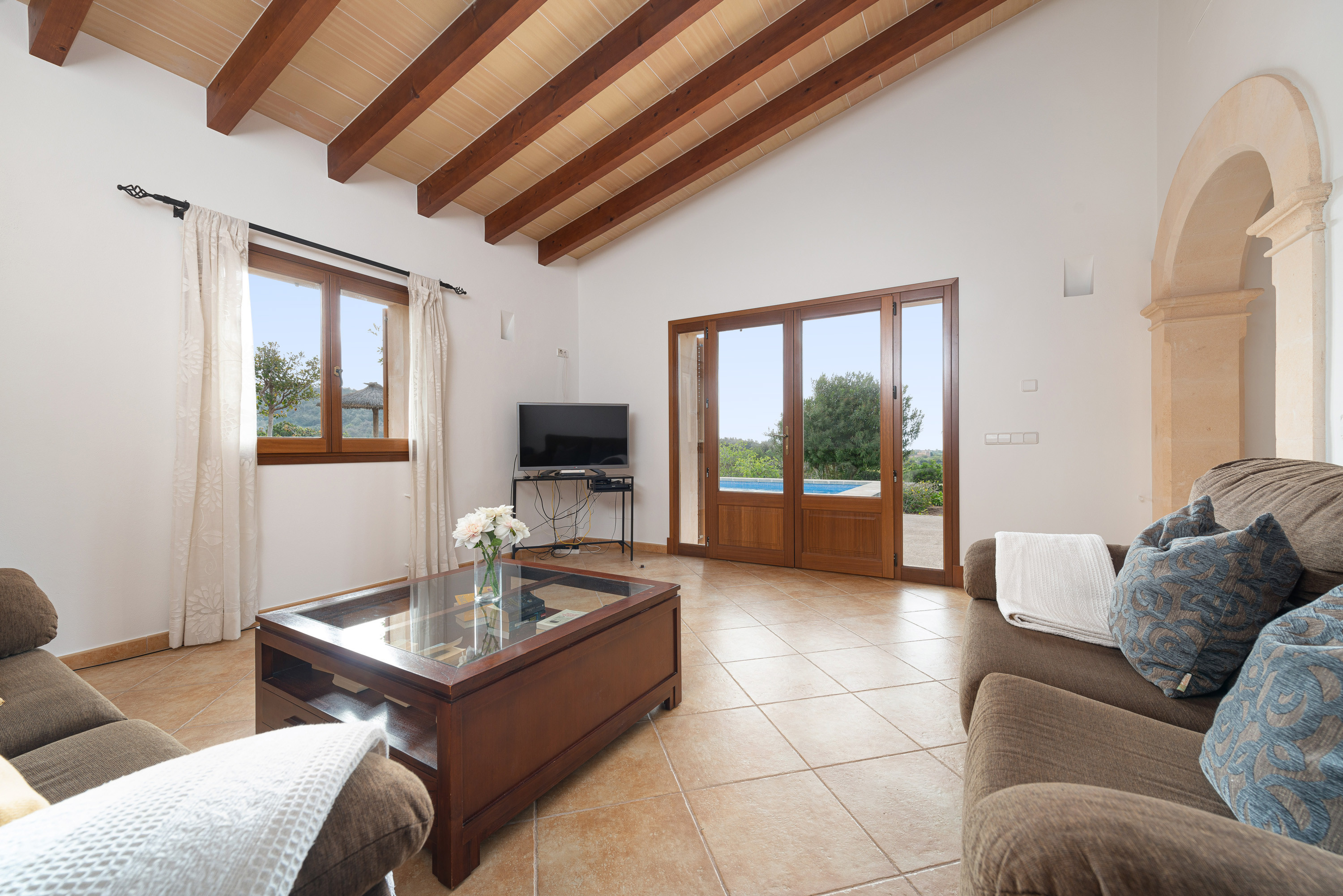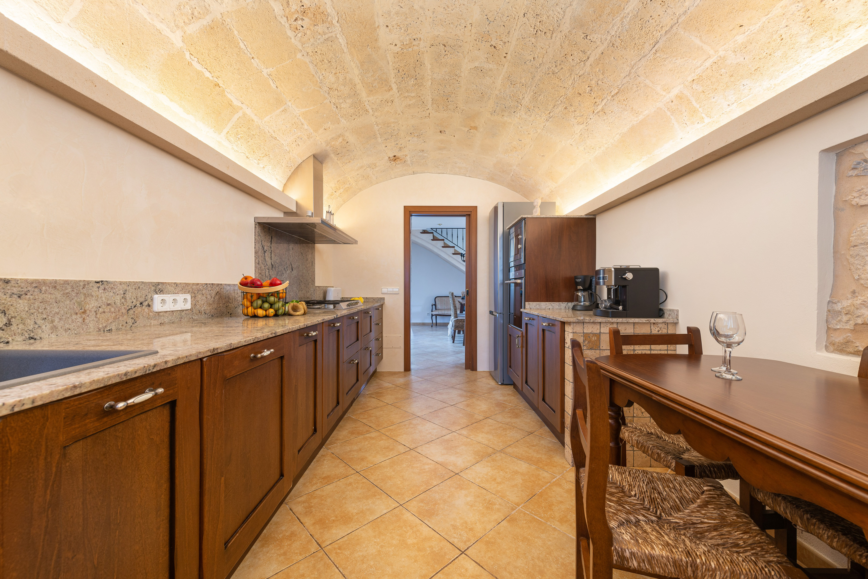 Het rustieke interieur, verdeeld over twee verdiepingen, begint met de gemeenschappelijke ruimtes op de begane grond en eindigt met de slaapkamers op de eerste verdieping, die allemaal voorzien zijn van airconditioning. Er is een lounge waar u op de twee comfortabele banken kunt zitten en films kunt kijken op de tv. De eetkamer heeft een grote tafel waar u gezellig samen kunt zitten en kunt genieten van heerlijke maaltijden, bereid op het volledig uitgeruste gasfornuis. Voordat u naar boven gaat, vindt u de eerste slaapkamer met twee eenpersoonsbedden en een en-suite badkamer met douche. Een toilet completeert deze verdieping. Op de eerste verdieping vindt u de overige twee slaapkamers, waarvan één met een tweepersoonsbed en een eigen badkamer met douche, en de andere met twee eenpersoonsbedden en een eigen badkamer met douche. Als u met een baby reist, zijn er een kinderbedje en een kinderstoel aanwezig. Tot slot kunt u tijdens uw verblijf gebruikmaken van de wasmachine, het strijkijzer en de strijkplank.