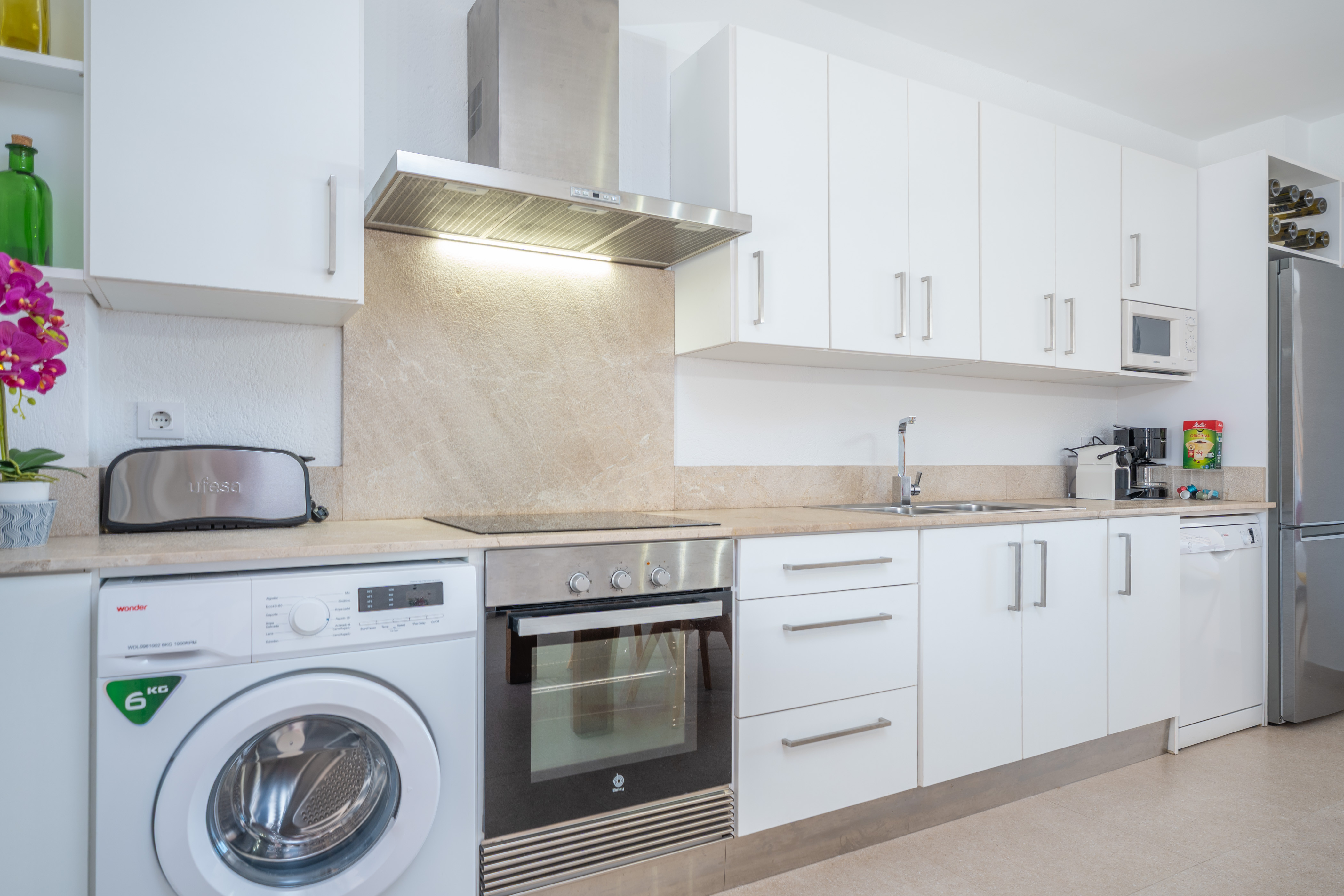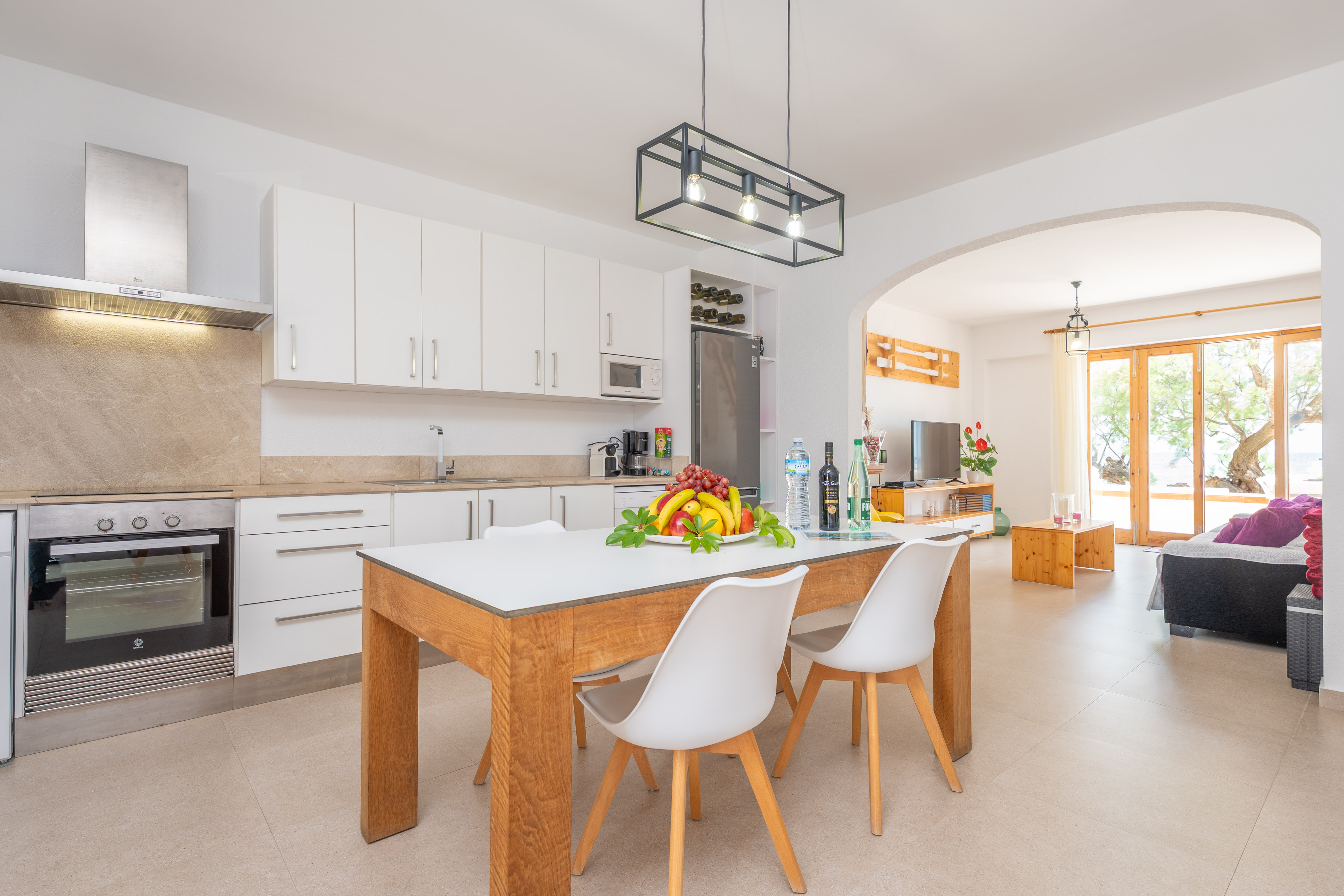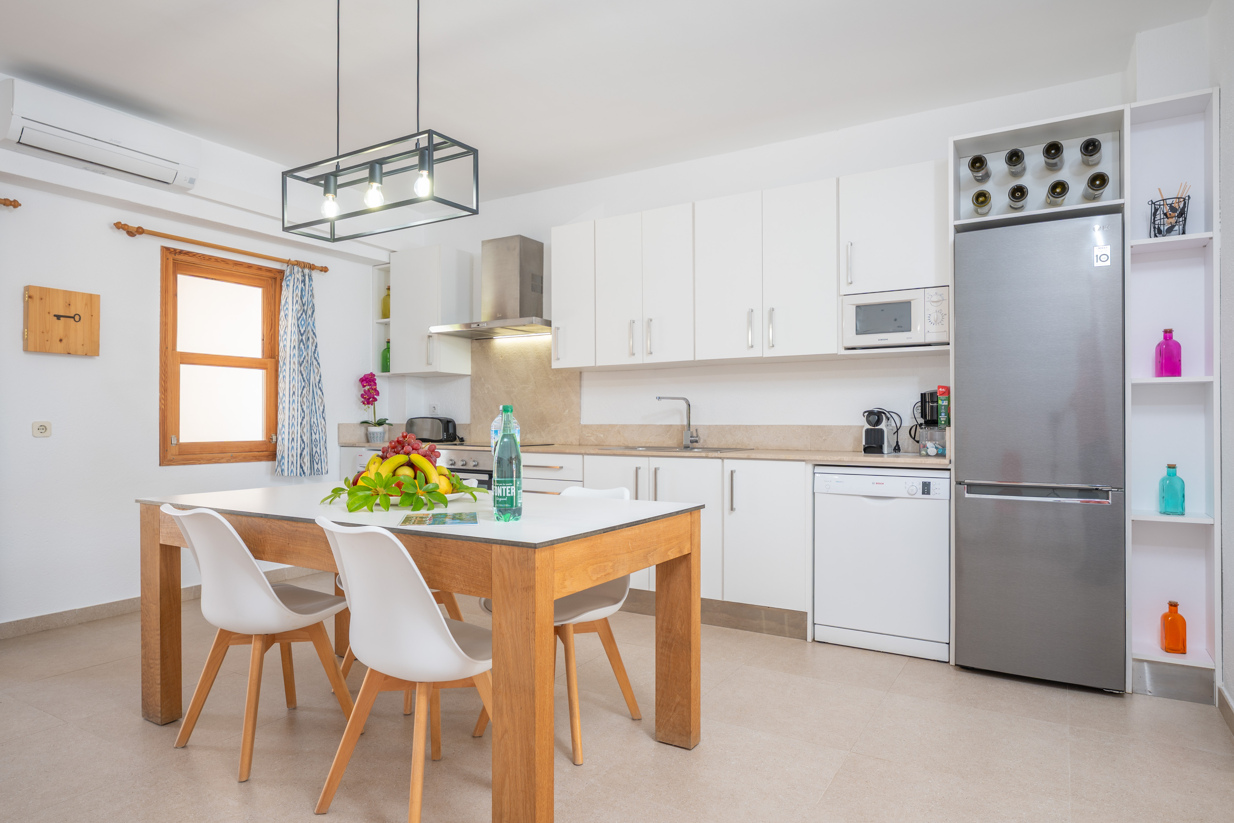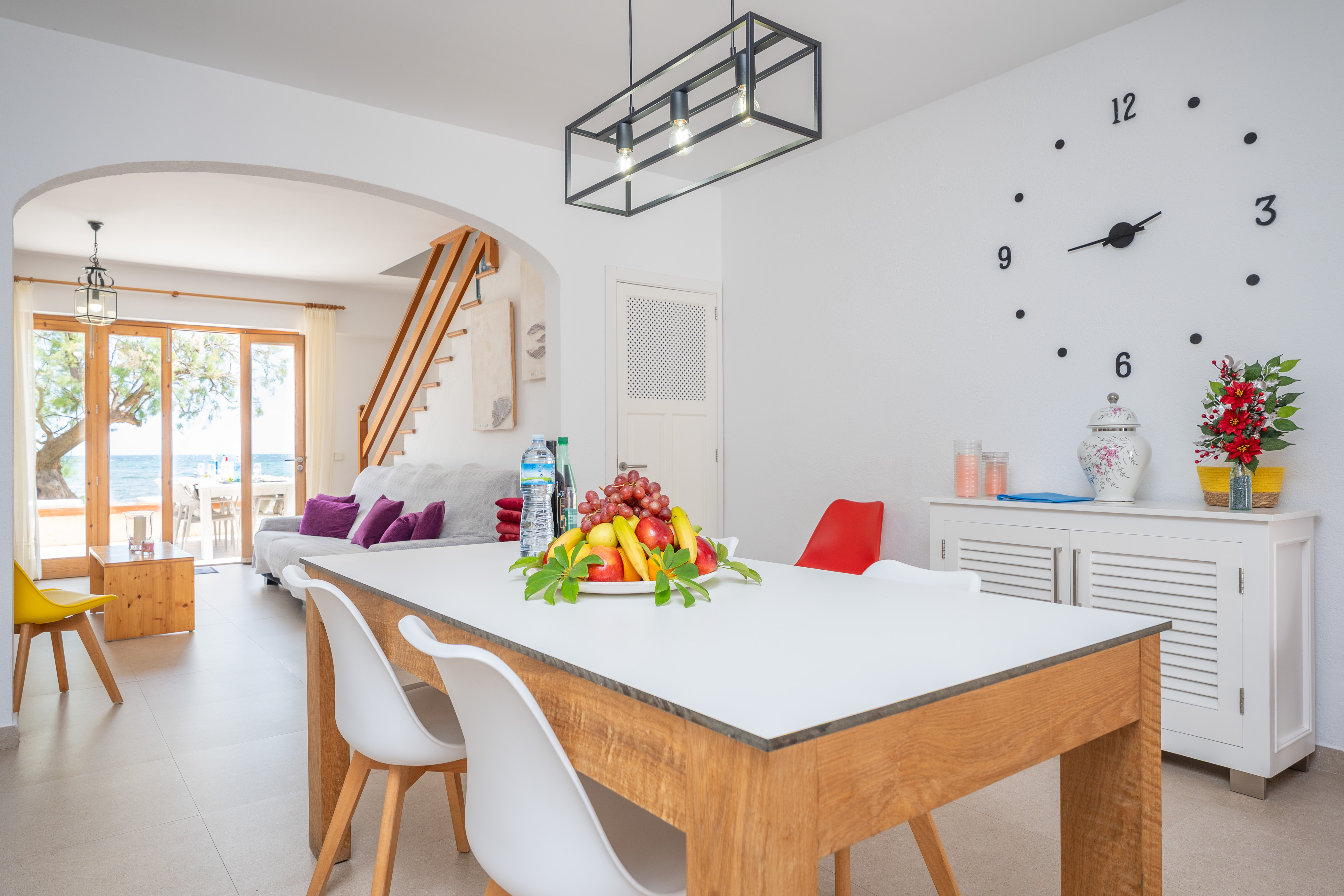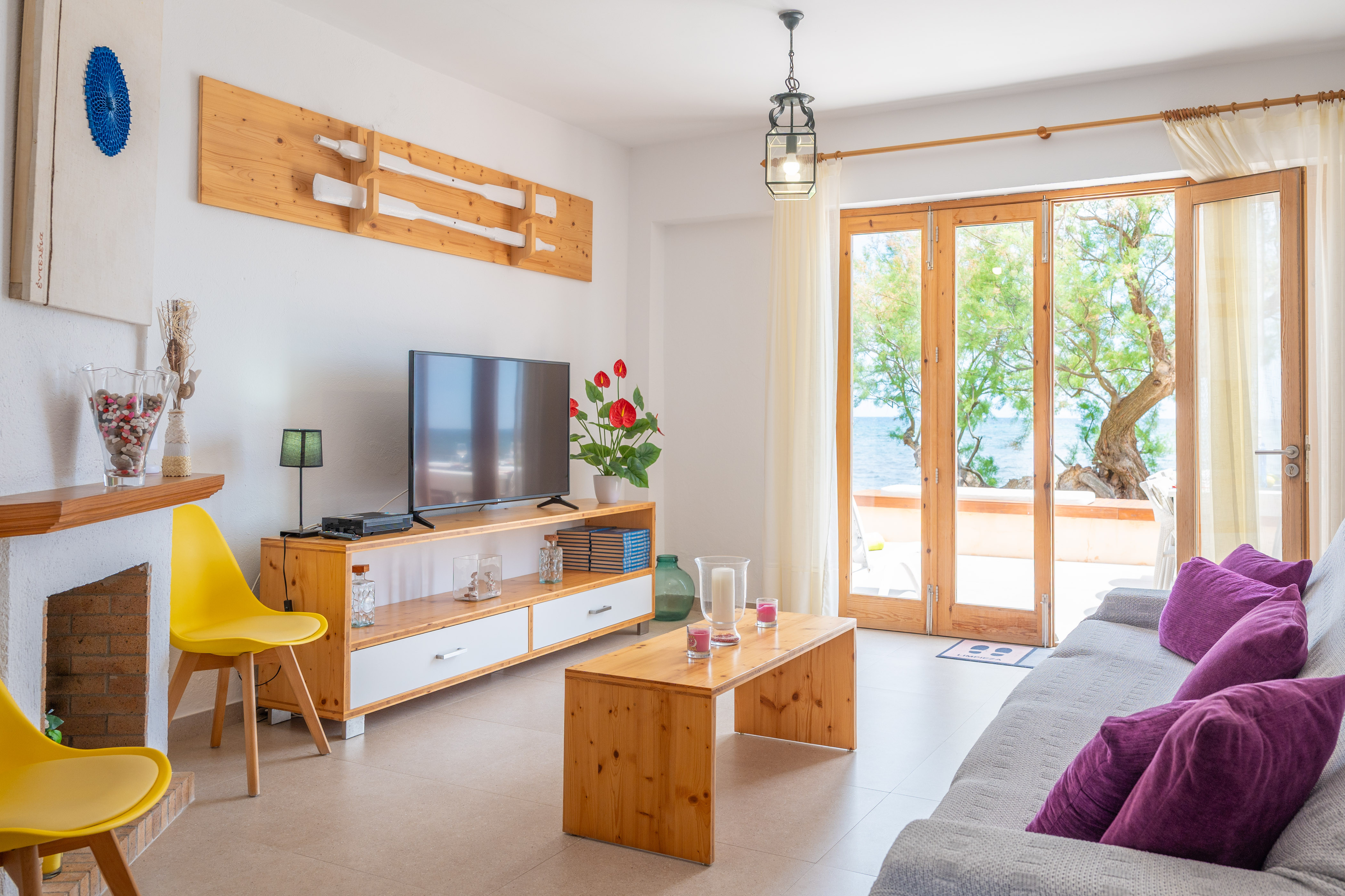 Het fantastische huis met twee verdiepingen wordt gekenmerkt door een warme en eenvoudige stijl, met alles wat je nodig hebt om je thuis te voelen. Op de begane grond vinden we de woonkamer met toegang tot het terras met uitzicht op het strand, met een Smart TV en kanalen in het Duits, Engels en Frans. Een boog scheidt deze kamer van de keuken-eetkamer met een keramische kookplaat. Op deze verdieping is er ook een buitenbadkamer met een douche. Op de eerste verdieping vindt u de 3 slaapkamers met twee aparte bedden. Een AC unit in de verdeler koelt de 3 slaapkamers. Er is nog een badkamer met een bad op deze verdieping. De woning heeft een wasmachine, strijkijzer en strijkplank, en we kunnen ook een kinderbedje en een kinderstoel klaarzetten als u met uw baby reist.