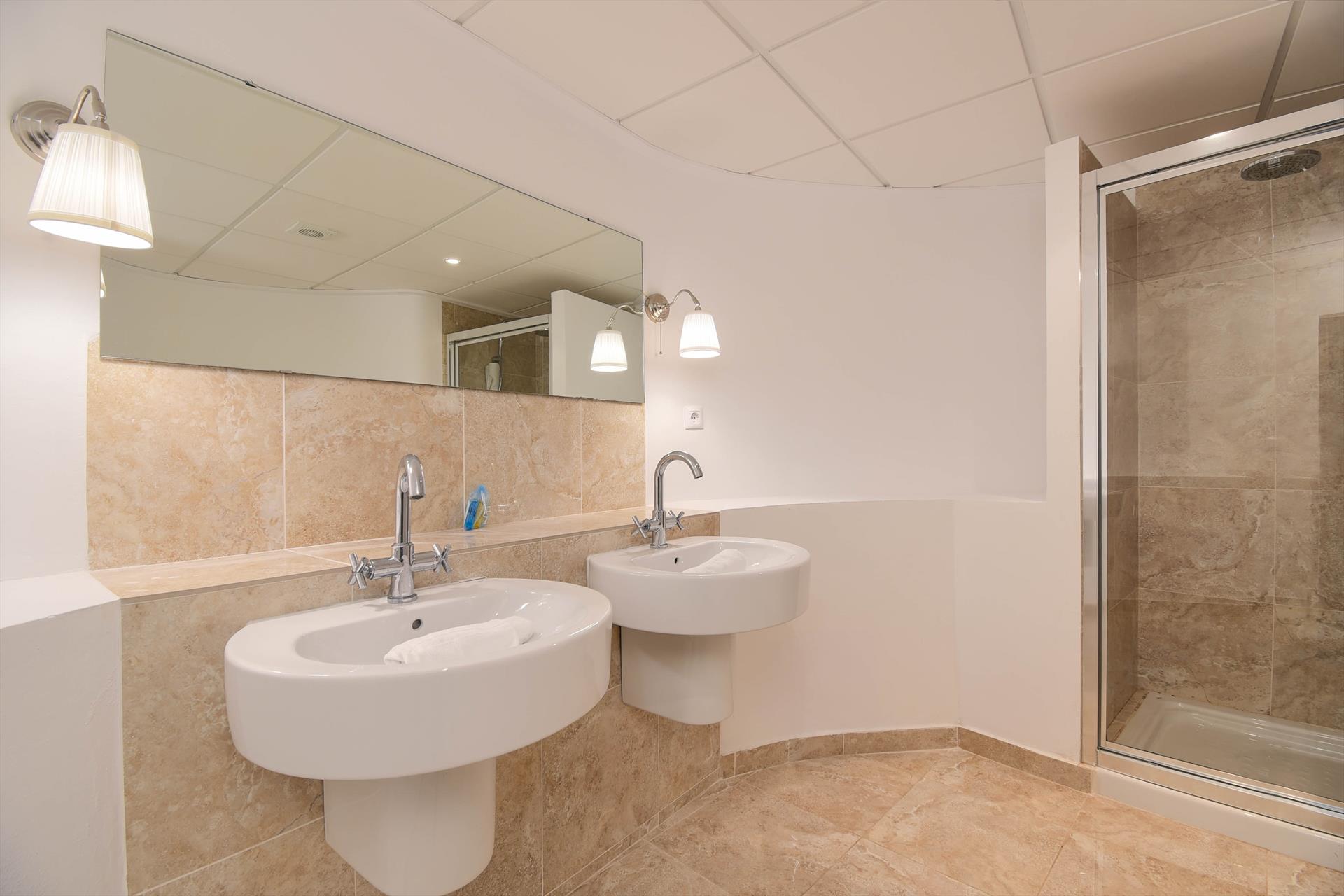 - en-suite badkamer met dubbele wastafel, douche en toilet
