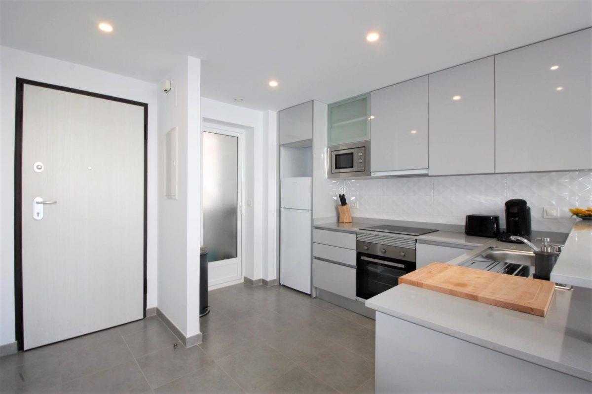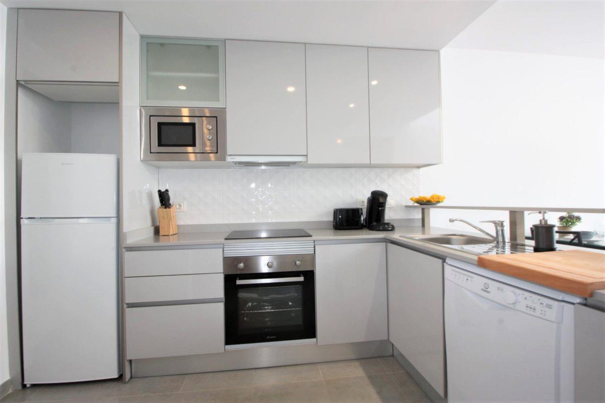 Open keuken met elektrisch kookplaat, elektrische oven, magnetron, vaatwasser, koel-vriescombinatie, koffiezetapparaat, mixer, broodrooster en sapcentrifuge