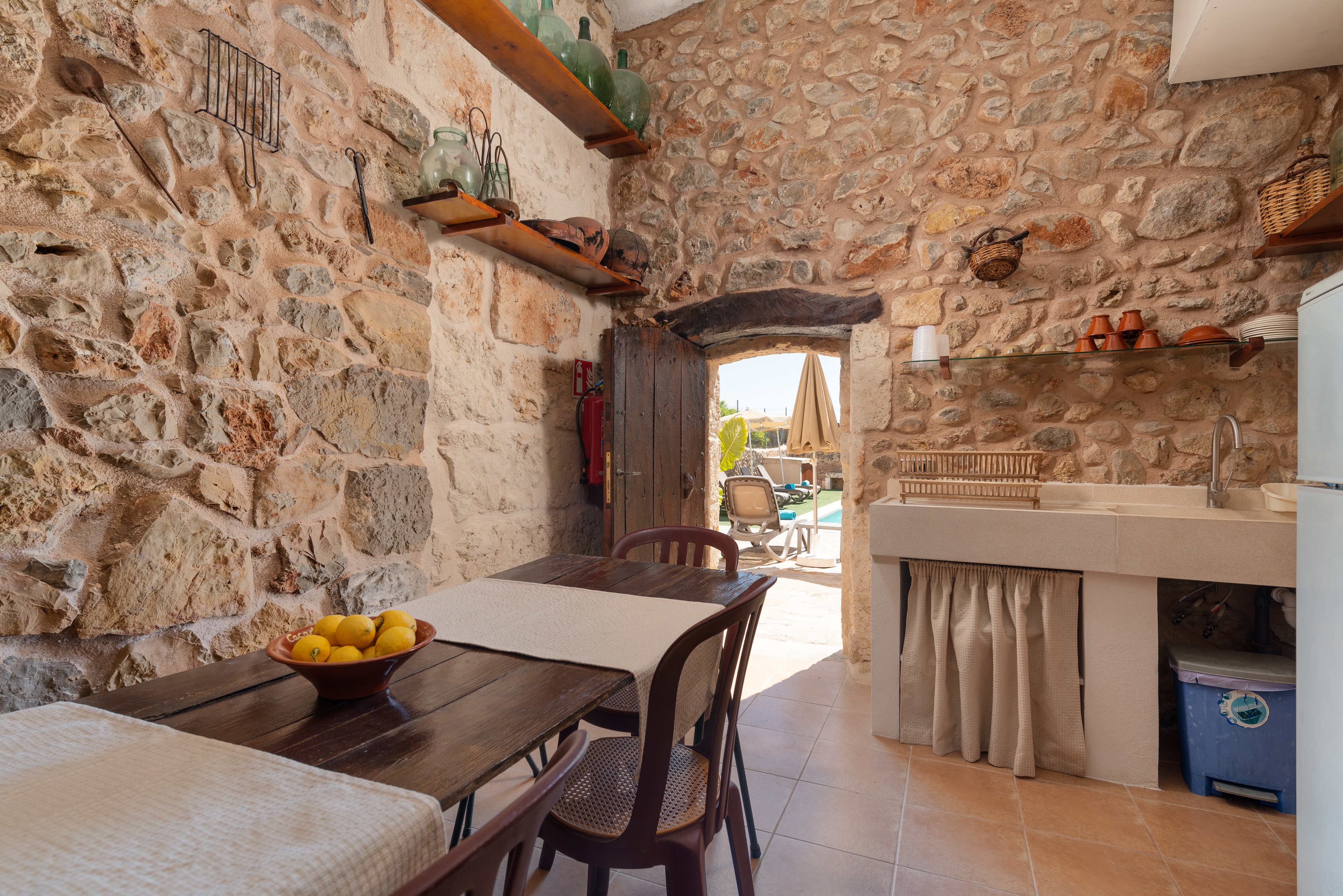 Het huis heeft drie verdiepingen. Bij binnenkomst vanaf de straat vind je een grote woonkamer met satelliettelevisie. Deze opent na een grote boog in Mallorcaanse stijl naar de keuken-eetkamer, uitgerust met keramische kookplaat, industriële apparatuur, airconditioning en toegang tot het terras. Verder is er een badkamer met douche. Via de trap naar boven, op de eerste verdieping, zijn er drie slaapkamers en een badkamer met douche. Alle slaapkamers zijn uitgerust met een kledingkast en airconditioning, een van hen heeft twee eenpersoonsbedden en de rest heeft een tweepersoonsbed. Er staat een kinderbedje en een kinderstoel tot je beschikking, evenals een wasmachine, strijkijzer en strijkplank. Op de -1e verdieping, waar zich het zwembad bevindt, heb je een speelkamer en een eetruimte met een koelkast en een gootsteen, wat je het gevoel geeft in mooie kleine grotten te zijn.