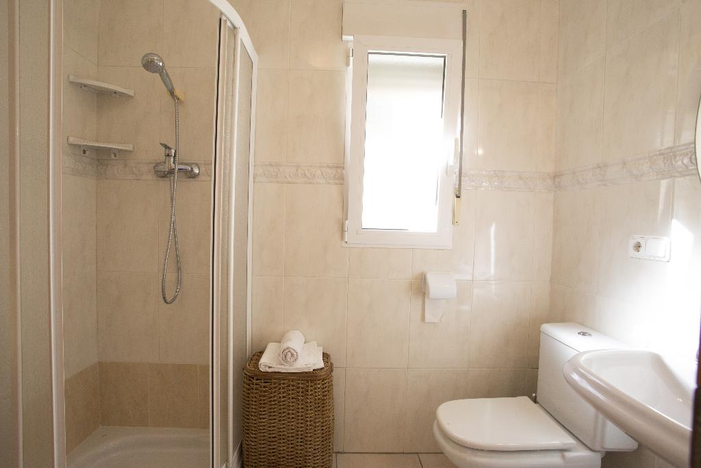 - badkamer met dubbele wastafel, douche en toilet