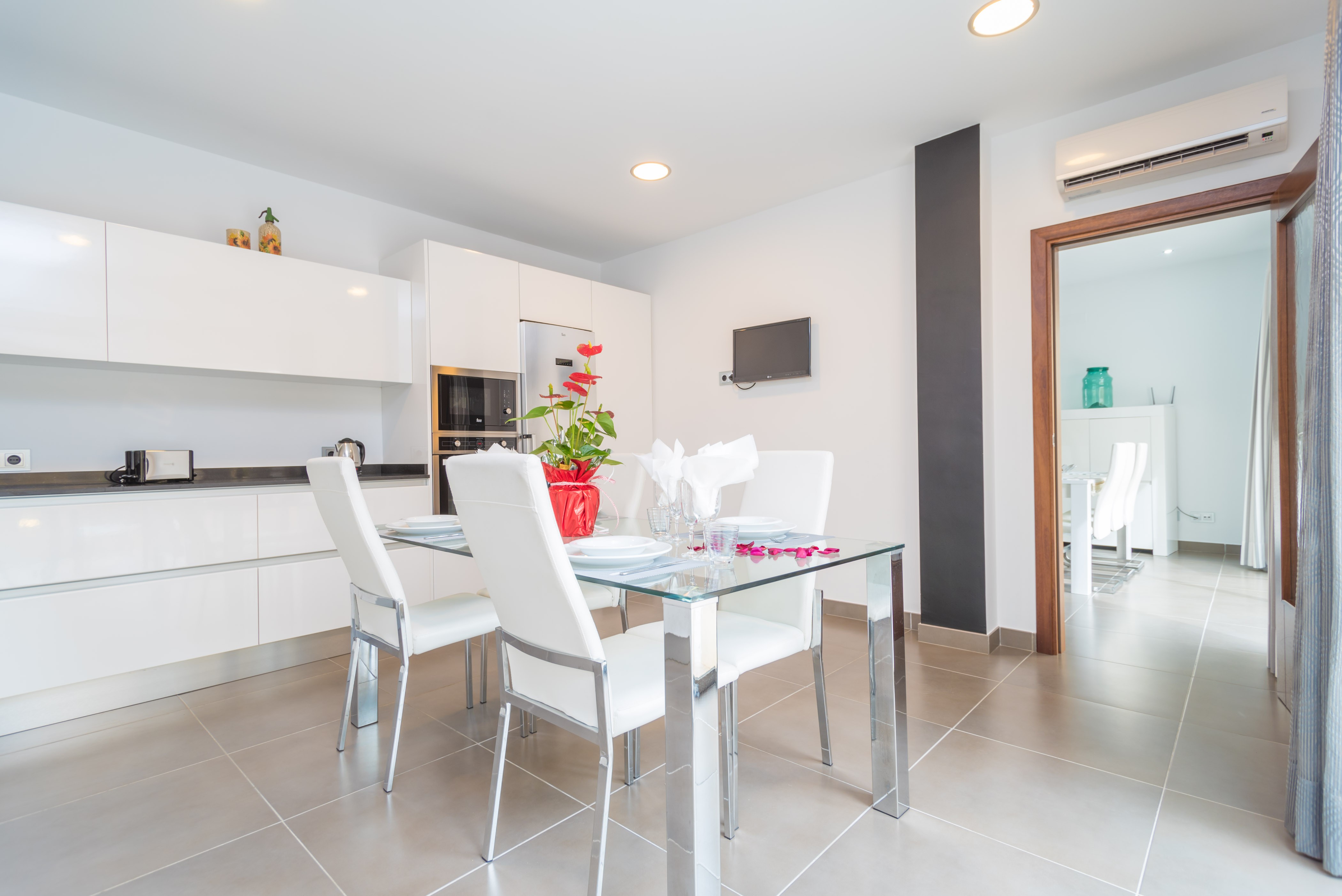 Achter een grote glazen schuifdeur komt u direct in de keuken, de droom van iedere amateurkok. Het heeft een keramische kookplaat, airconditioning en ruimte om te zitten en een aperitiefje te nuttigen terwijl u uw beste recepten kookt. De woonkamer, ook voorzien van airconditioning, die uitkomt op de eettafel, is voorzien van een comfortabele chaise longue-bank waar u een interessante film op de satelliet-tv kunt kijken of een tijdje kunt lezen als u een interessant boek op de plank vindt. De slaapkamer heeft een tweepersoonsbed, kastruimte voor een kinderbedje en een kinderstoel en een en-suite badkamer met douche en ligbad. Er is een tweede badkamer met douche, waar u ook de wasmachine en de droger, het strijkijzer en de strijkplank buiten vindt. We kunnen een ventilator en teenradiatoren leveren, voor het geval dat nodig is.