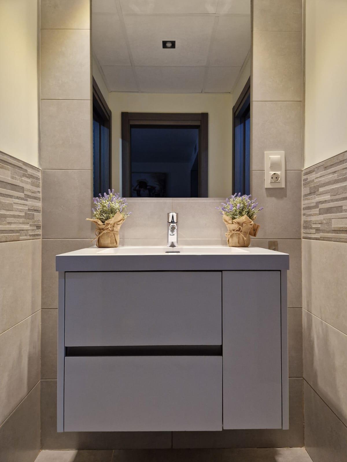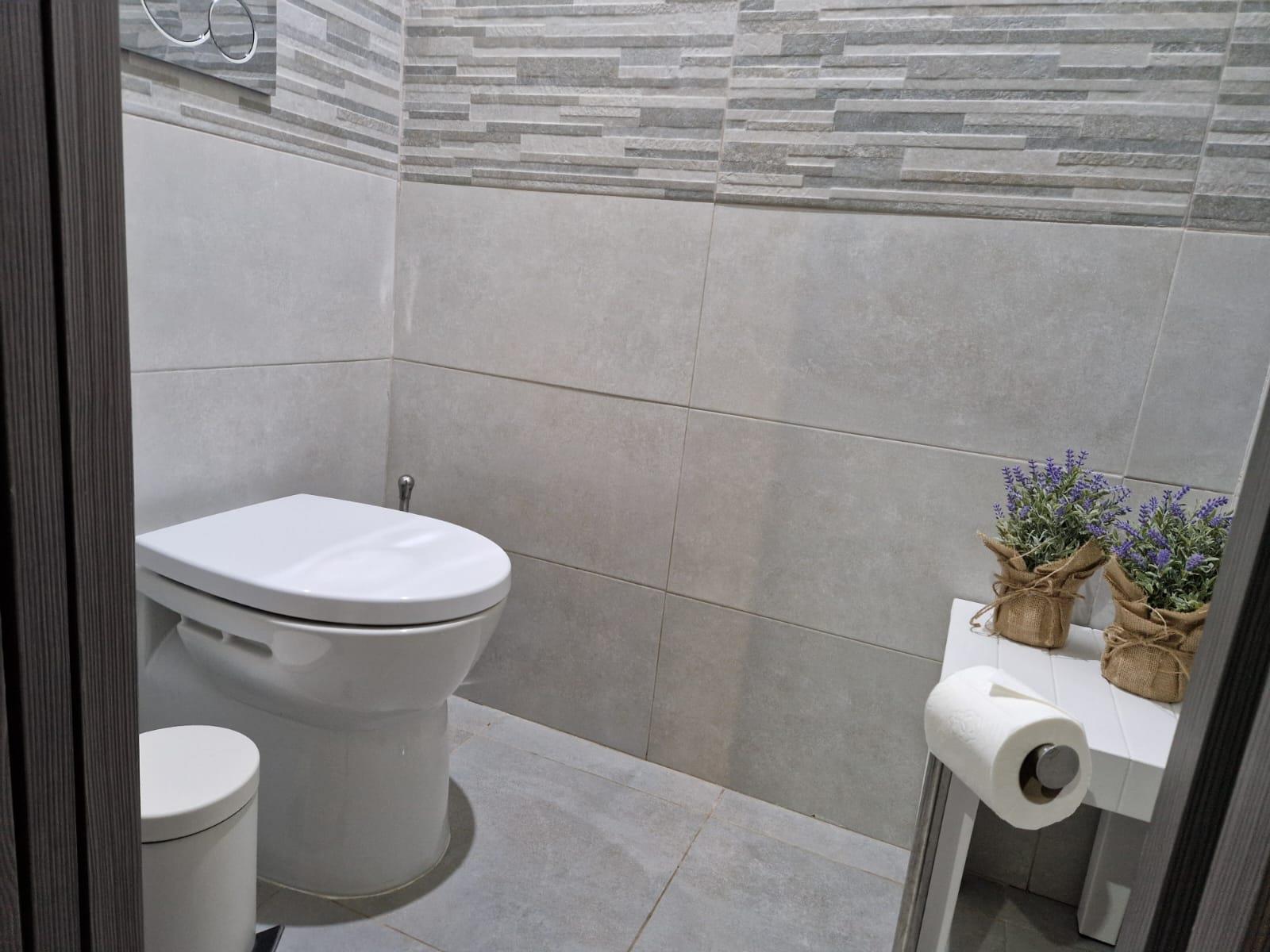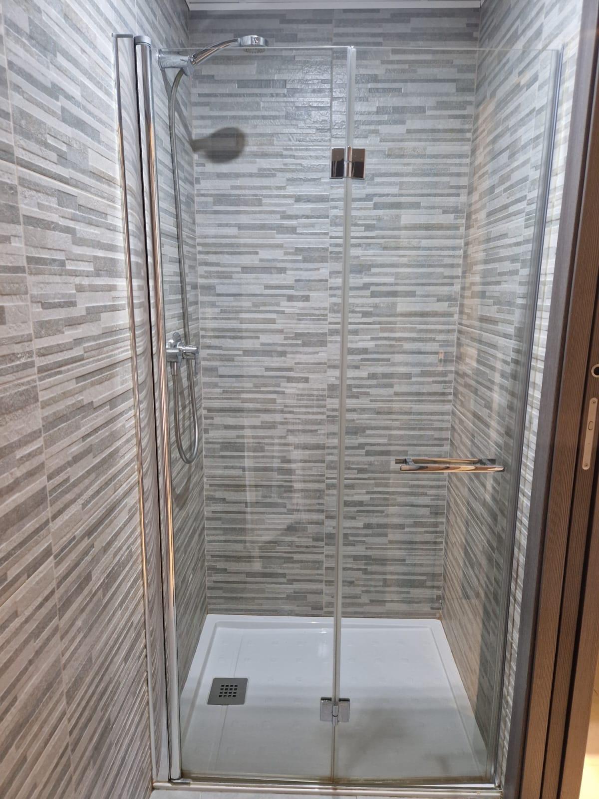 En-suite badkamer met wastafel, douche, toilet en haardroger