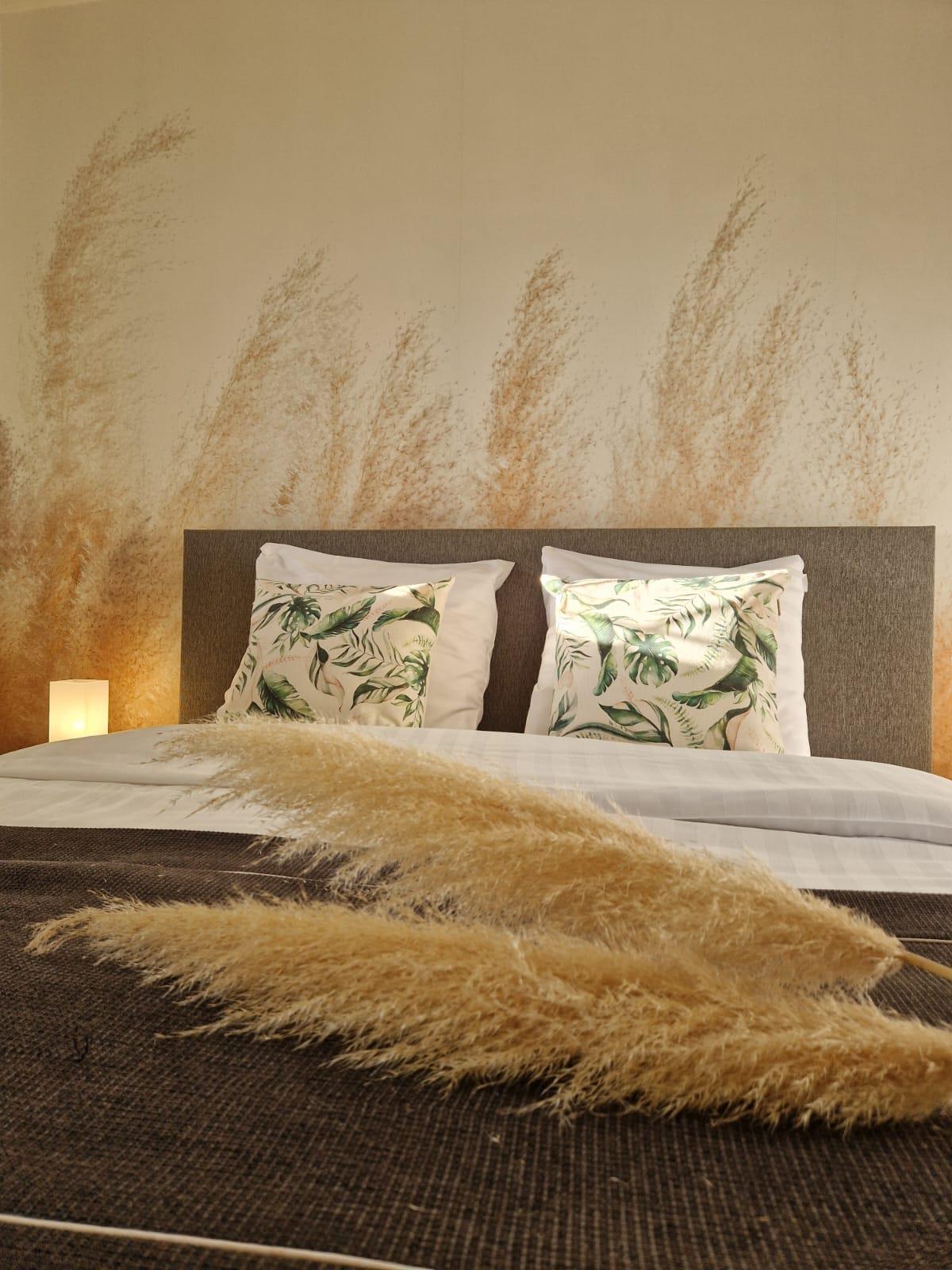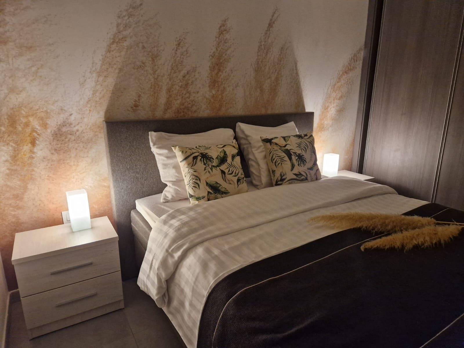Slaapkamer met airconditioning, queensize bed (200 x 160 cm) en en-suite badkamer