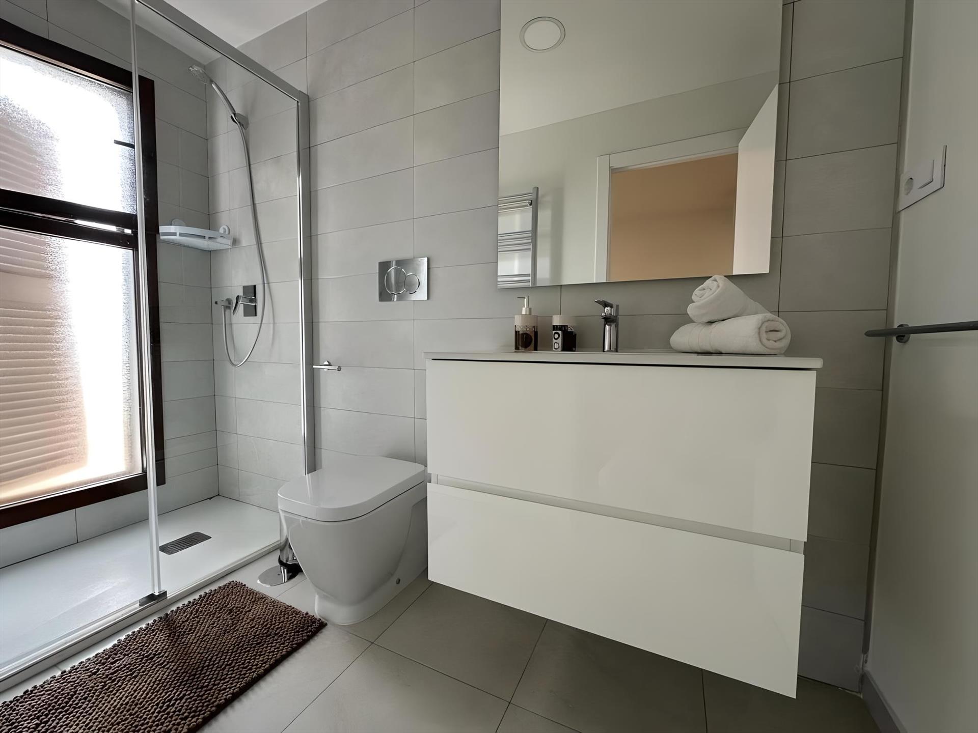 En-suite badkamer met enkele wastafel, douche, toilet en föhn