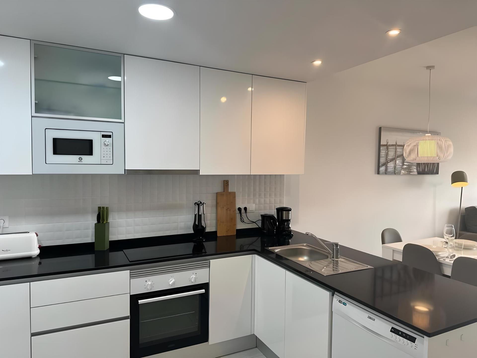 Open keuken met elektrische kookplaat, elektrische oven, magnetron, vaatwasser, koelkast, koffiezetapparaat, waterkoker, mixer en broodrooster