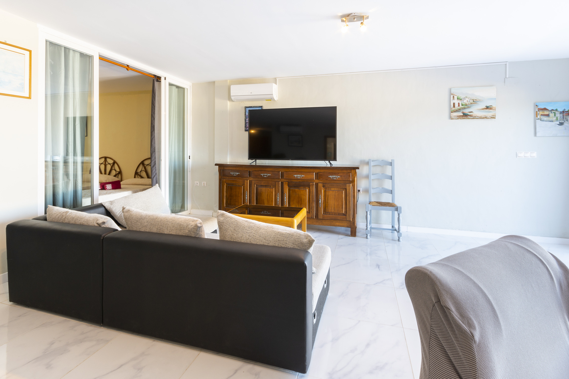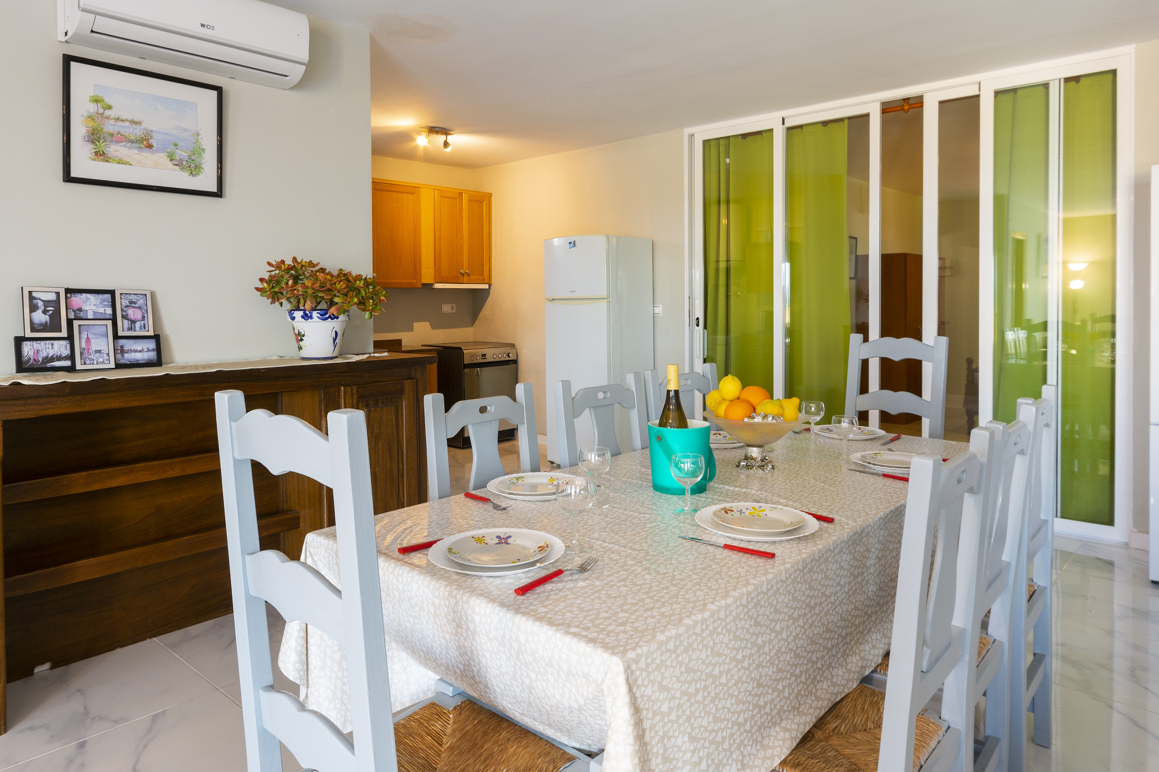 Het appartement op de begane grond heeft een eenvoudige en gezellige stijl. De woon-/eetkamer met airconditioning en Smart TV met satellietzenders staat in open verbinding met de keuken met een keramische kookplaat. In het appartement zijn er 3 slaapkamers: de eerste met een tweepersoonsbed en een plafondventilator; de tweede met een eenpersoonsbed en een tweepersoonsbed; en de laatste met twee eenpersoonsbedden en een tweepersoonsbed en een eigen badkamer met douche. Houd er rekening mee dat deze twee slaapkamers geen ramen hebben, maar via de glazen schuifdeuren licht uit de woonkamer ontvangen. Er is nog een badkamer met douche in de accommodatie. Een wasmachine, strijkijzer en strijkplank, evenals een kinderbedje en een kinderstoel als u met uw baby reist, maken de accommodatie compleet.