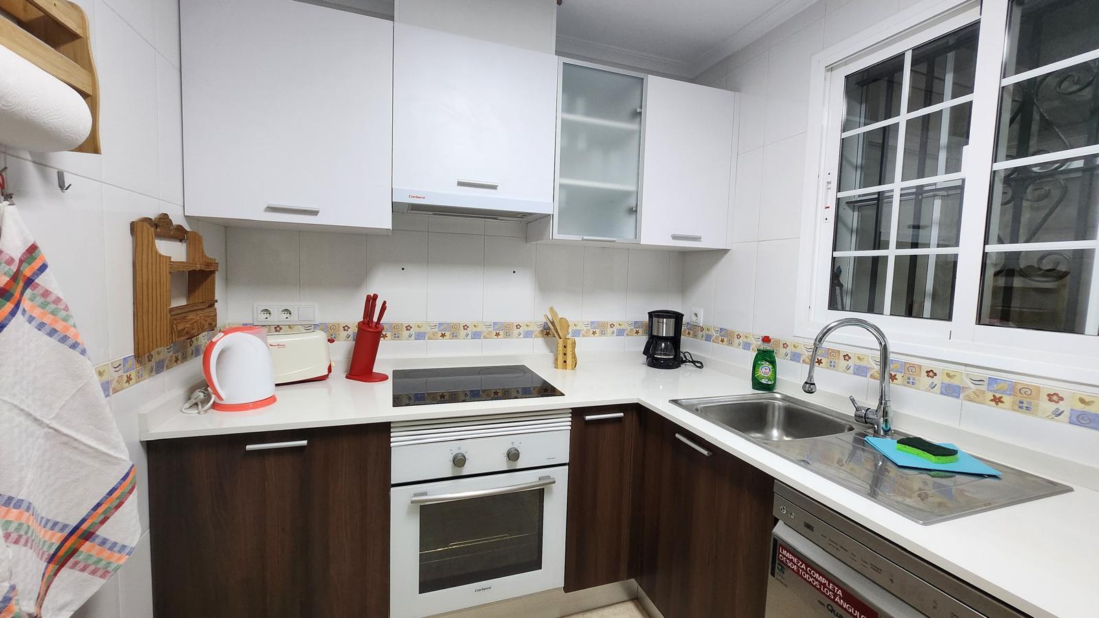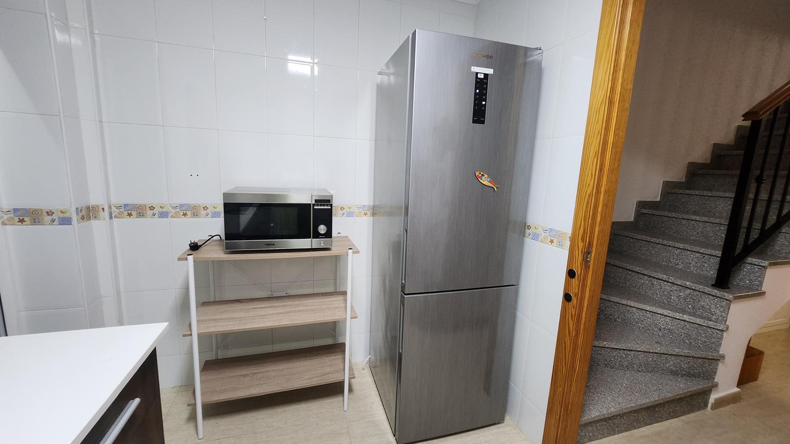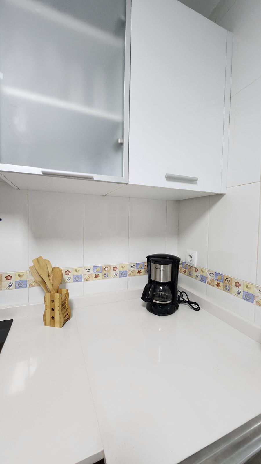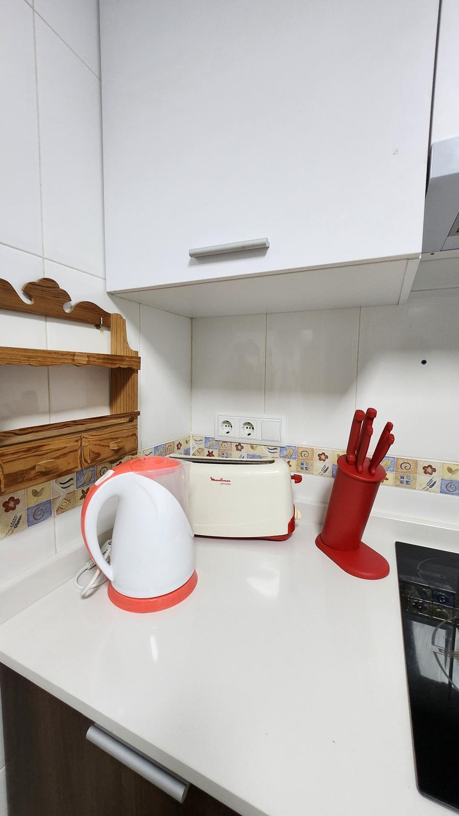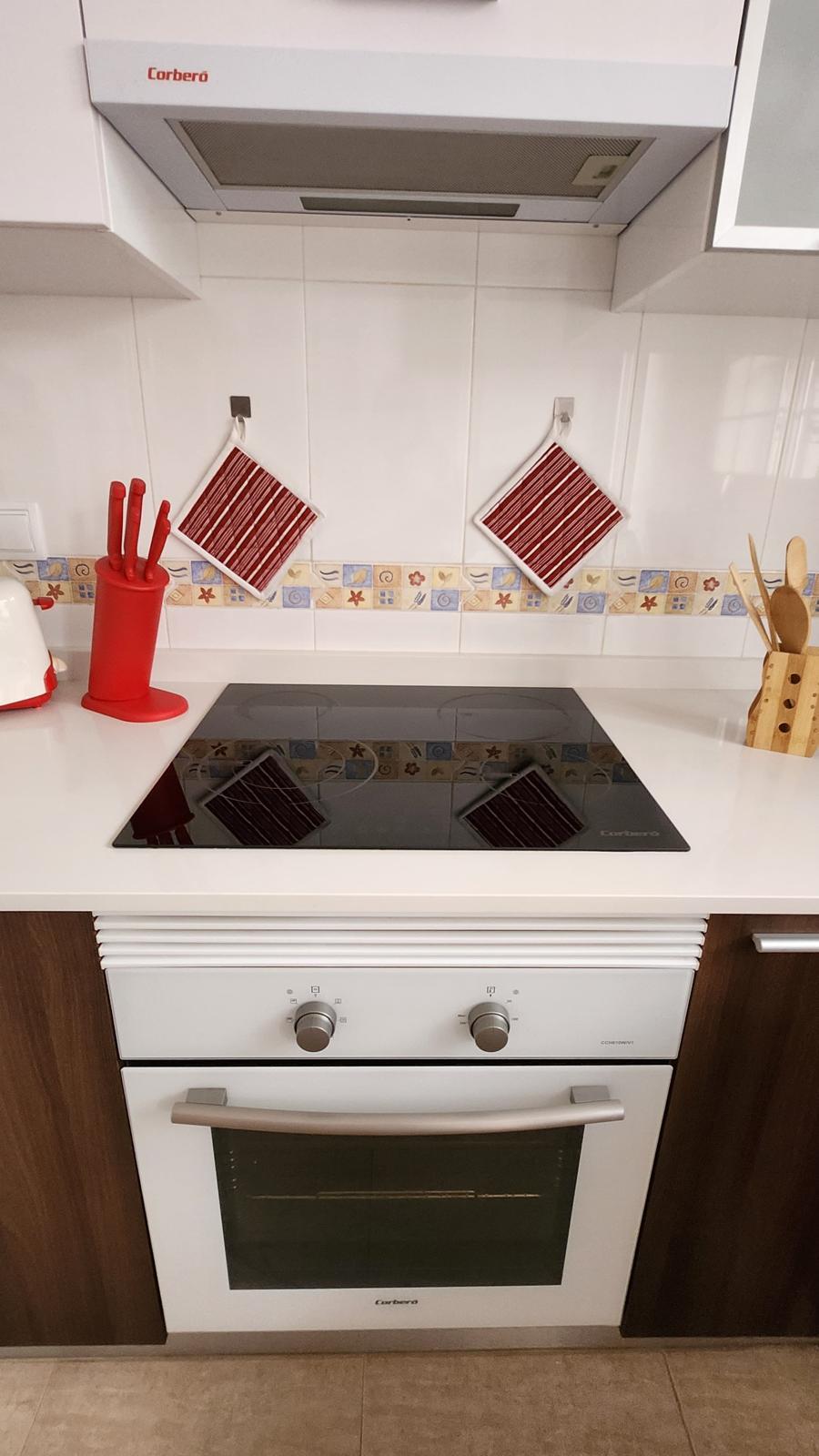 Keuken met elektrische kookplaat, elektrische oven, magnetron, vaatwasser, koel-vriescombinatie, koffiezetapparaat, waterkoker, broodrooster en citruspers