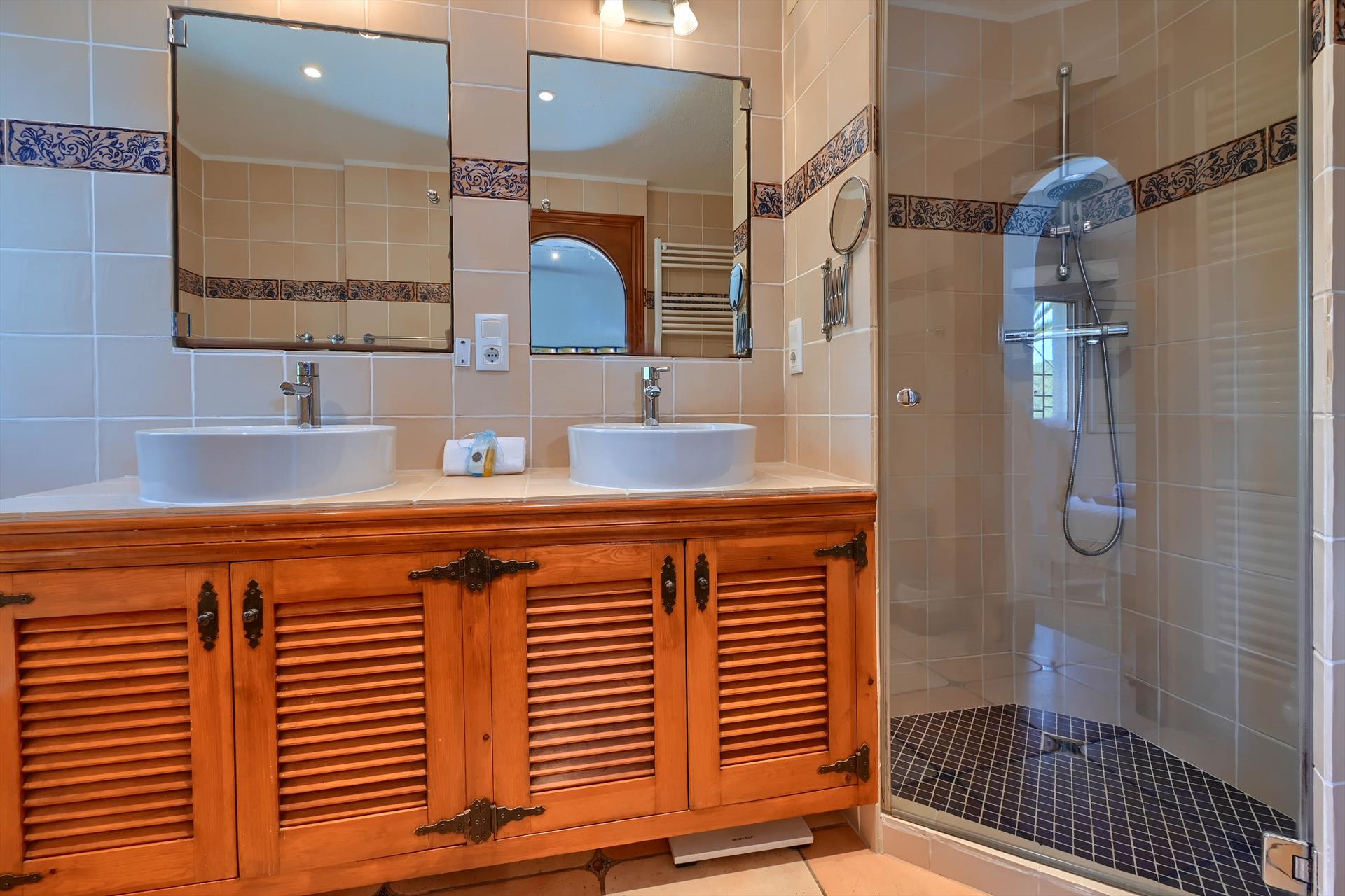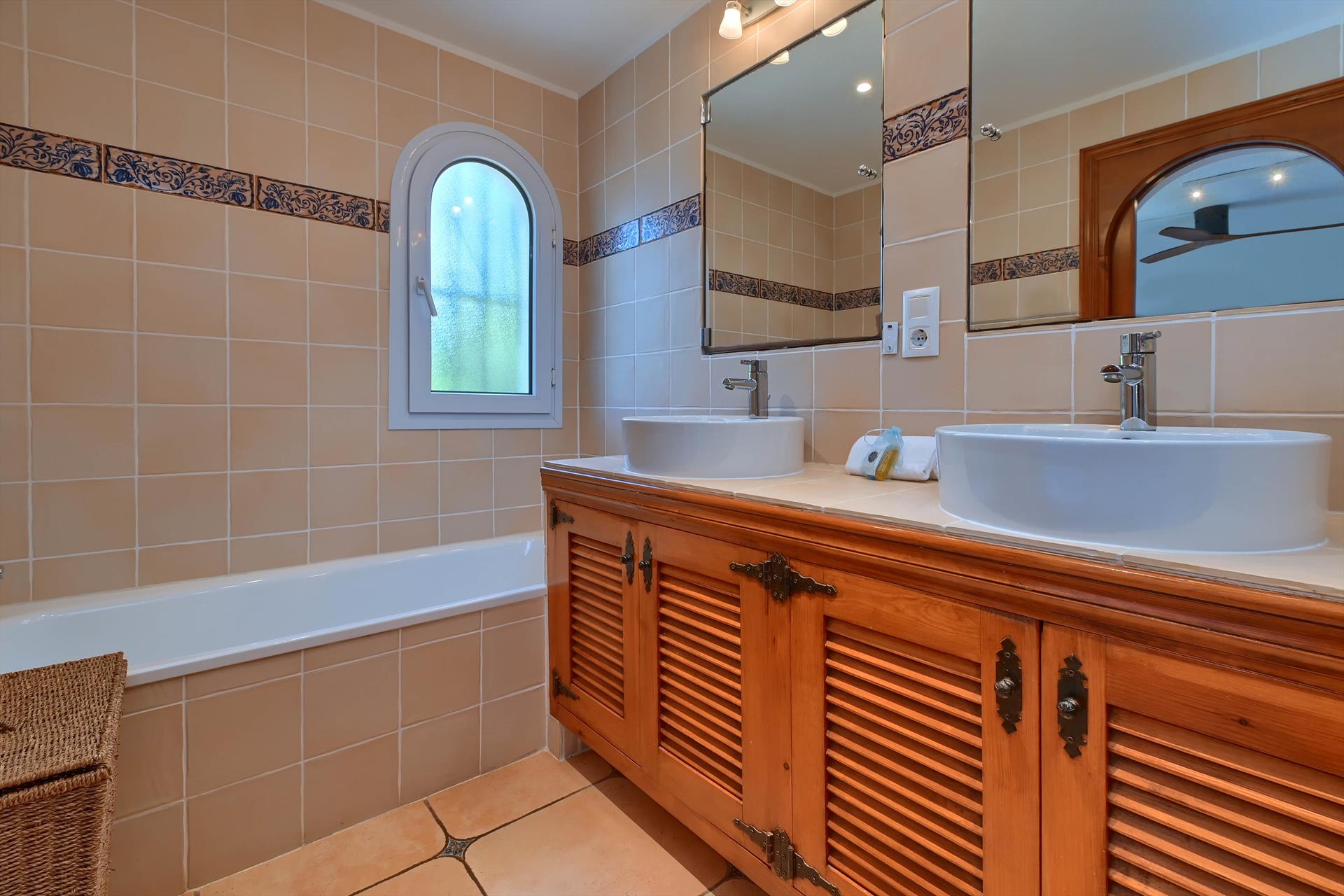 - en-suite badkamer met dubbele wastafel, ligbad, douche en toilet