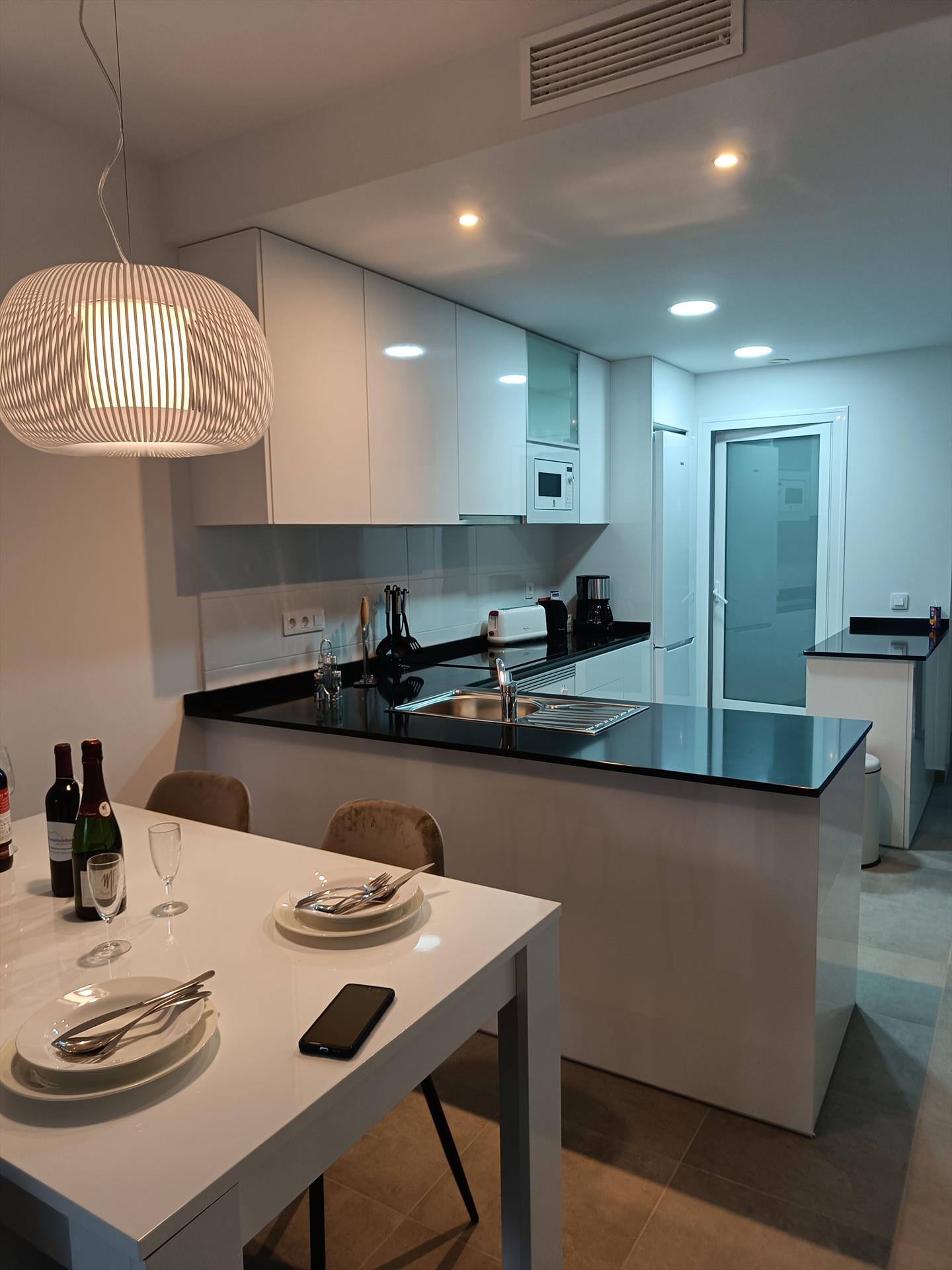 Open keuken met inductiekookplaat, elektrische oven, magnetron, vaatwasser, koel-vriescombinatie, koffiezetapparaat, waterkoker, broodrooster en citruspers